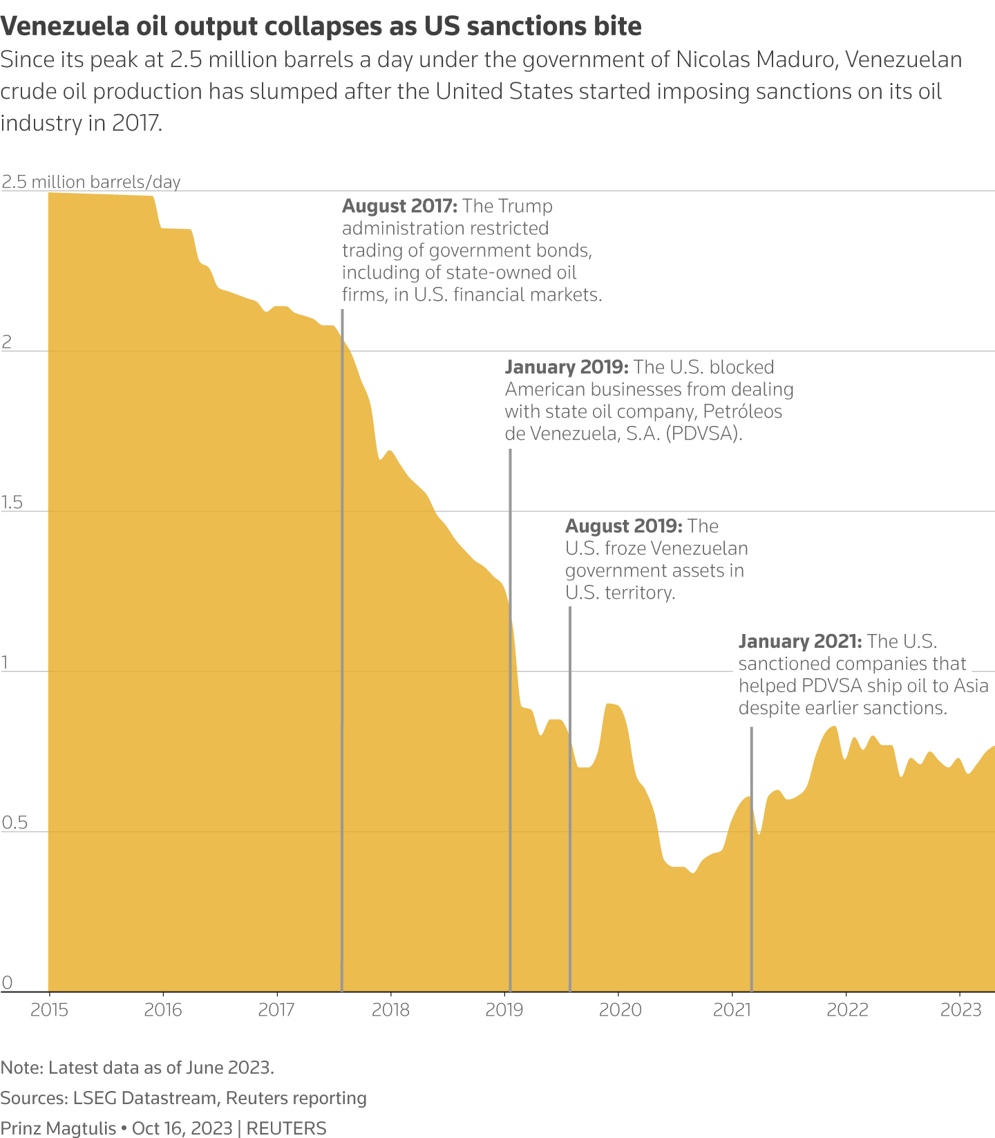 特朗普时代制裁的回滚,美国官员发布了委内瑞拉石油、天然气和矿业部门的一般许可证,以回应委内瑞拉总统尼古拉斯·马杜罗与该国反对派就2024年总统选举达成的协议。