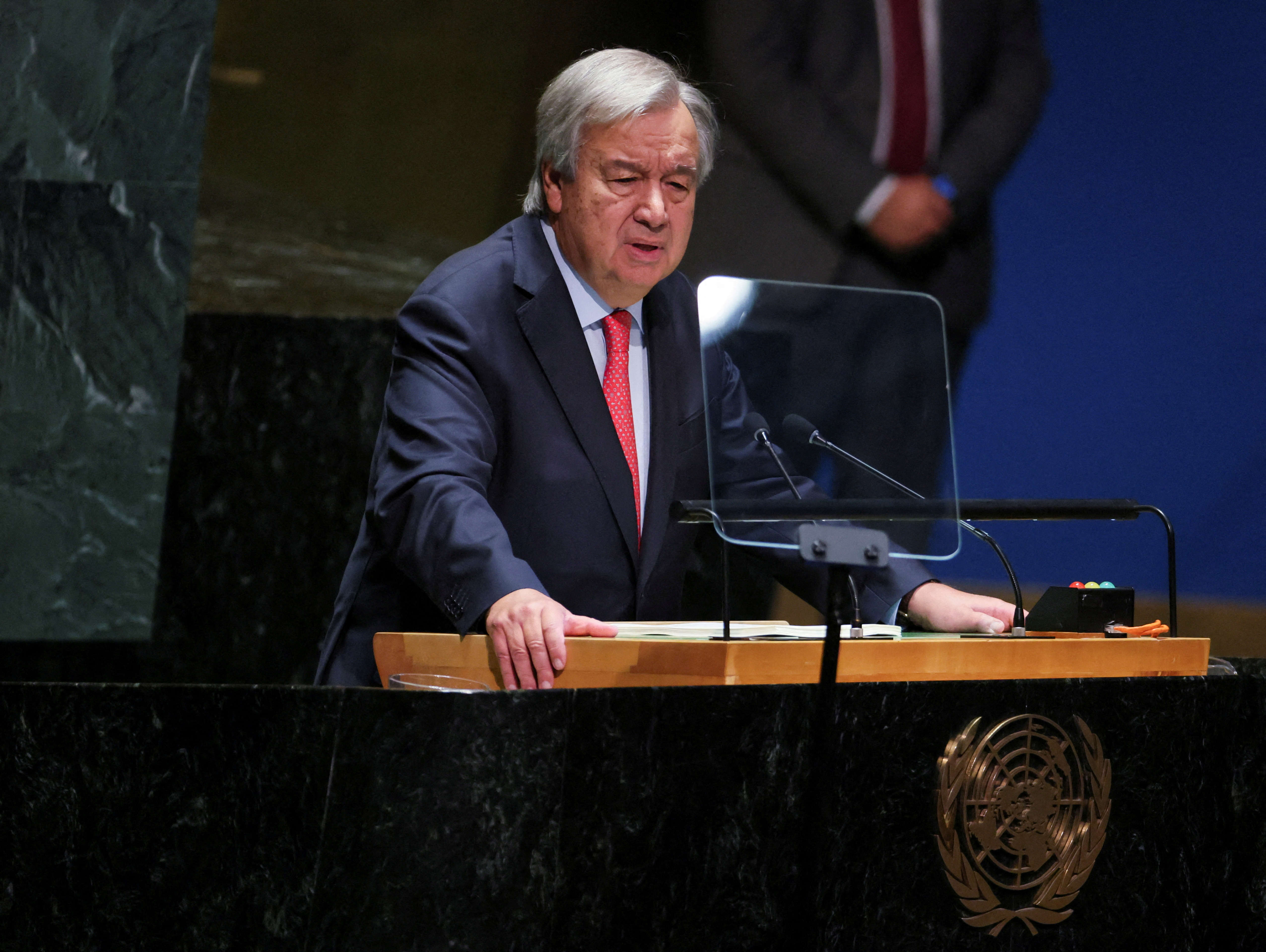 联合国秘书长安东尼奥·古特雷斯在2023年9月19日美国纽约联合国大会第78届会议上讲话。路透社/Brendan McDermid/文件照片