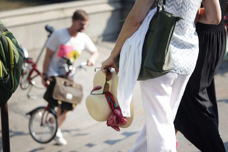 一名女子在2023年9月7日英国伦敦携带一顶遮阳帽。路透社/安娜·戈登摄