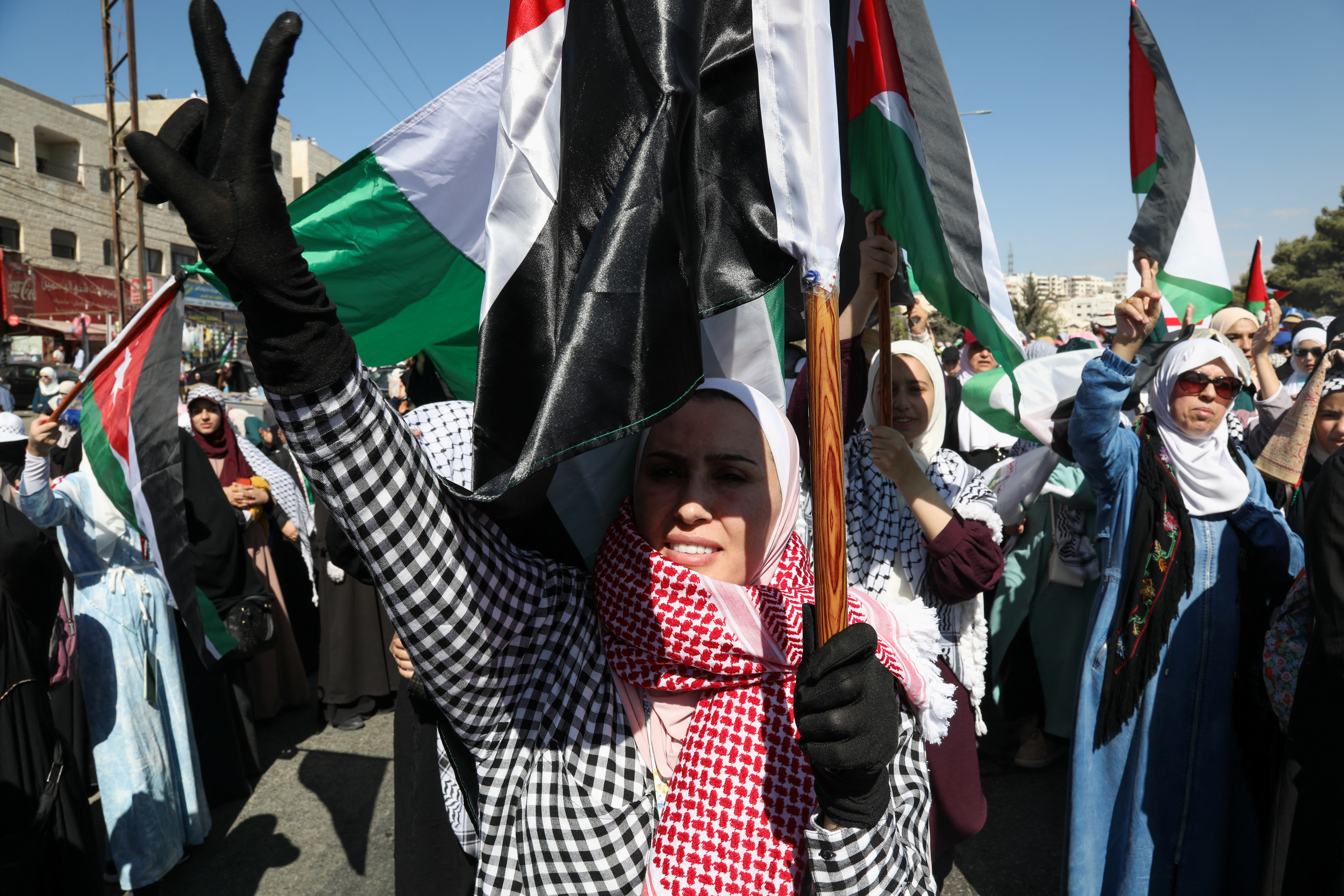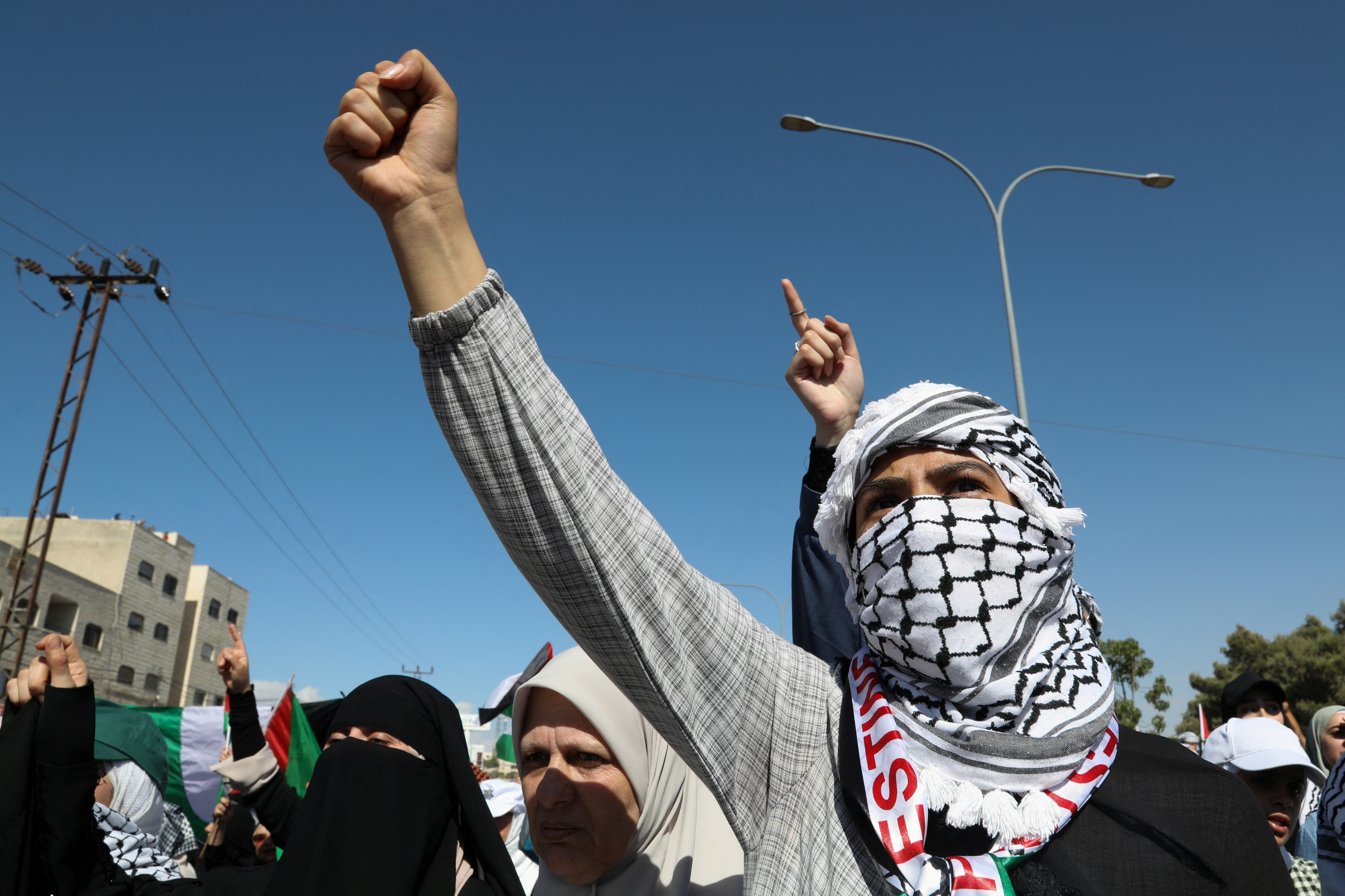 在南部城市卡拉克,数百名抗议者聚集在通往边境的公路检查站,高呼支持哈马斯口号。