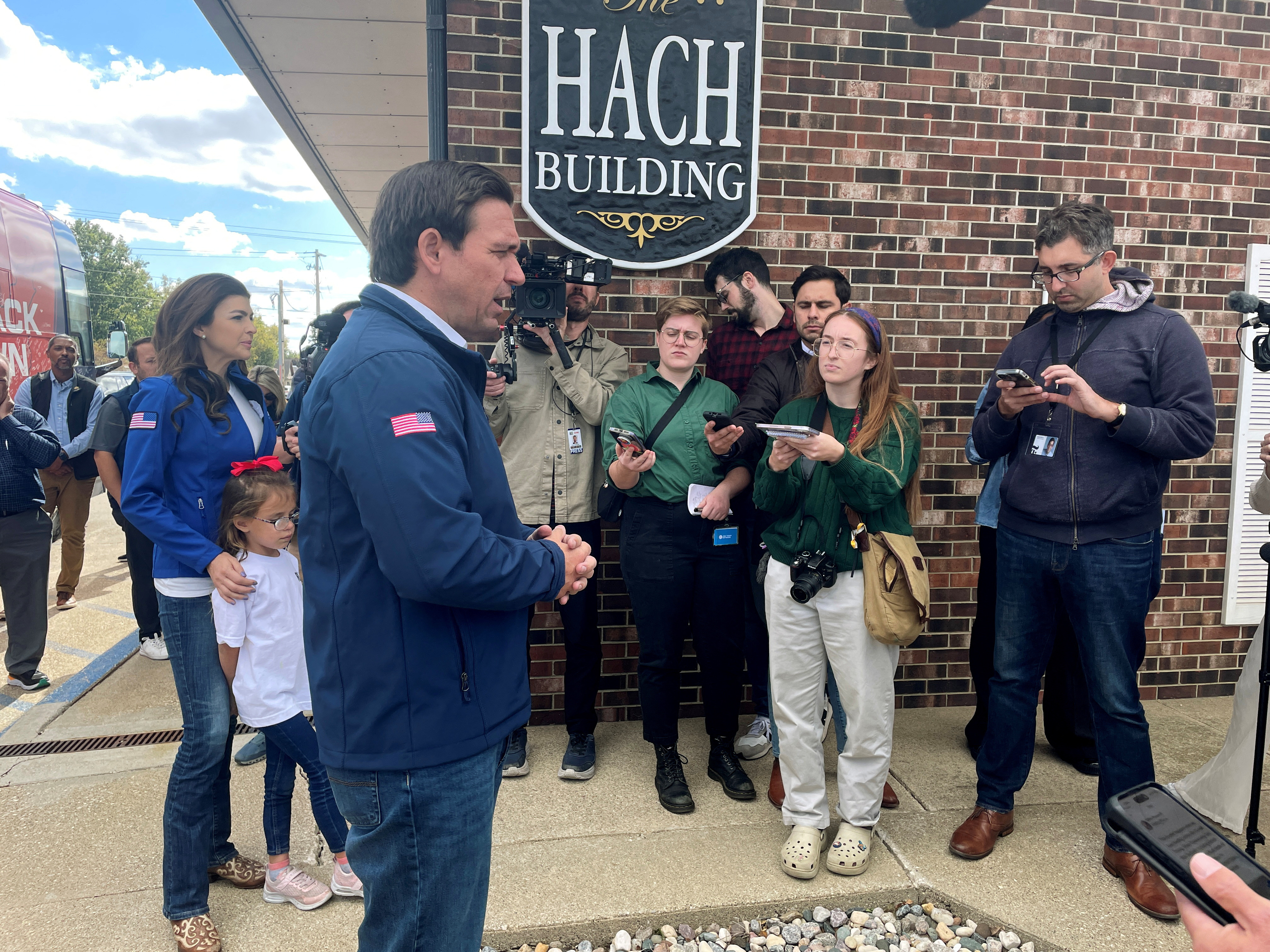 美国总统候选人和佛罗里达州州长罗恩·德桑蒂斯在2023年10月7日于美国爱荷华州斯托姆湖的总统竞选活动中与记者和新闻媒体交谈。路透社/詹姆斯·奥利芬特摄