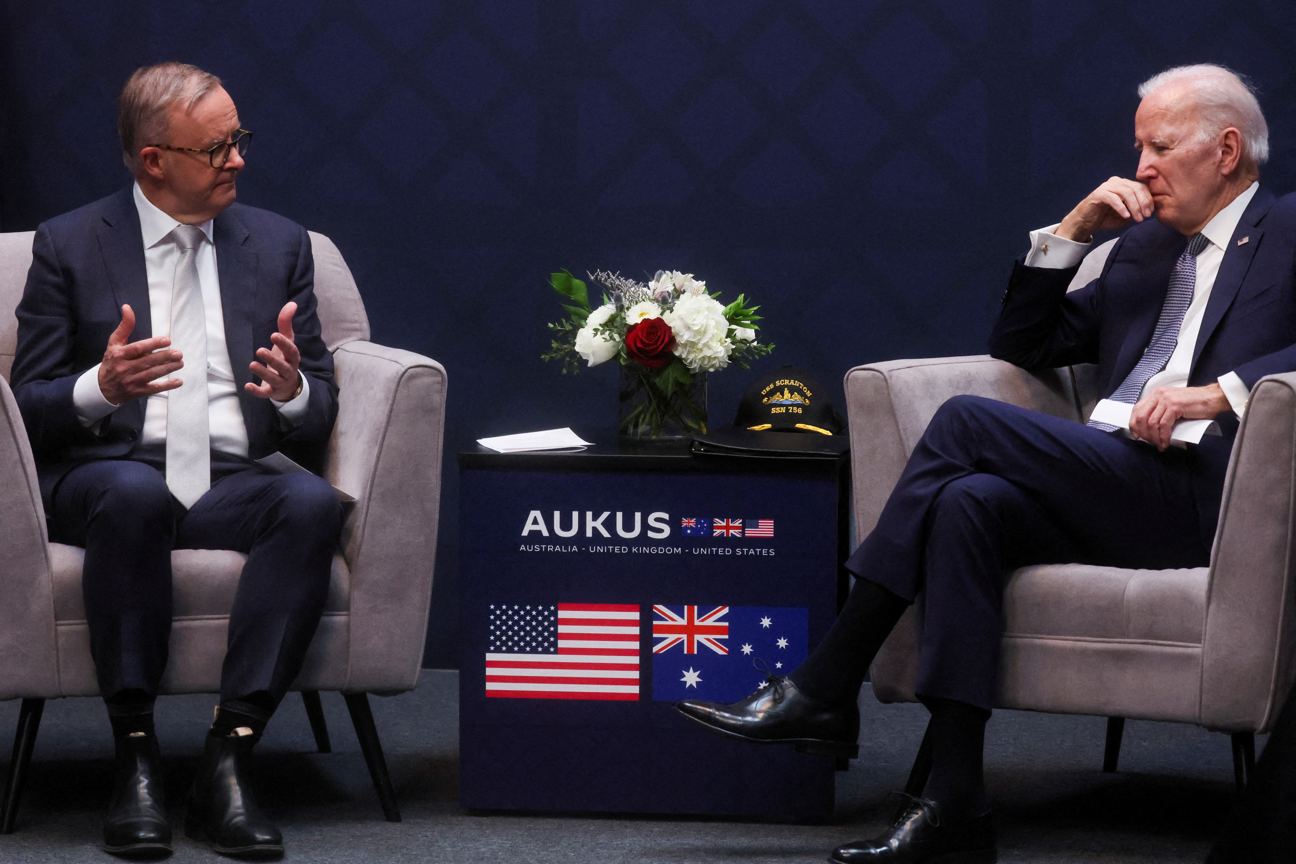 美国总统乔·拜登参加了与澳大利亚总理安东尼·阿尔班尼斯在加利福尼亚州圣迭戈海军门户旅馆和套房举行的双边会议,时间为2023年3月13日。路透社/利亚·米利斯/档案照片