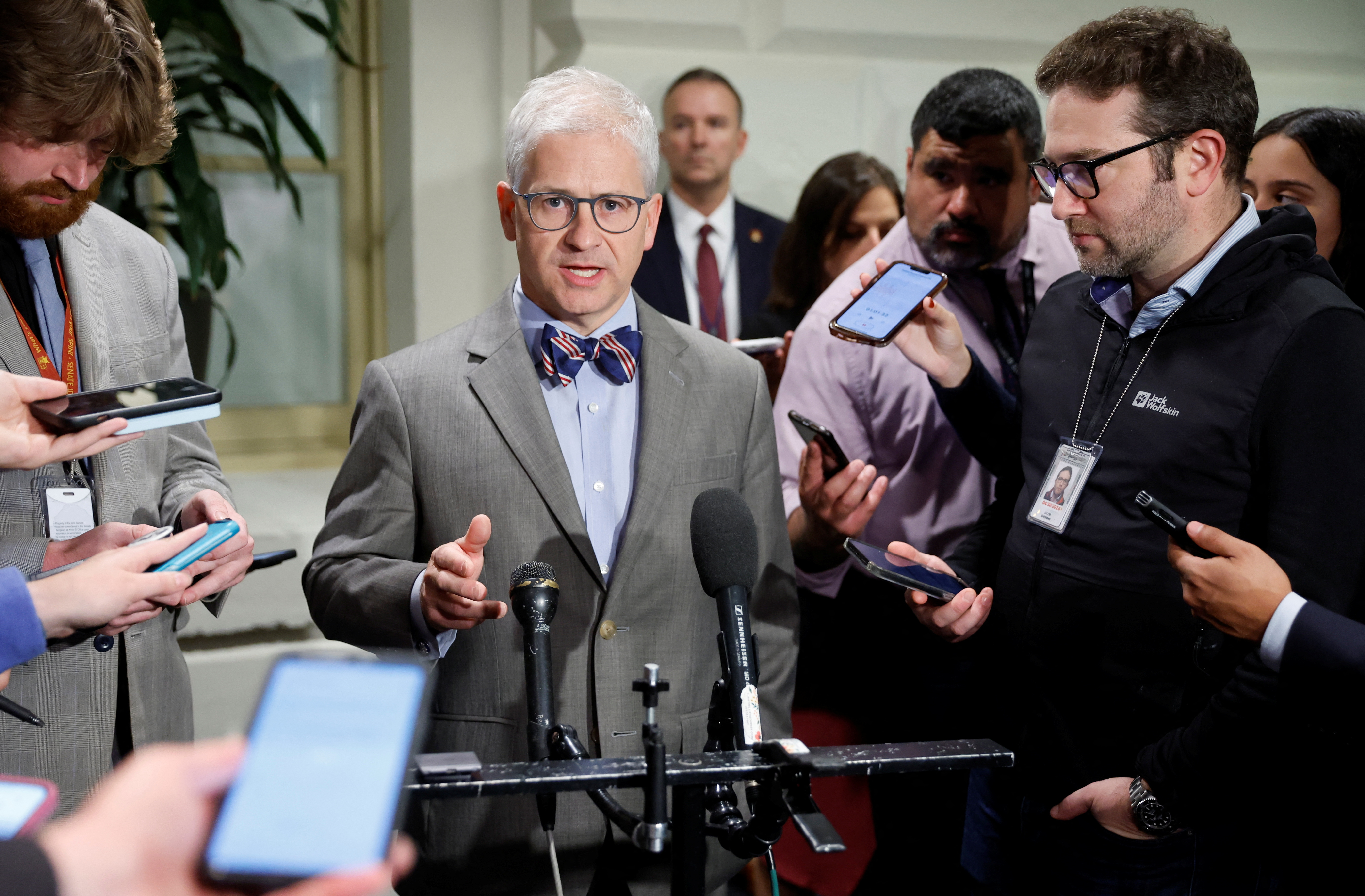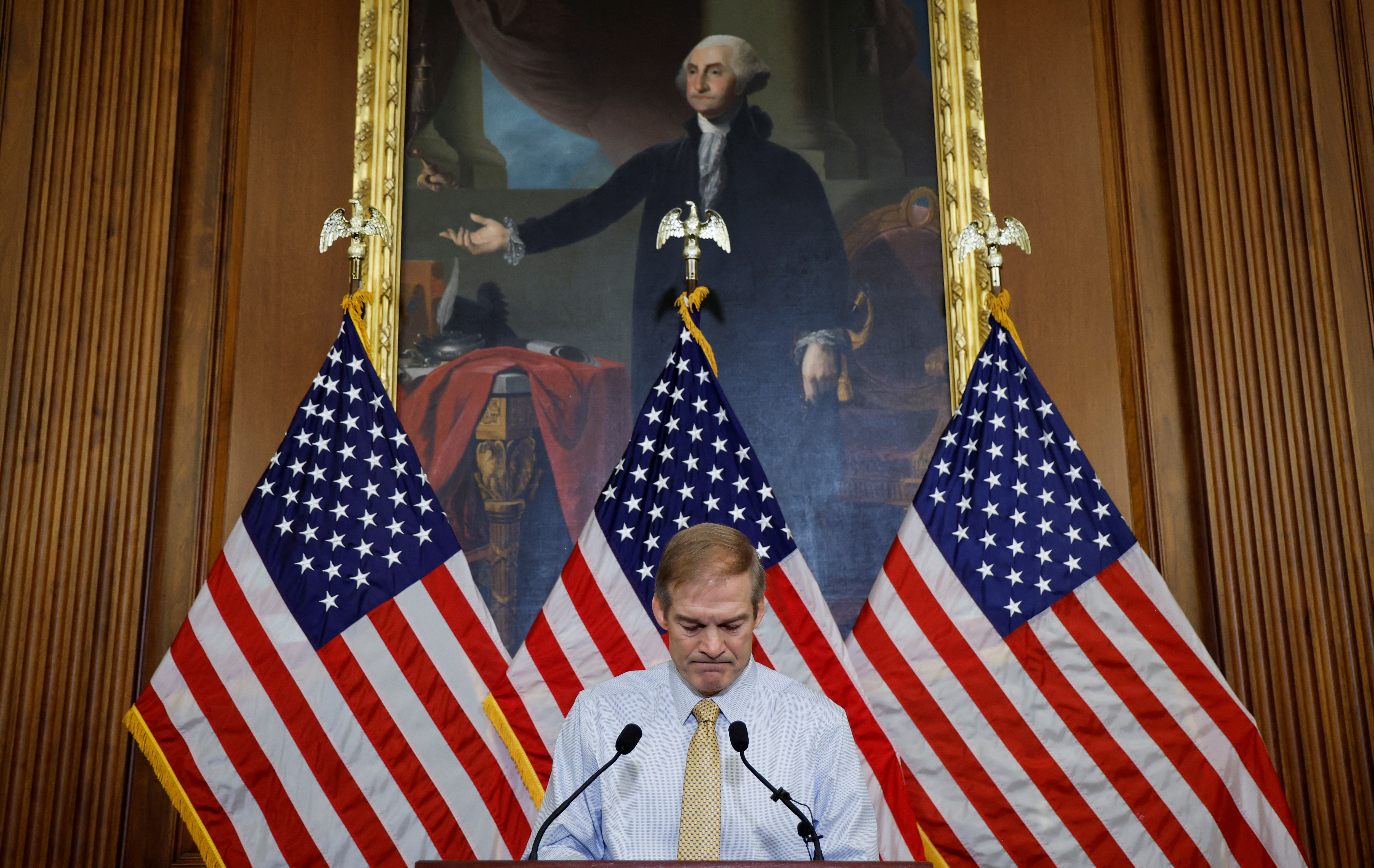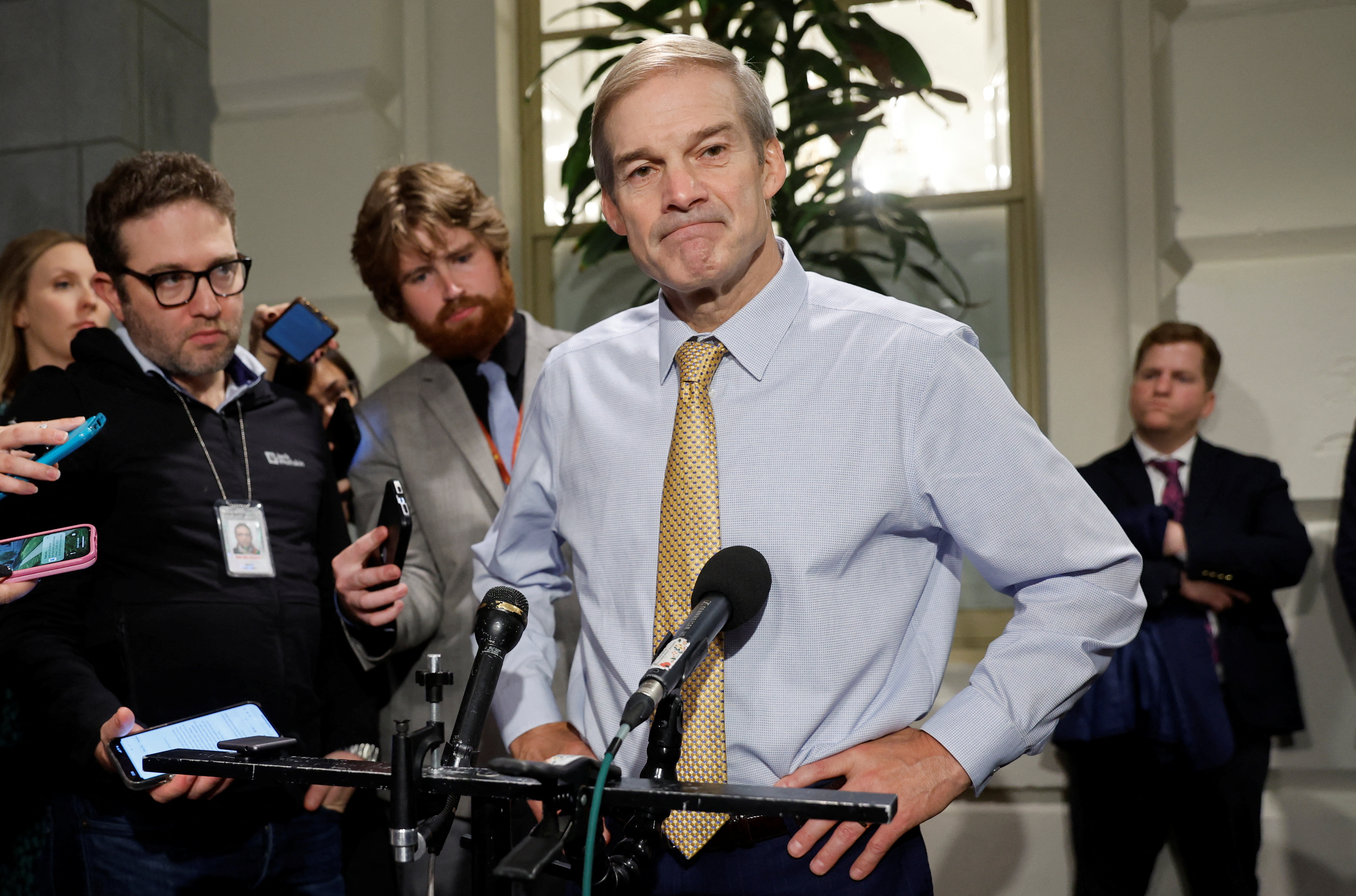美国众议员吉姆·乔丹(R-OH)在华盛顿美国国会大厦举行的一次早间新闻发布会上向记者发表讲话,介绍他继续竞选下一届众议院议长的计划,图片拍摄于2023年10月20日。路透社/乔纳森·恩斯特