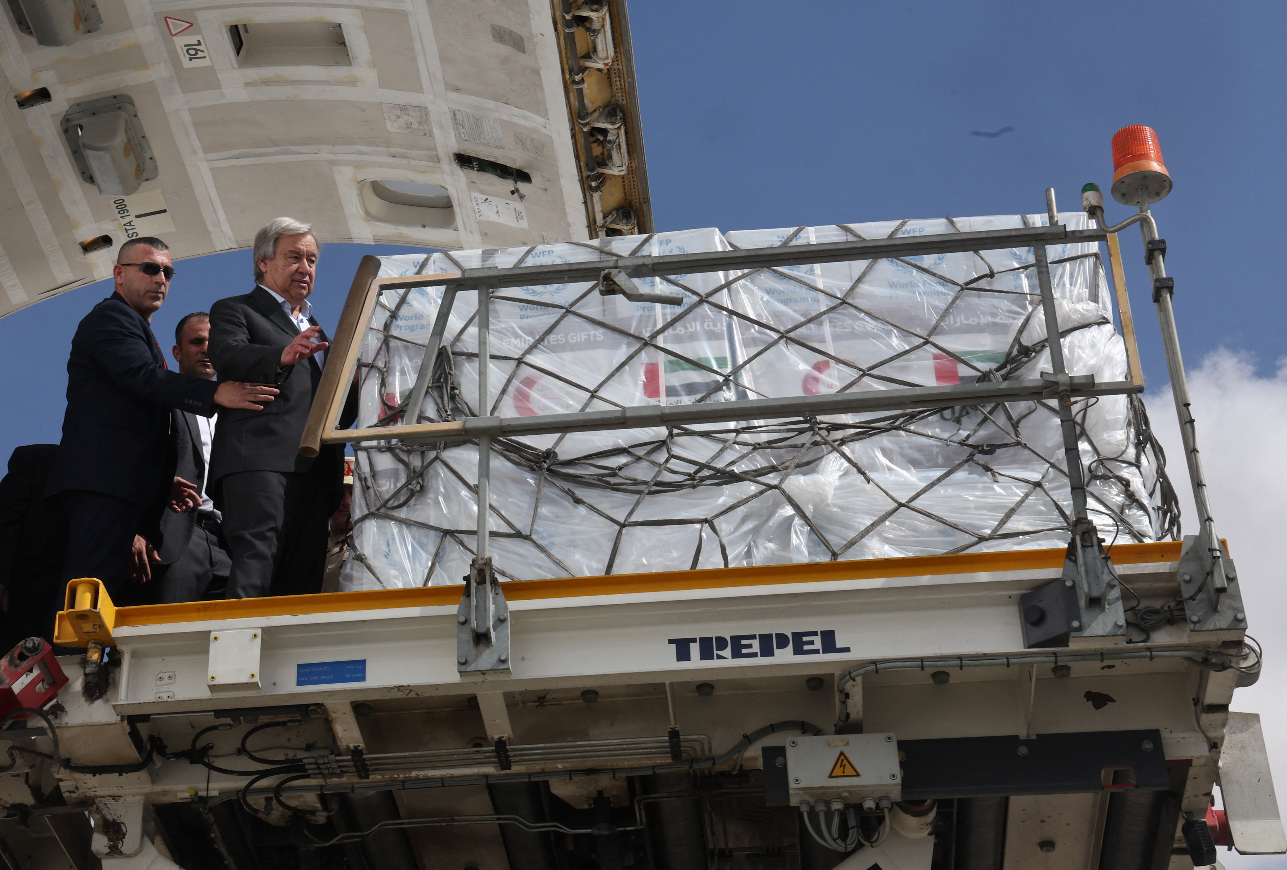 古特雷斯身着深色西装,站在沙漠阳光下,呼吁建立快速的援助货物核实系统。