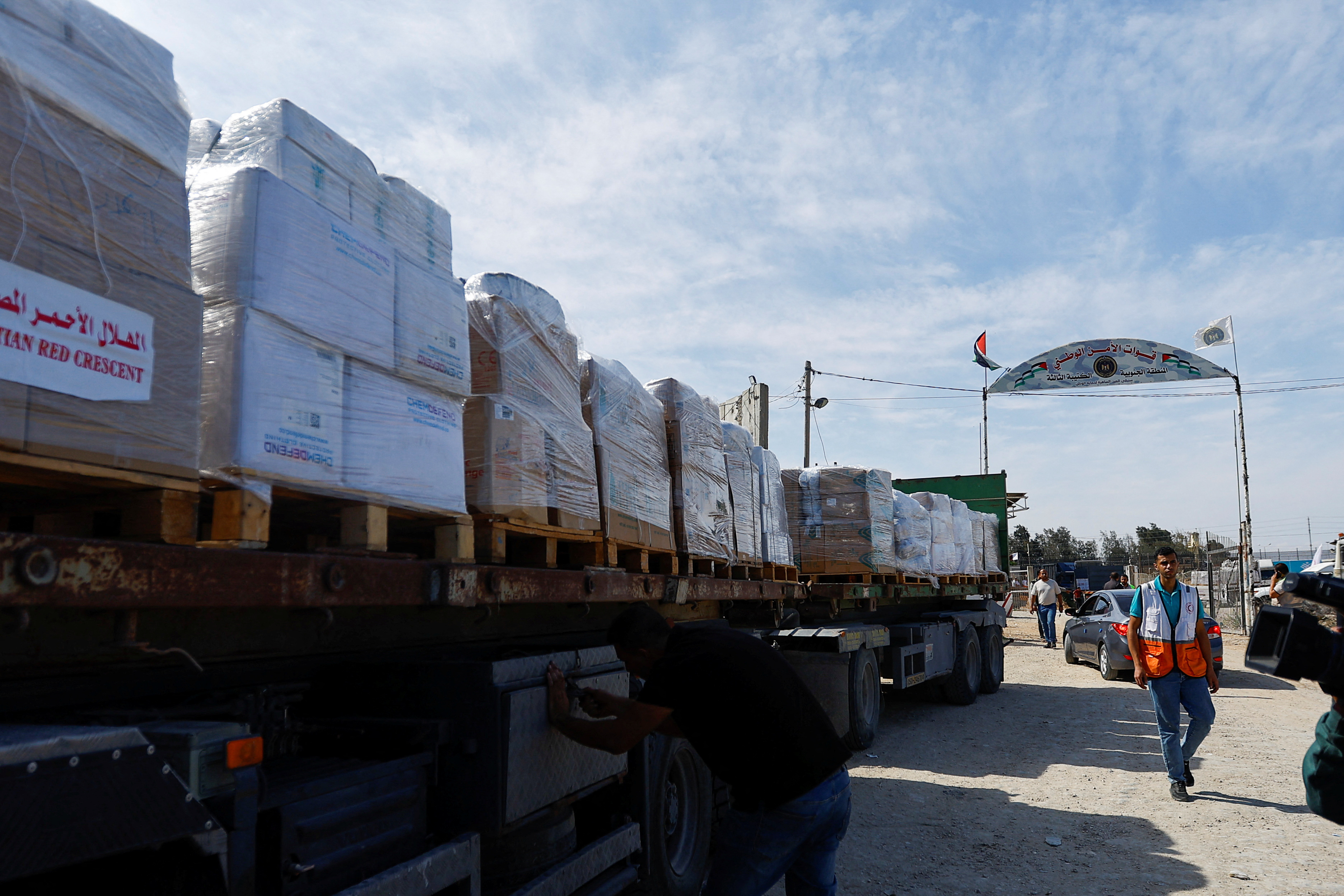 加沙/开罗,10月21日(路透社)- 自战争爆发以来,首批前往被围困的加沙地带的人道主义援助车队于周六通过拉法边境口岸抵达,此前因交涉交付救援物资的条件而滞留在埃及。