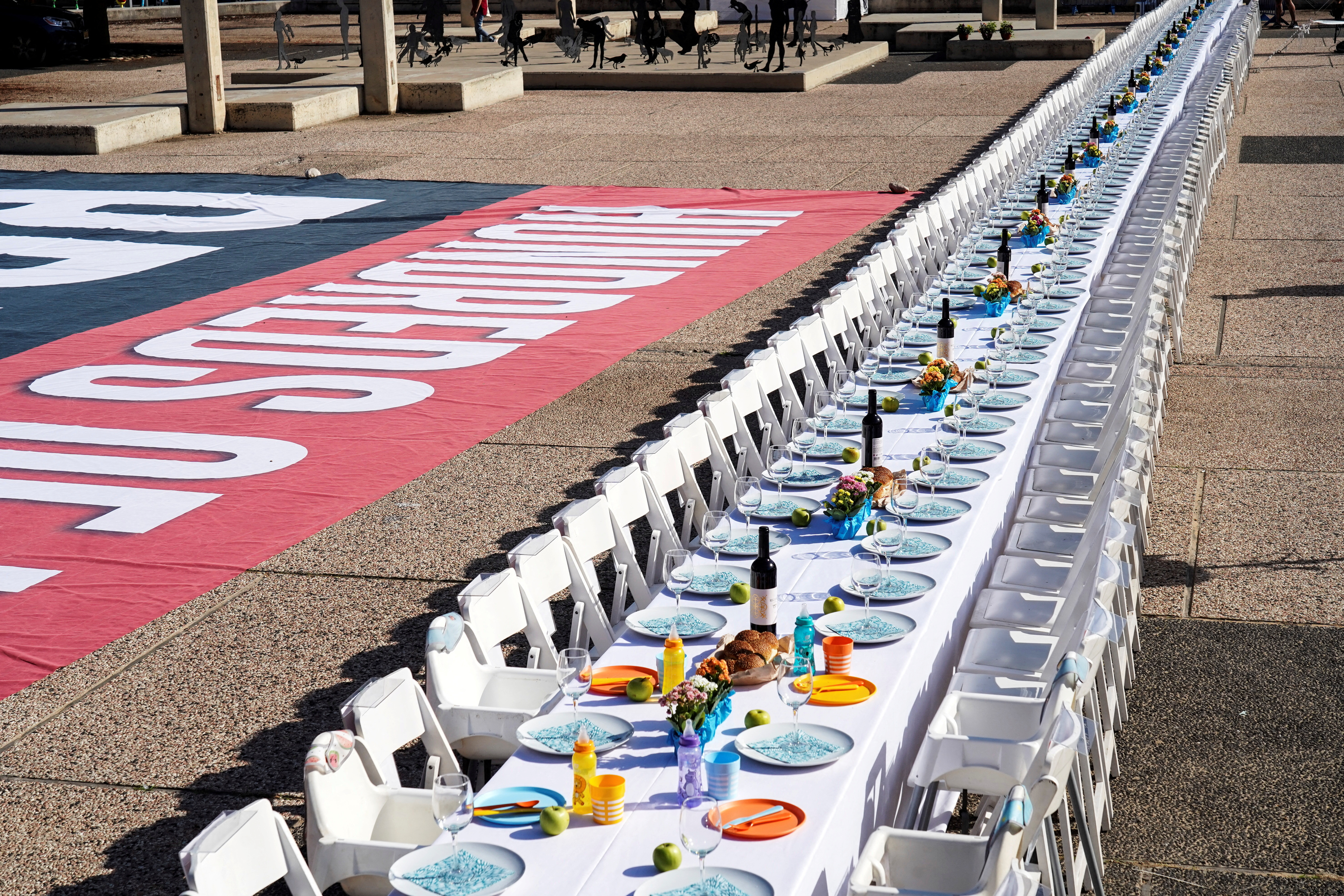 家庭支持团体每天在特拉维夫的内塔尼亚胡办公室外举行抗议活动,以保持被俘者的命运受到关注,并在市中心广场上摆放了一张桌子,每个失踪人员都有一个餐具摆设,作为被绑架者困境的象征。
