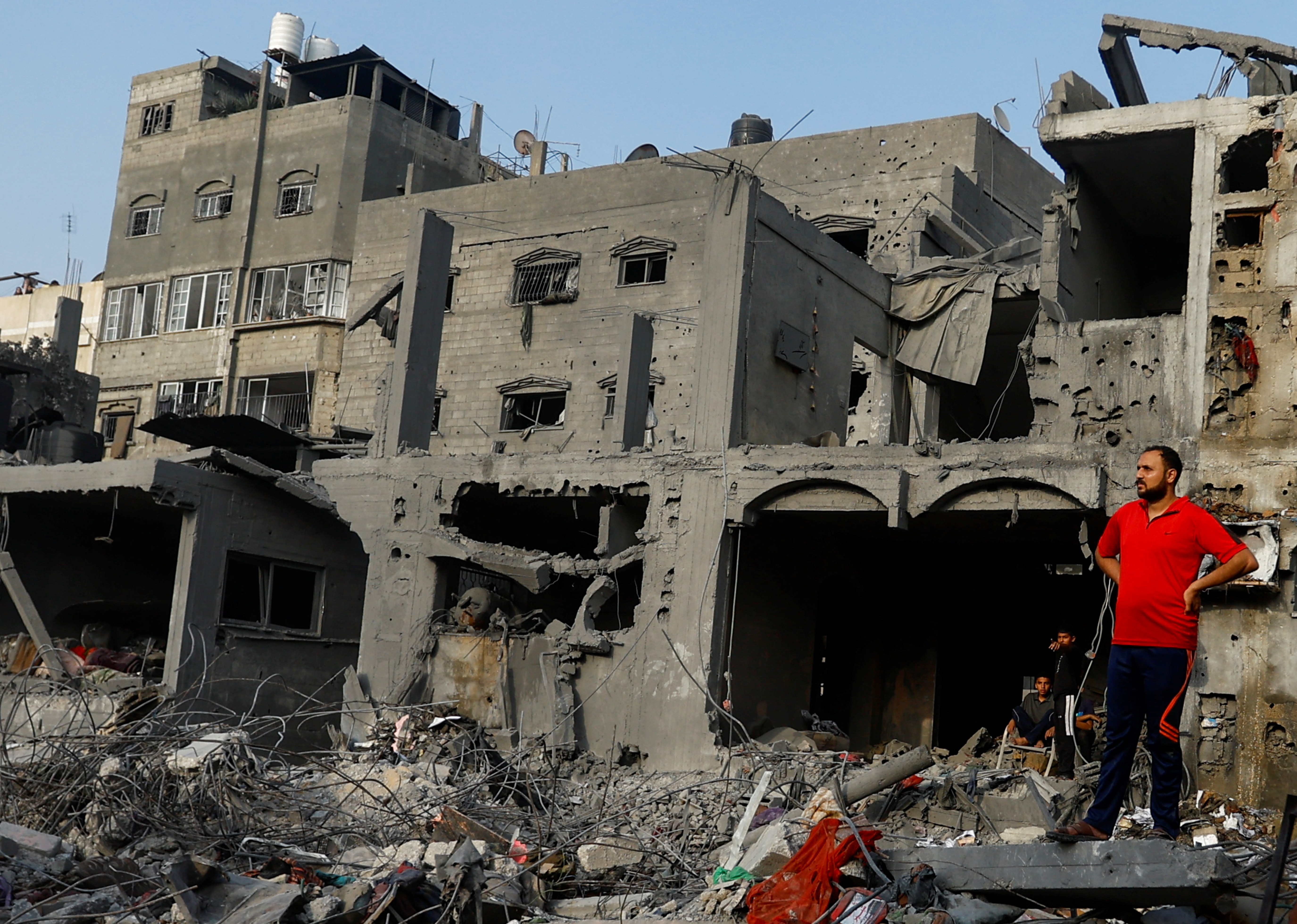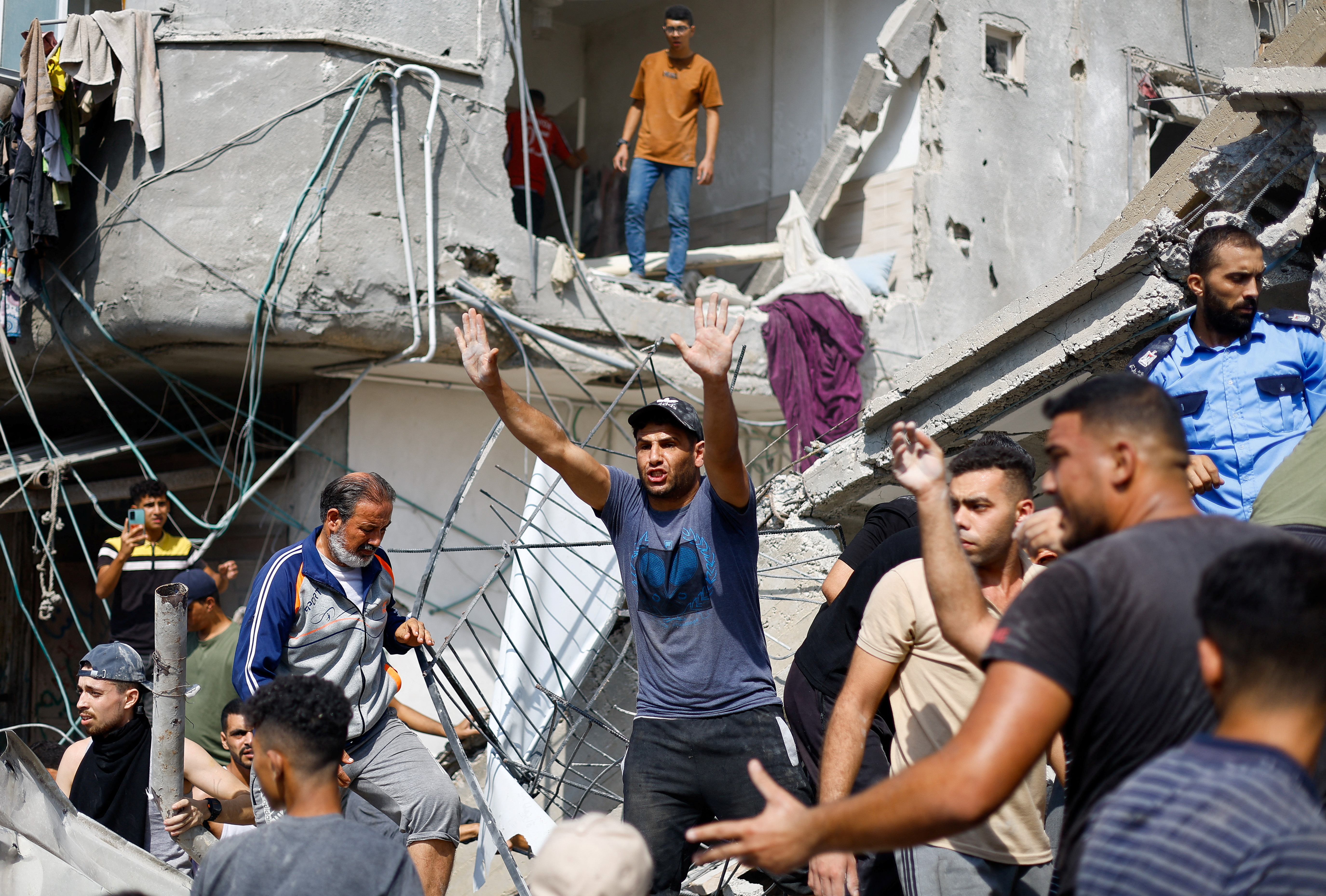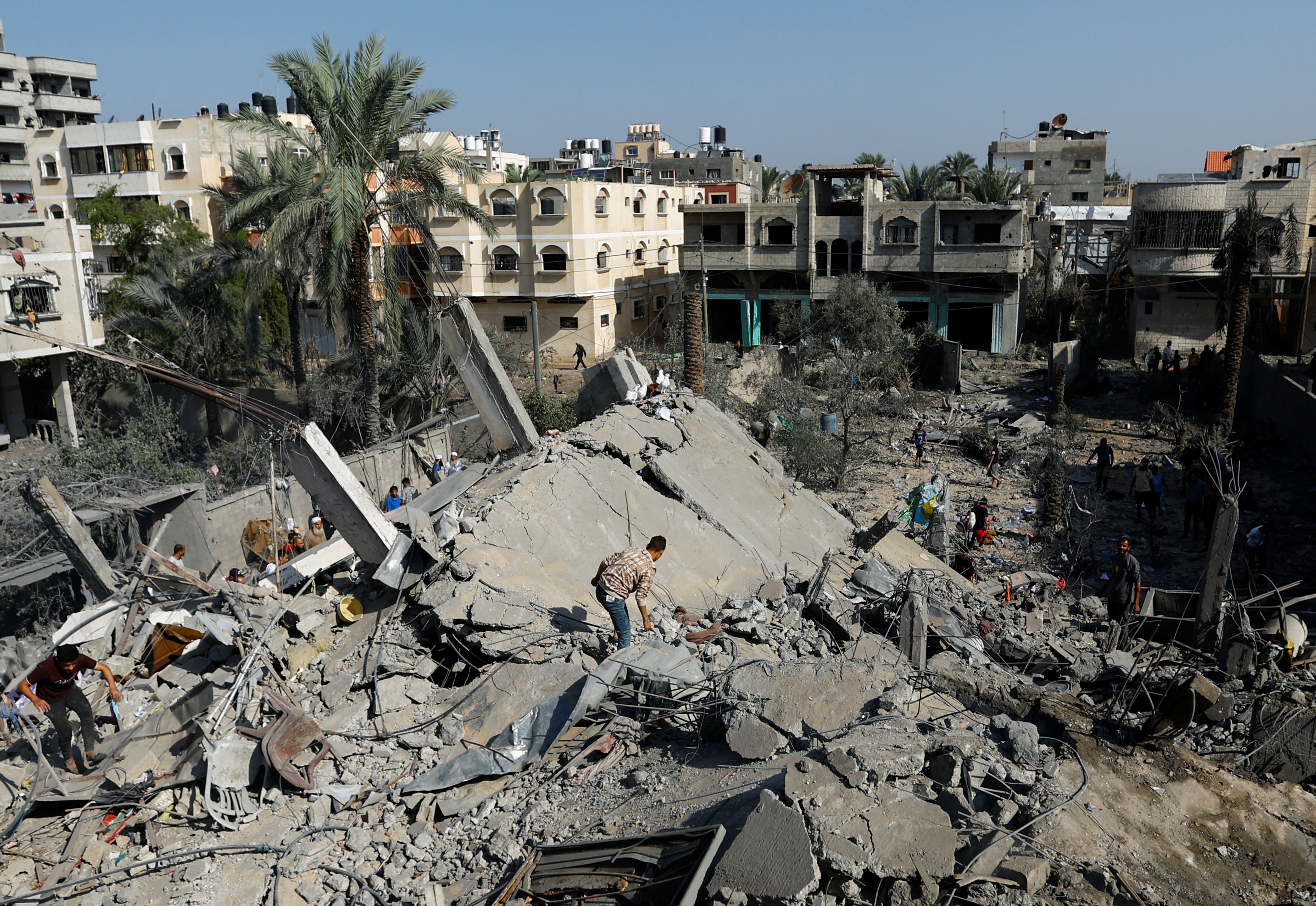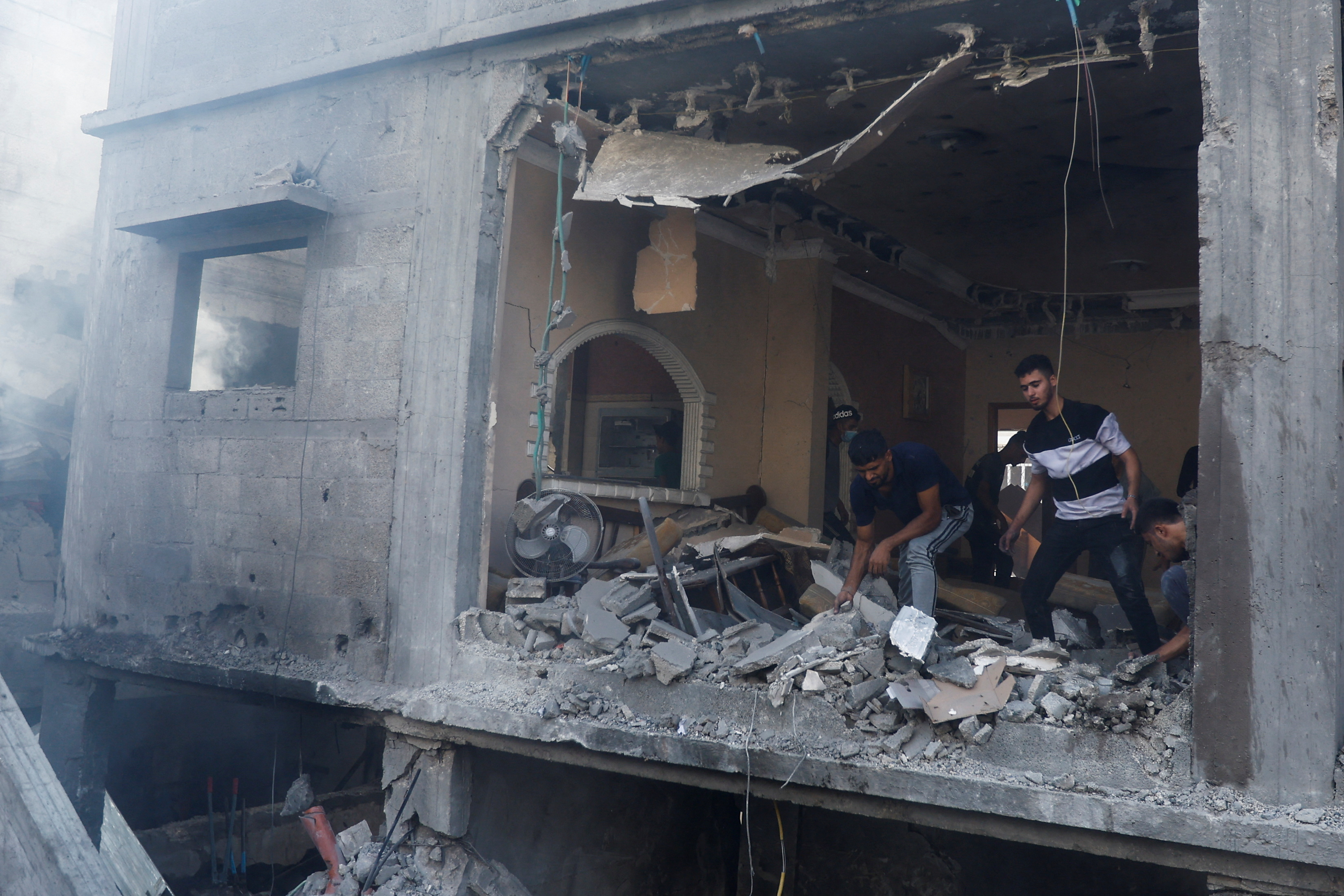 巴勒斯坦人在加沙南部汗尤尼斯的以色列空袭房屋现场搜寻伤亡人员,2023年10月25日。路透社/伊布拉欣·阿布·穆斯塔法