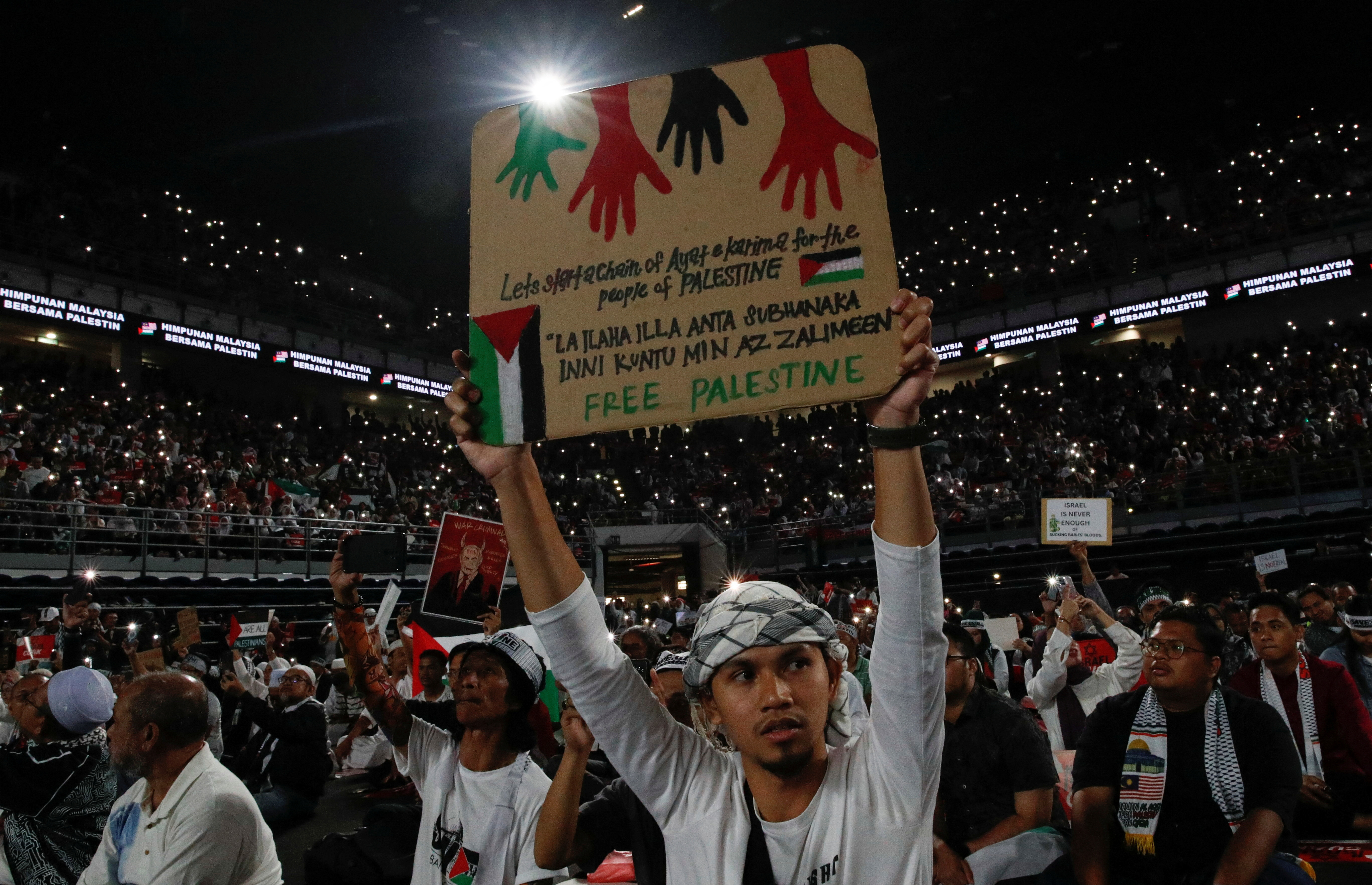 一名男子在吉隆坡举行的团结集会上举着写有口号的牌子,以表达对巴勒斯坦人的支持,此时以色列和哈马斯之间的冲突不断升级。2023年10月24日,马来西亚,路透社/Hasnoor Hussain