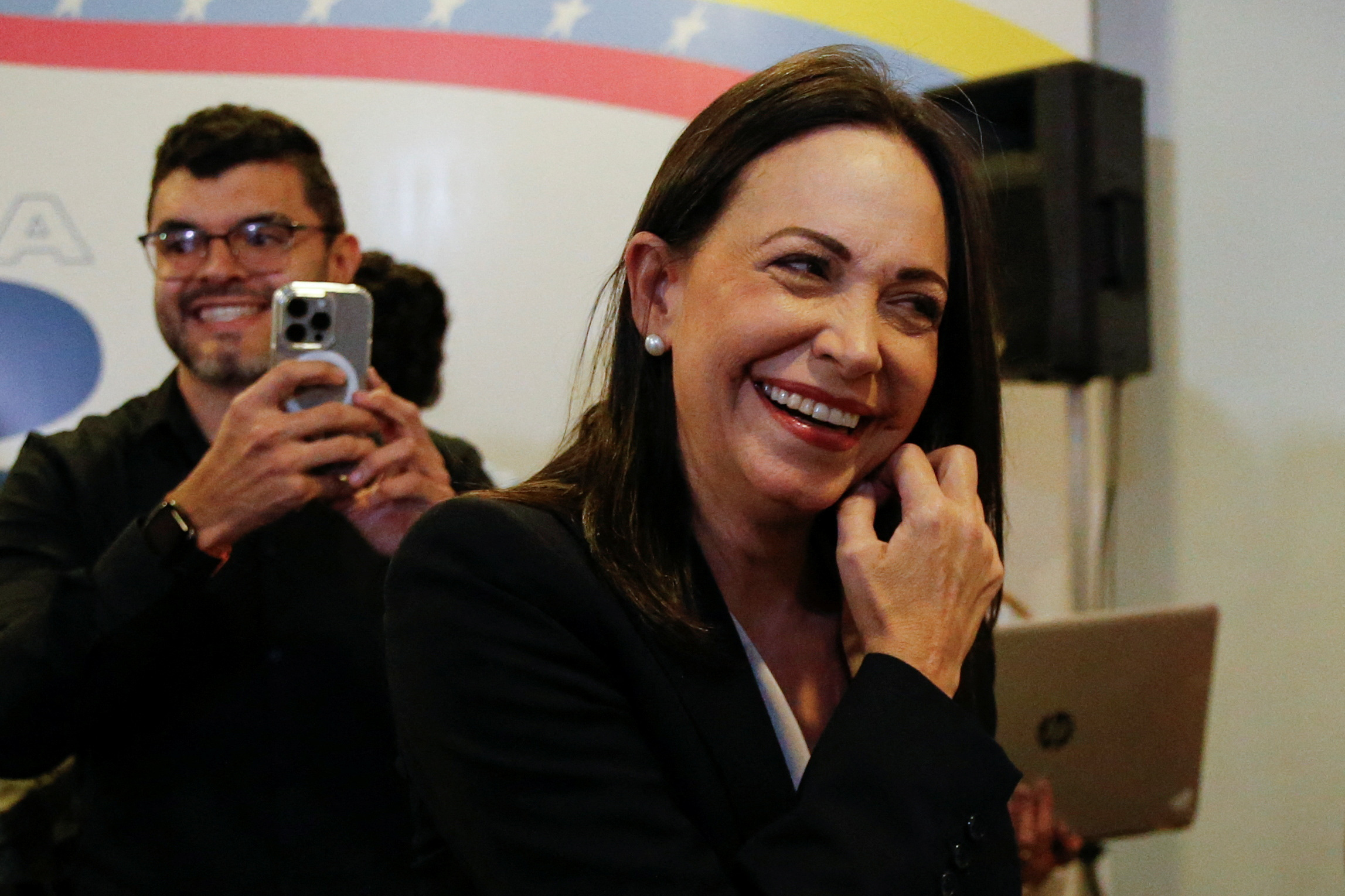 委内瑞拉反对派总统初选获胜者玛丽亚·科里娜·马查多在2023年10月24日于委内瑞拉加拉加斯向媒体发表讲话。路透社/莱昂纳多·费尔南德斯·维洛利亚摄