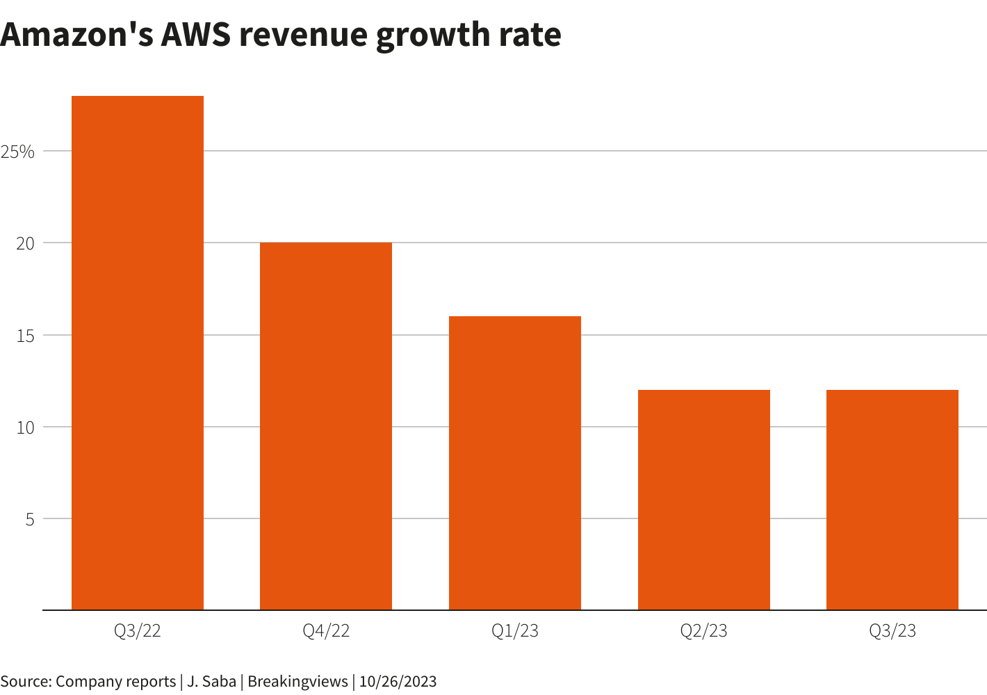 纽约,10月26日(路透Breakingviews) - 亚马逊公司(AMZN.O)的云业务提供了一丝曙光。这家市值1.2万亿美元的电商巨头第三季度AWS收入同比增长12%,达到230亿美元。这一表现与上一季度的增长相匹配,并与分析师的预期一致,据伦交所称。这虽然是一个低水平,但至少不像竞争对手Alphabet(GOOGL.O)那样出现了减速。