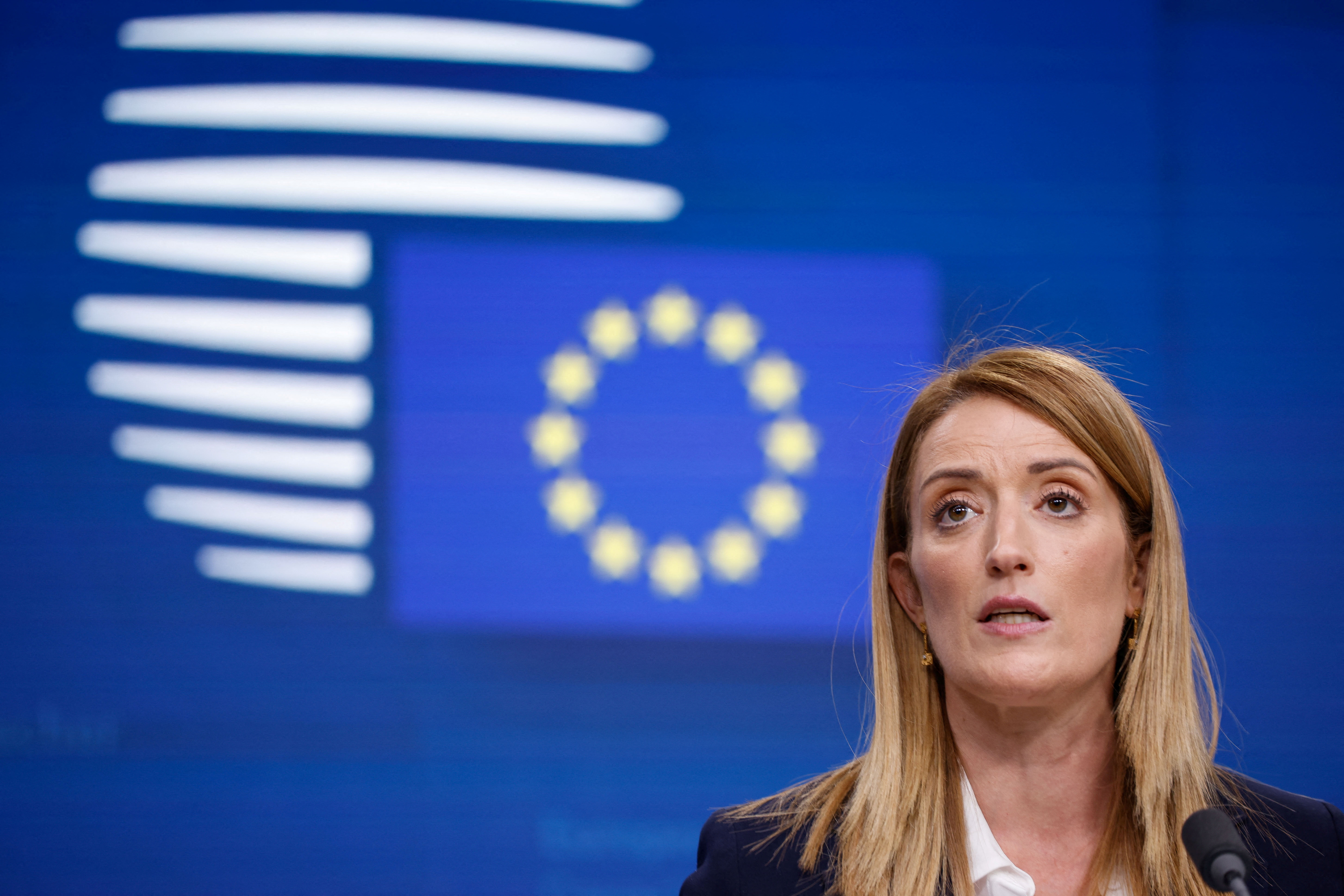 欧洲理事会成员在出席2023年10月26日在比利时布鲁塞尔举行的欧盟领导人峰会时发言。路透社/伊夫·赫尔曼摄