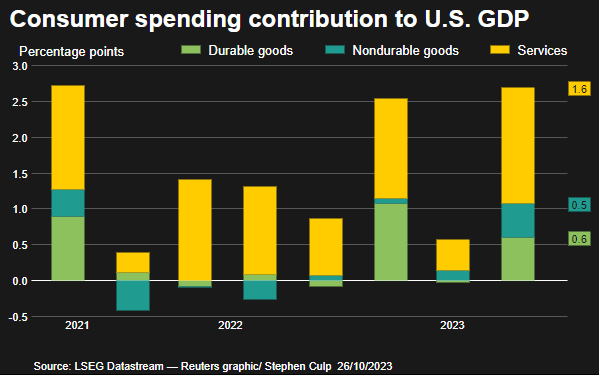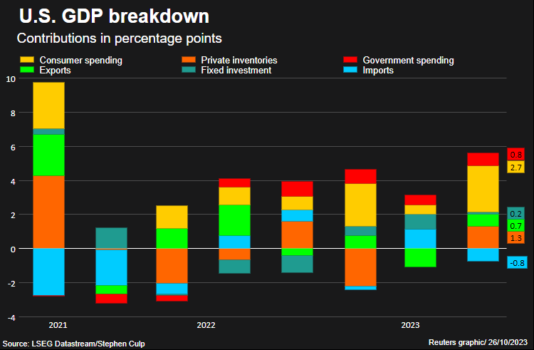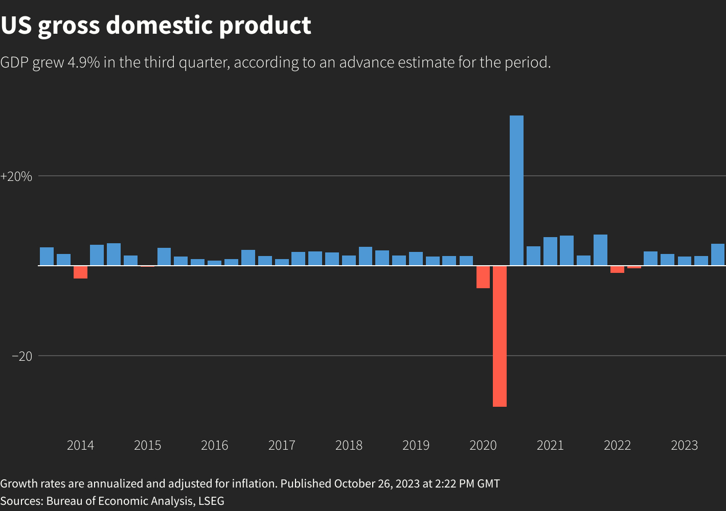 华盛顿,10月26日(路透社)-美国经济在第三季度增长了近5%,再次违背了衰退的严重警告,因为劳动力市场紧张导致的工资上涨帮助推动了消费支出,企业以迅猛的速度补充库存以满足强劲的需求。