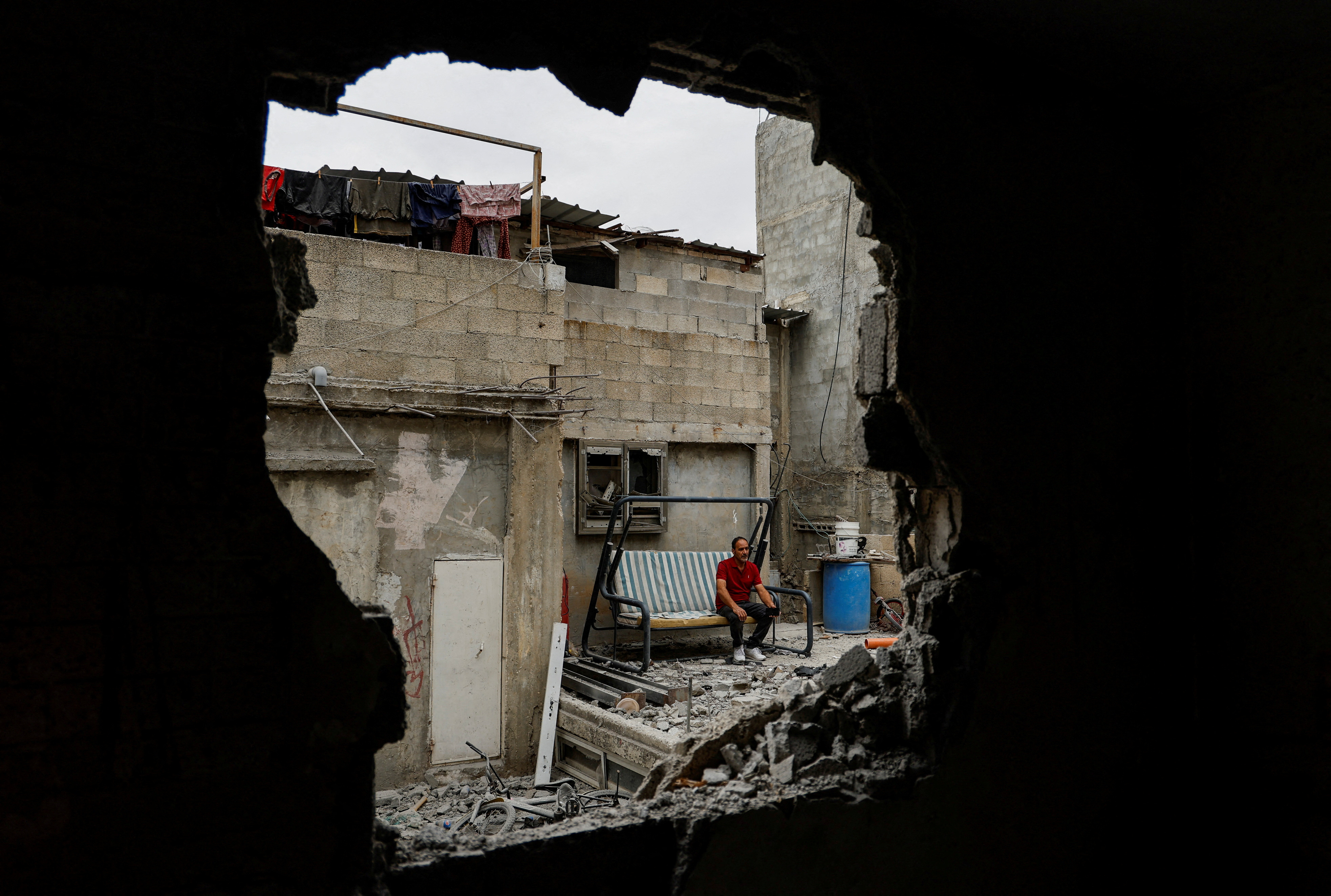 巴勒斯坦人在加沙南部汗尤尼斯的以色列空袭房屋现场查看损害,2023年10月29日。路透社/莫罕默德·塞勒姆