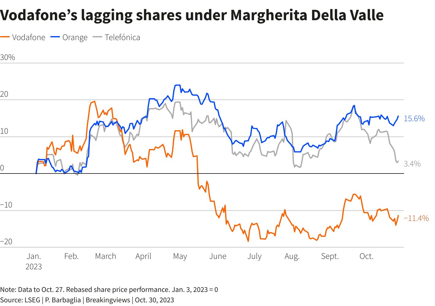 伦敦,10月30日(路透社Breakingviews) - 沃达丰(Vodafone) (VOD.L) 董事长玛格丽塔·德拉瓦莱(Margherita Della Valle)正在整顿这家市值210亿英镑的庞大电信集团,但这是一项艰巨的任务。西班牙潜在混乱的退出说明了这一点。德拉瓦莱在该国缺乏明显的合作伙伴:当地巨头电信公司Telefónica (TEF.MC) 太大,而竞争对手Orange (ORAN.PA) 和MásMóvil正在彼此合并。因此,沃达丰可能已经发现了一个潜在的问题对手,对于德拉瓦莱来说,这家公司已经被列入了战略审查。