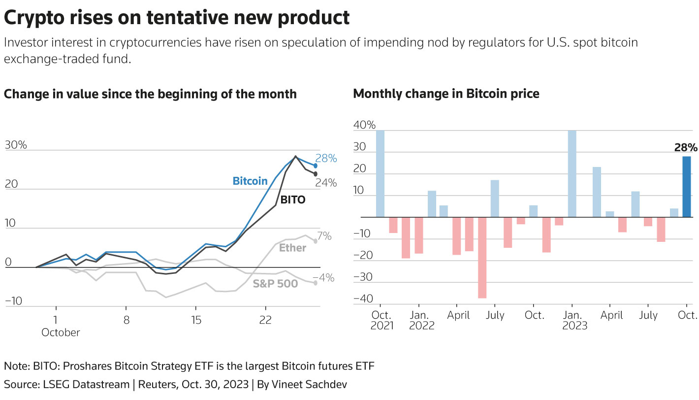 全球最大的加密货币在10月份飙升了28%,投资者们押注美国监管机构将批准现货比特币交易所交易基金,并由此释放新一波需求。