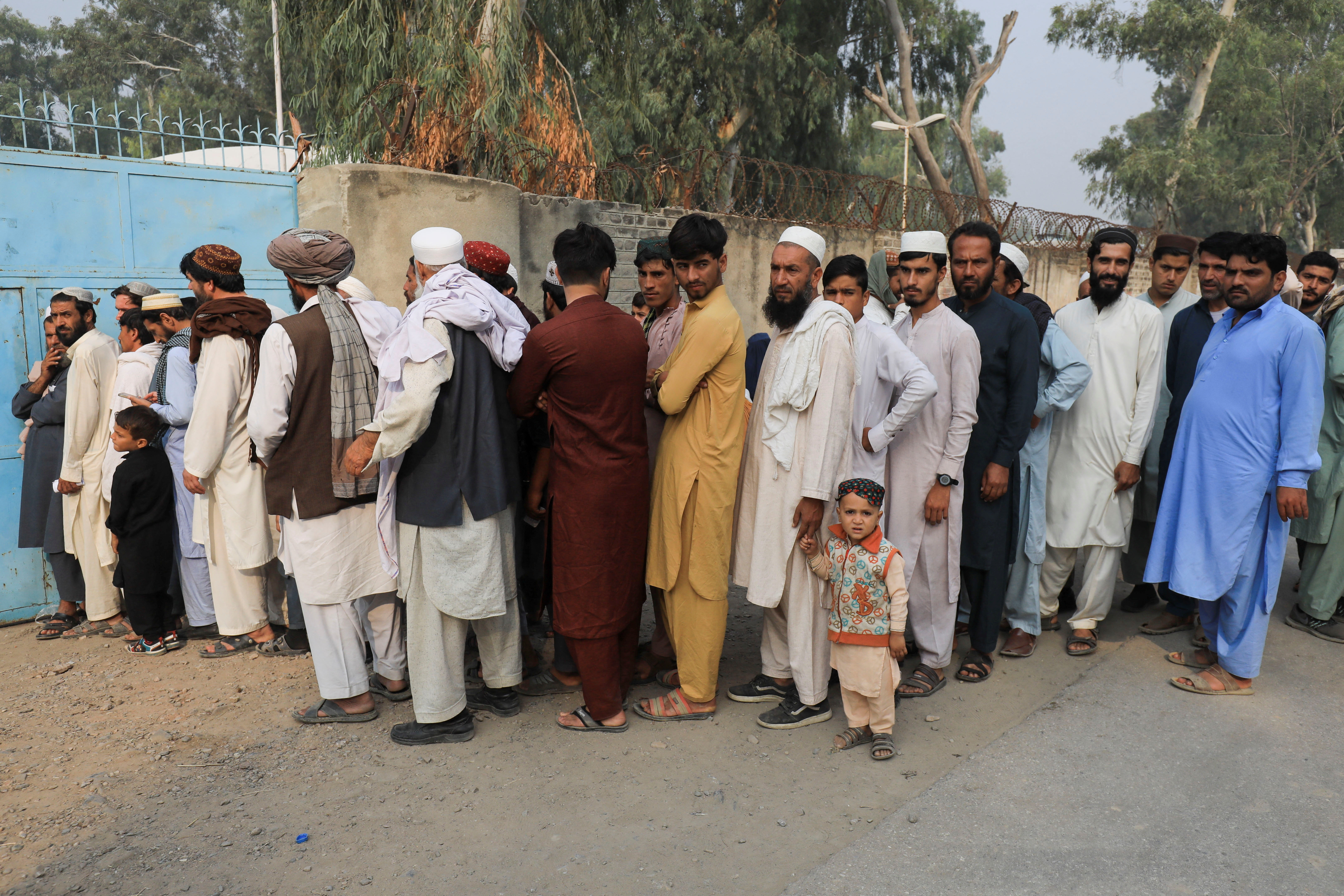 阿富汗难民男子在巴基斯坦Azakhel镇的联合国难民事务高级专员办事处外排队办理文件,巴基斯坦已经警告无证移民离开,2023年10月30日。 路透社/Fayaz Aziz