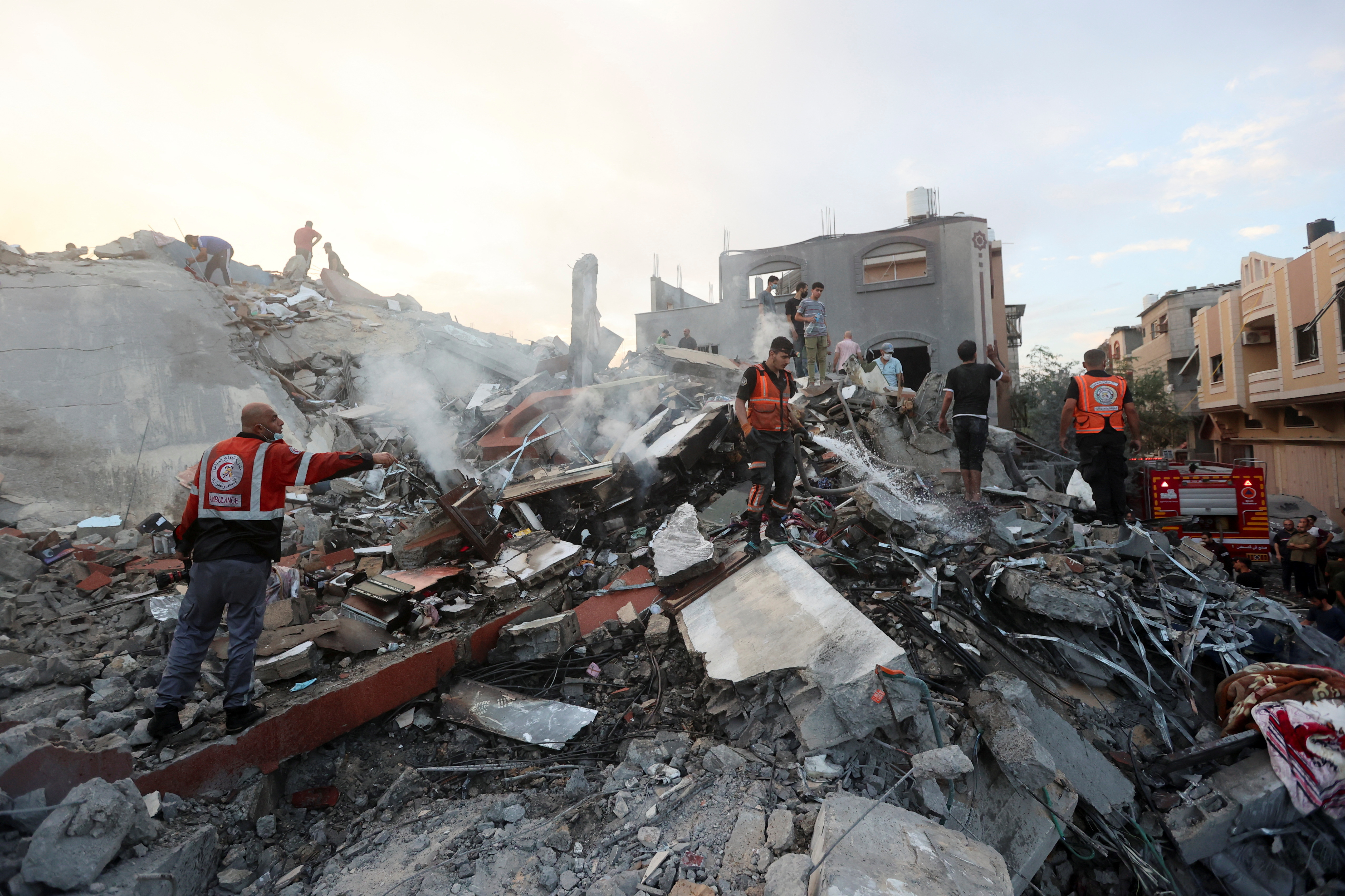巴勒斯坦人在加沙中部一栋住宅楼遭以色列空袭现场进行搜救工作,2023年10月31日。路透社/艾哈迈德·扎科特