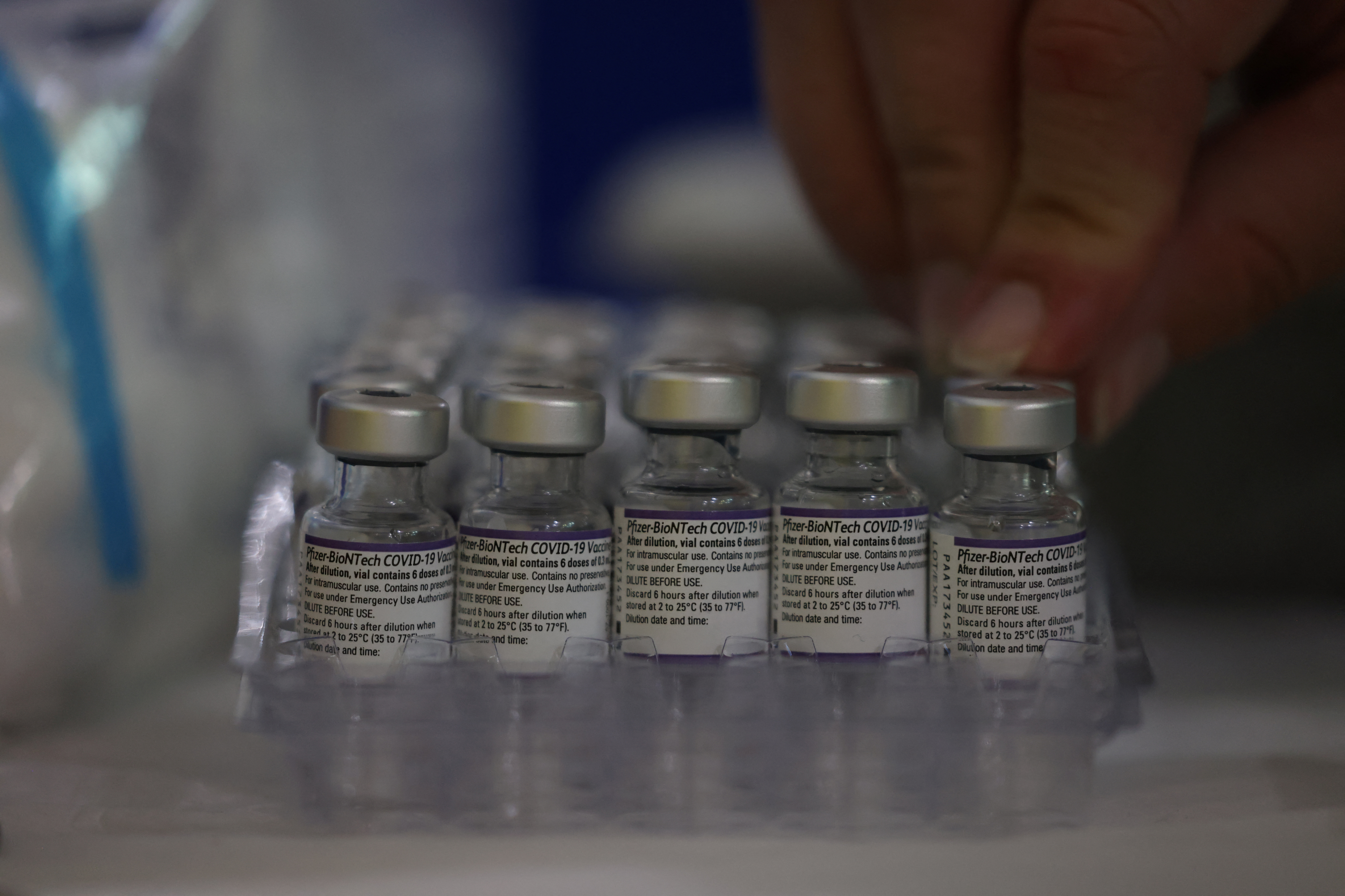 装有辉瑞/联德疫苗的小瓶,用于新冠病毒(COVID-19)的第二次加强接种计划,于2022年2月7日在智利圣地亚哥的一座教堂内展出。路透社/伊万·阿尔瓦拉多