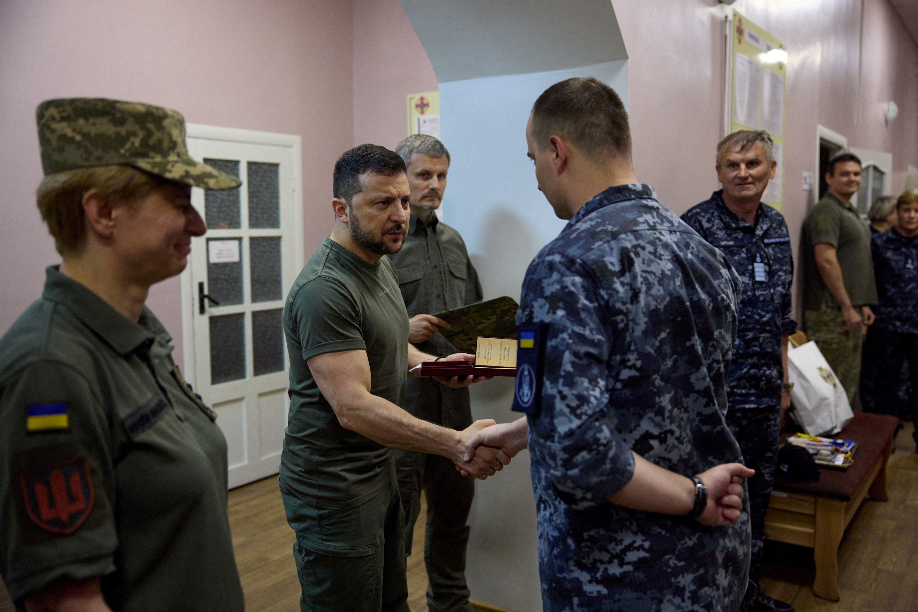 乌克兰总统沃洛迪米尔·泽连斯基授予乌克兰军人奖章,他在乌克兰尼古拉耶夫地区的奥恰基夫镇的一家军事医院访问,当时俄罗斯正在袭击乌克兰。2023年7月27日,乌克兰总统新闻办公室/路透社/文件照片