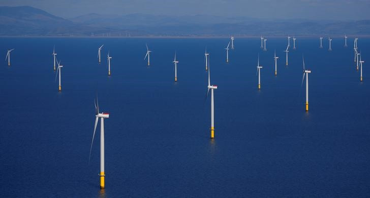 奥斯特德(Orsted)在英国布莱克浦海岸外经营的沃尔尼延伸海上风电场的全景,摄于2018年9月5日。路透社/菲尔·诺布尔