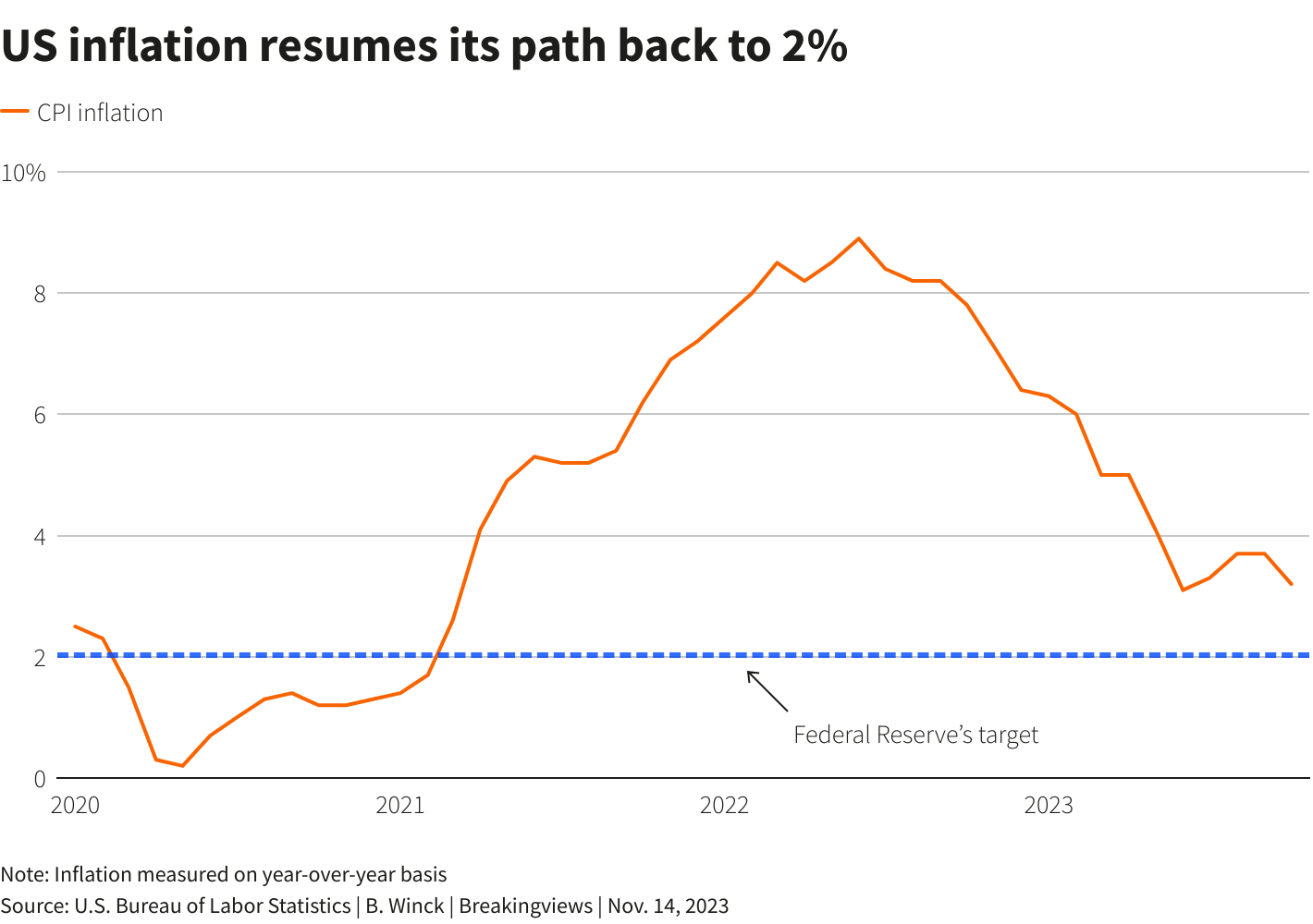 劳工统计局周二表示,十月份的物价涨幅同比为3.2%,仅略高于美联储的目标。更好的是,价格与上个月持平。投资者似乎已经认为这意味着货币紧缩的结束:期货市场现在将12月13日美联储会议上加息的可能性定价为零,而周一这一概率为15%,据芝加哥商品交易所集团称。