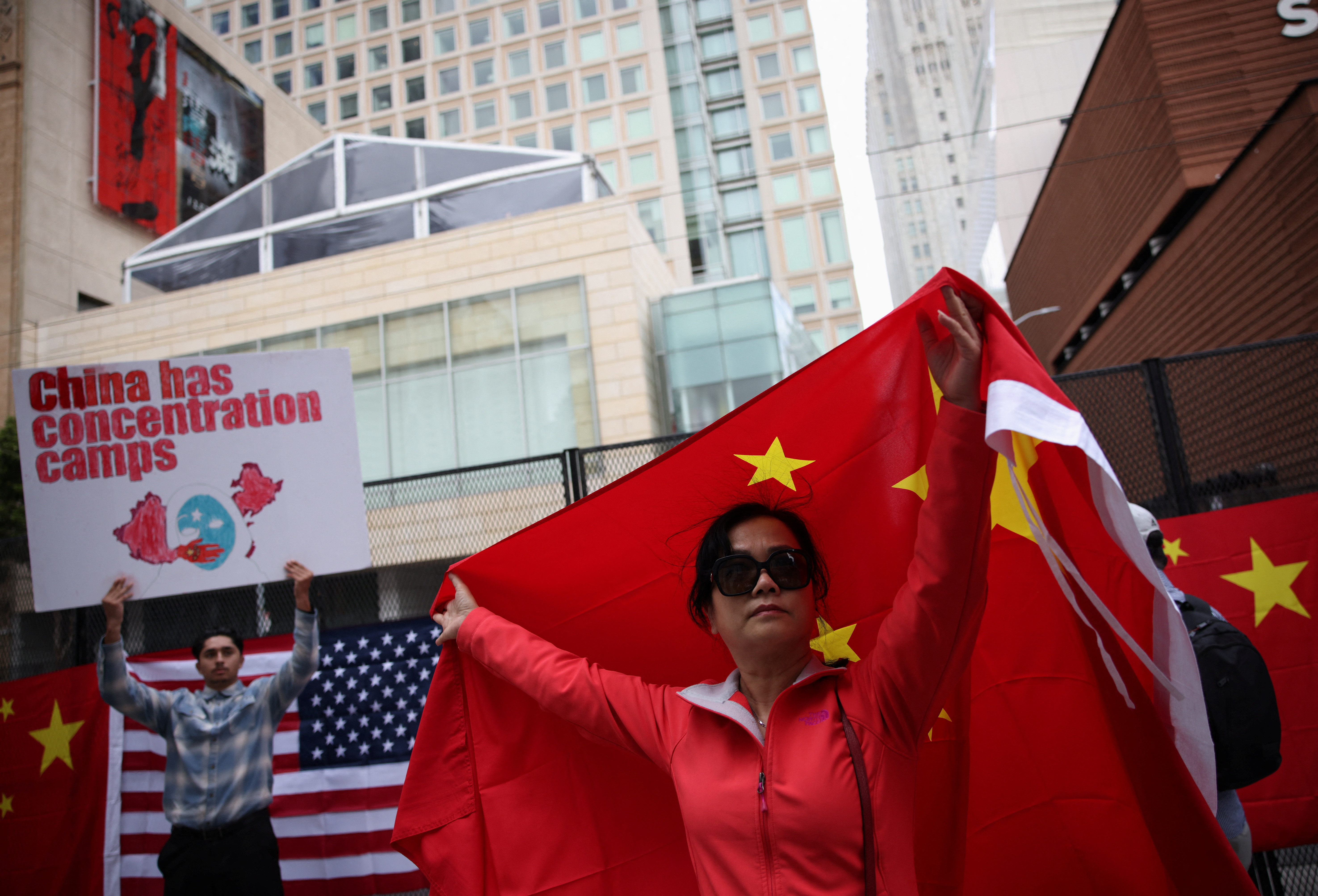 一名女子手持中国国旗,一名男子手持标语牌站在中国代表团下榻的旧金山加利福尼亚州酒店外,照片拍摄于2023年11月14日。路透社/Carlos Barria