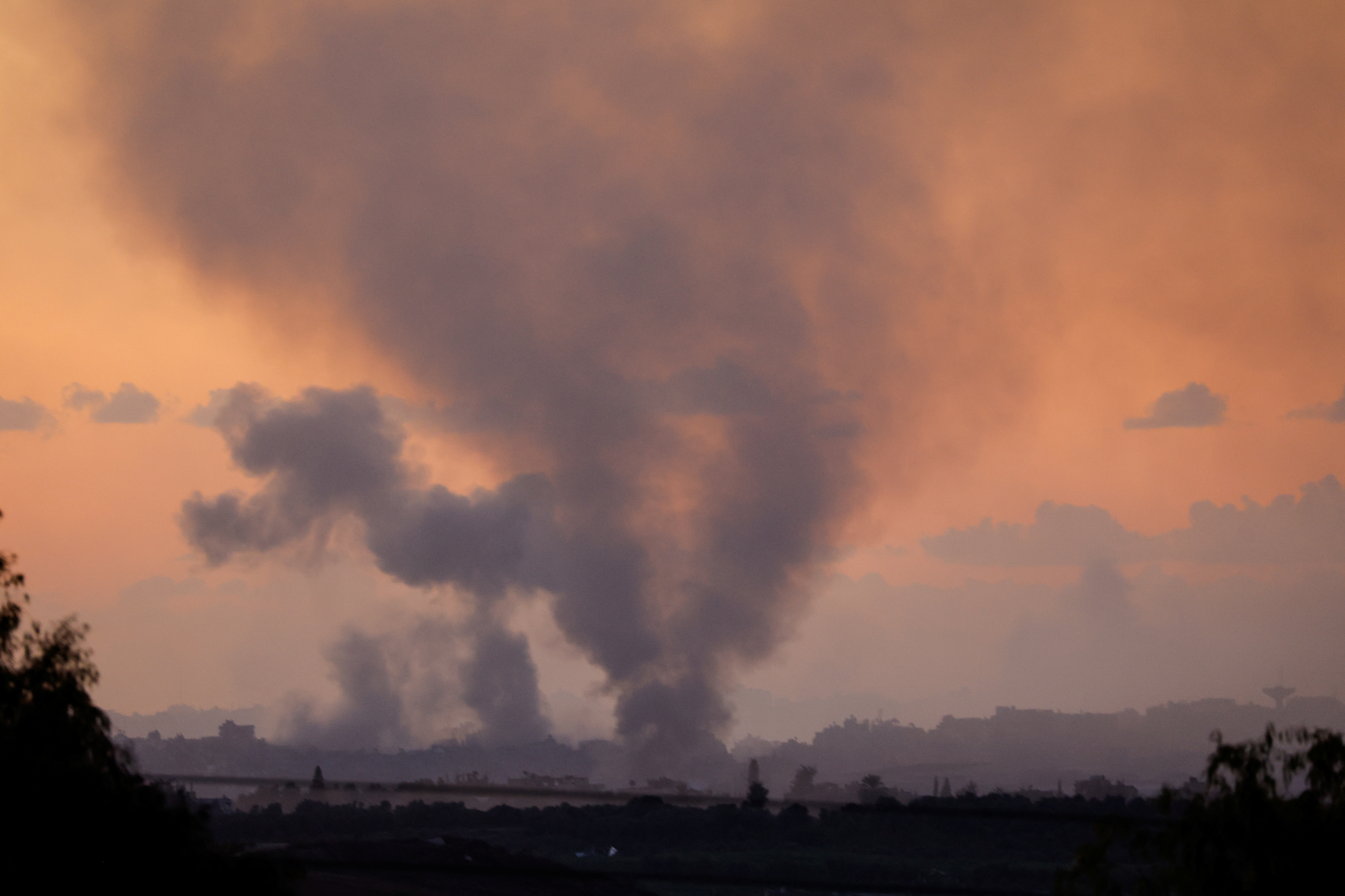 烟雾从以色列南部看向加沙上空升起,这是以色列和巴勒斯坦哈马斯组织之间持续冲突的一部分,2023年11月15日。路透社/Alexander Ermochenko