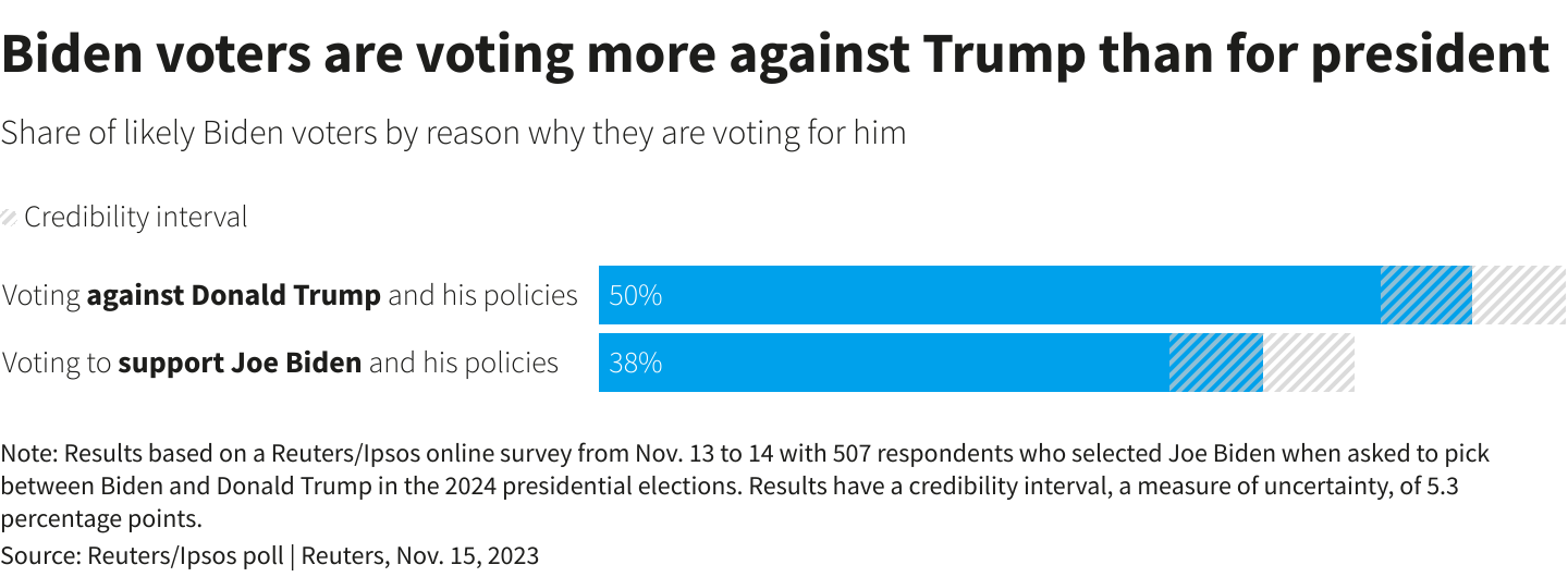 华盛顿,11月15日(路透社) - 一项新的路透社/益普索民调发现,倾向于在2024年选举中投票支持民主党总统乔·拜登的美国人更多地受到阻止唐纳德·特朗普重返白宫的动机,而不是支持现任总统。