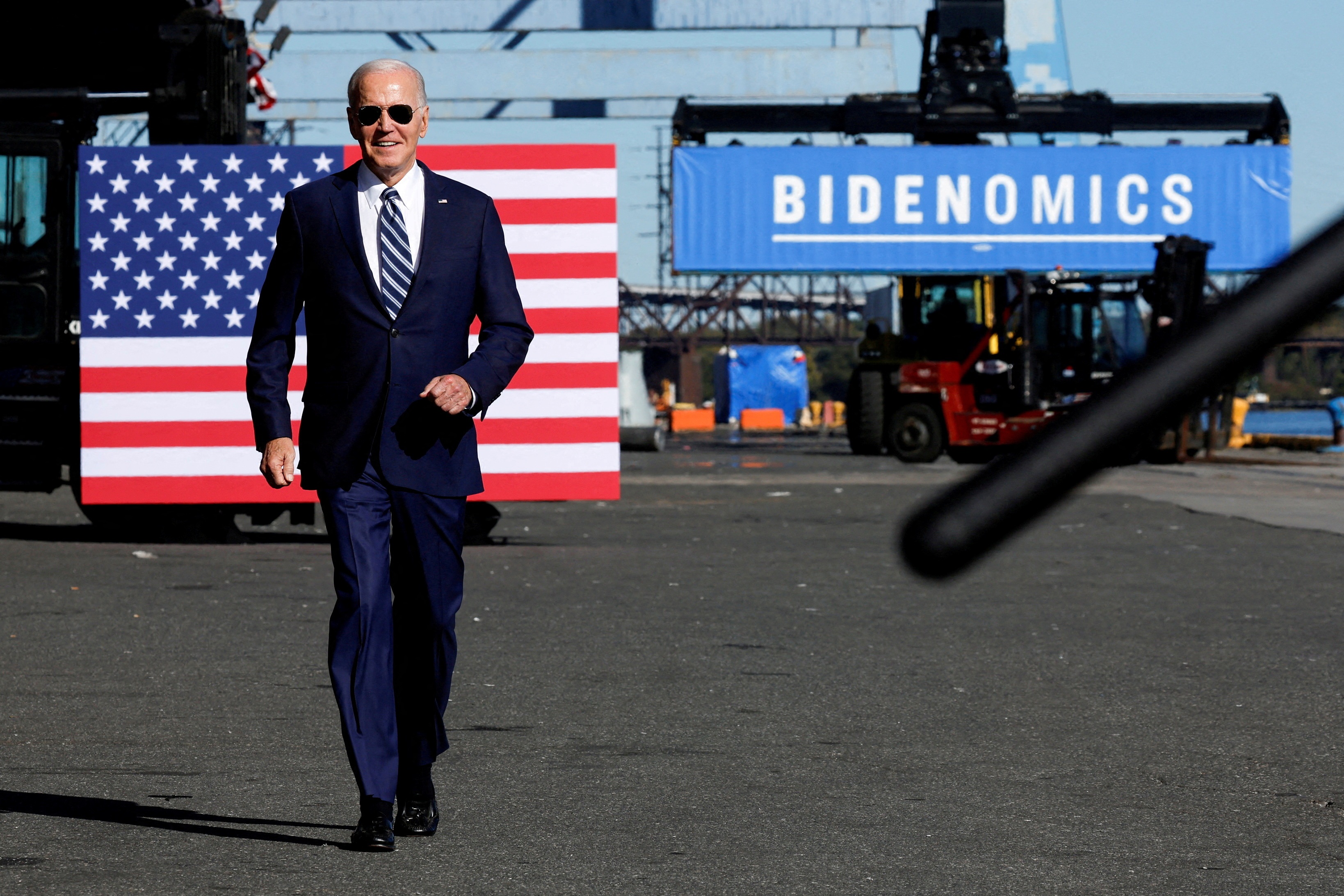 美国总统乔·拜登抵达费城宾夕法尼亚州的提奥加海军码头,就他的经济目标发表讲话,2023年10月13日,美国。路透社/乔纳森·恩斯特/文件照片
