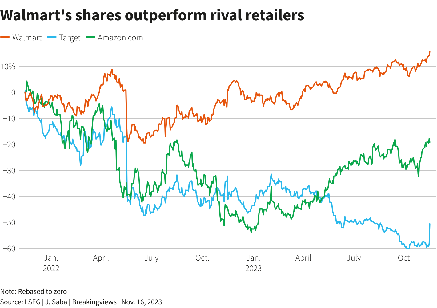 这种反应在一定程度上可以解释为沃尔玛表明它看到了通胀放缓的迹象。食品杂货占公司销售额的一半以上,其价格已经飙升,这在过去两年里帮助提振了股价,而亚马逊(AMZN.O)和塔吉特(TGT.N)的股价都下跌了。收入增长现在可能放缓,而成本,包括工资,可能需要更长时间才能下降,并挤压利润率。运营成本从前三个季度的净销售额的21%上升了近一个百分点。