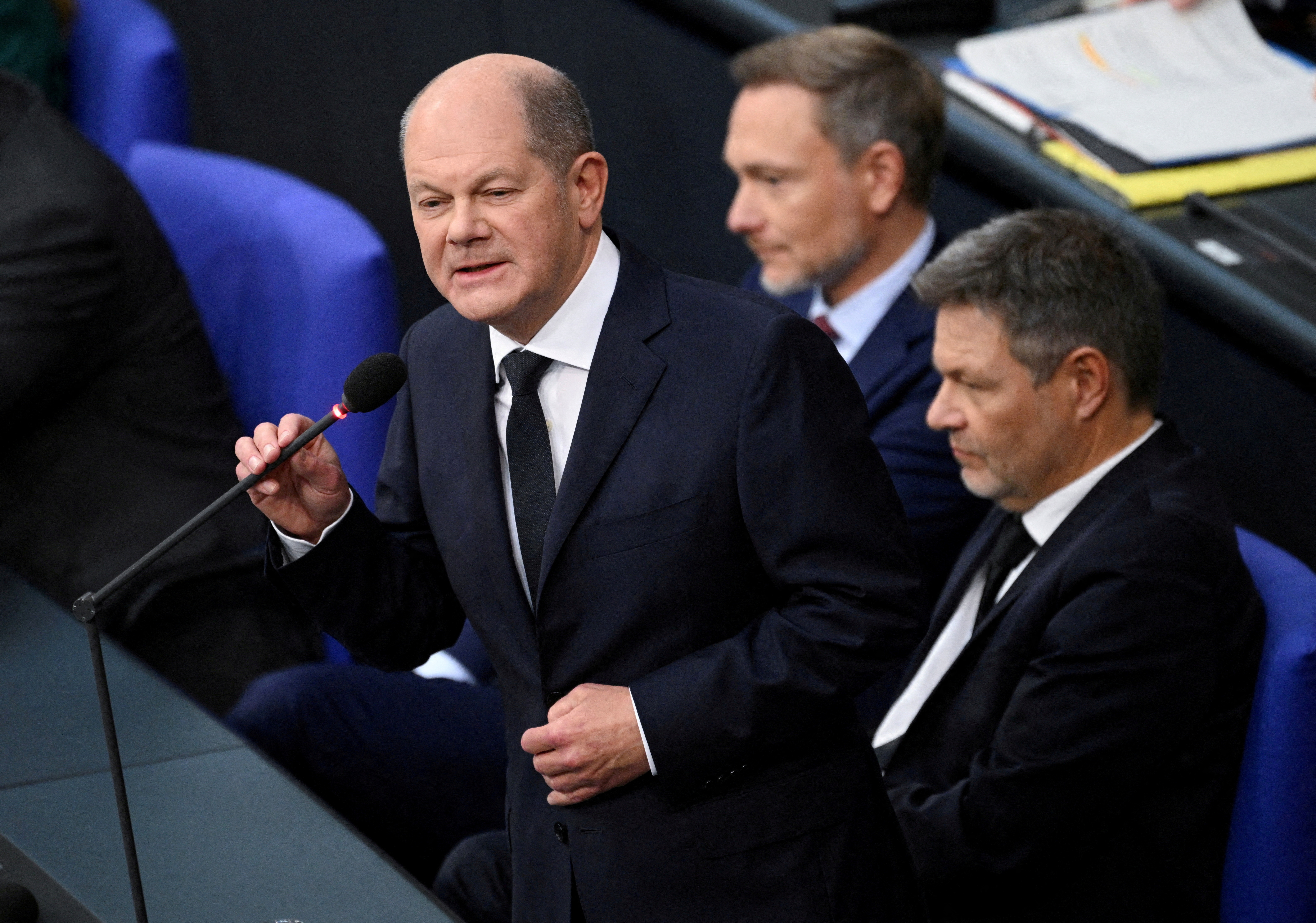 奥拉夫·肖尔茨总理在德国国会下议院布undestag听证会上与财政部长克里斯蒂安·林德纳和经济与气候部长罗伯特·哈贝克一起讲话,摄于2023年11月15日,德国柏林。路透社/安妮格雷特·希尔瑟/文件照片