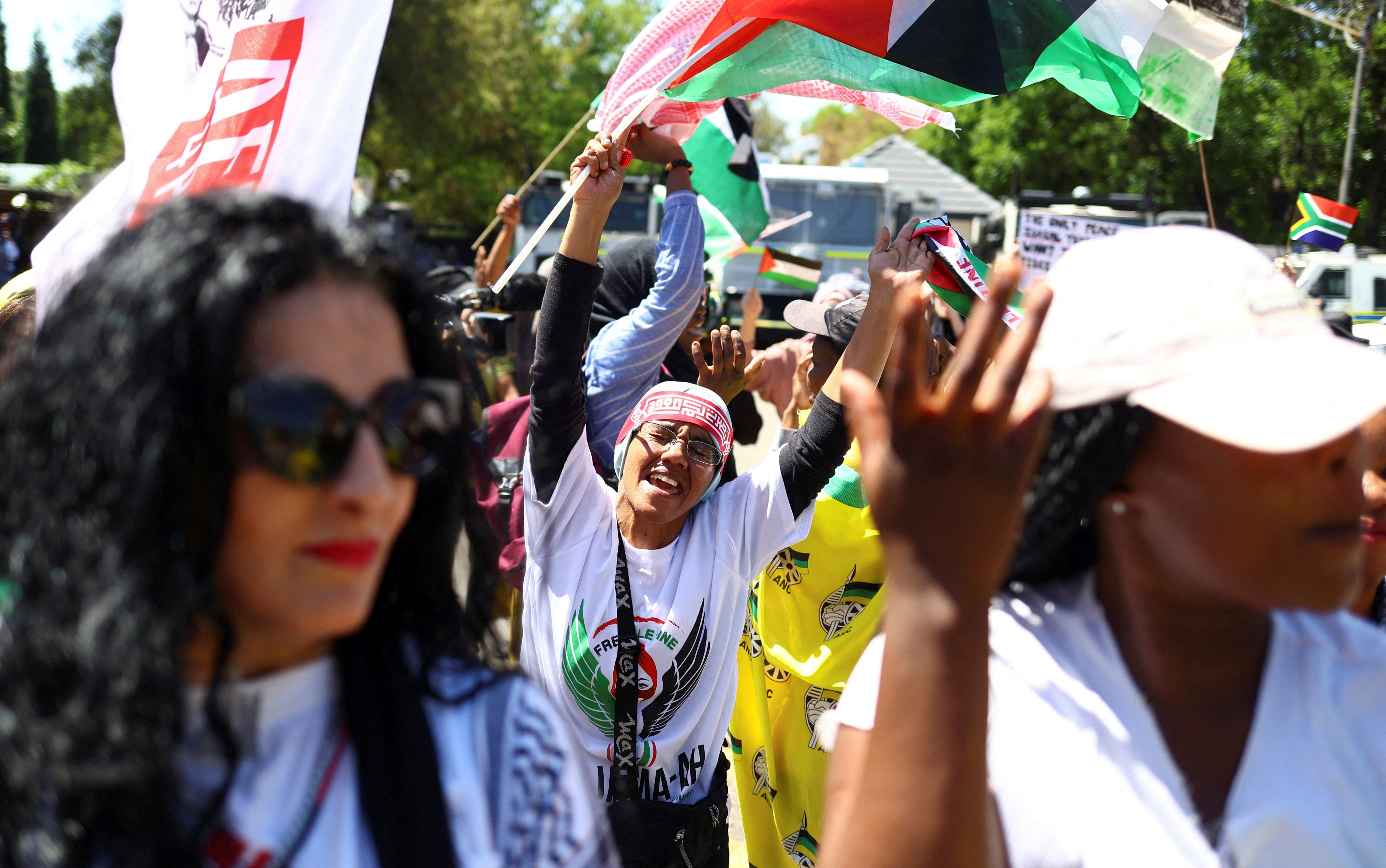 南非执政党非洲人国民大会(ANC)的支持者以及包括民间社会团体在内的各种政党,于2023年10月20日在南非比勒陀利亚以色列大使馆外与巴勒斯坦人民团结一致。路透社/Siphiwe Sibeko/文件照片