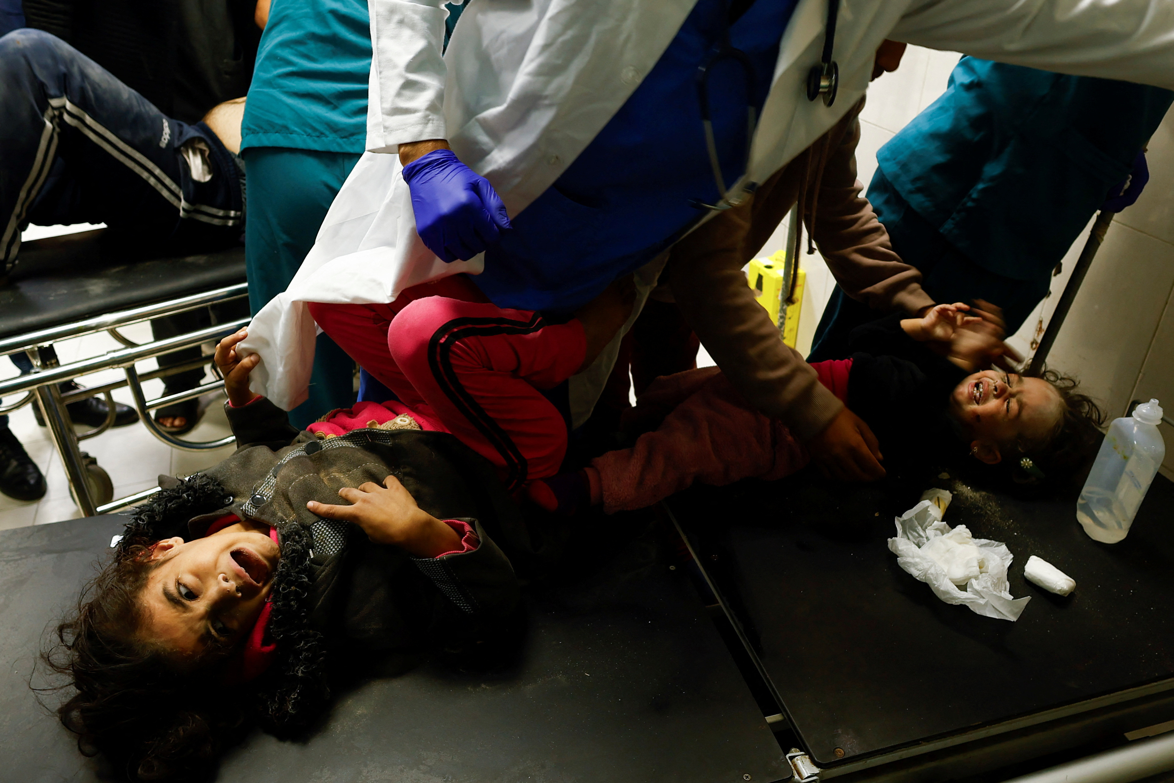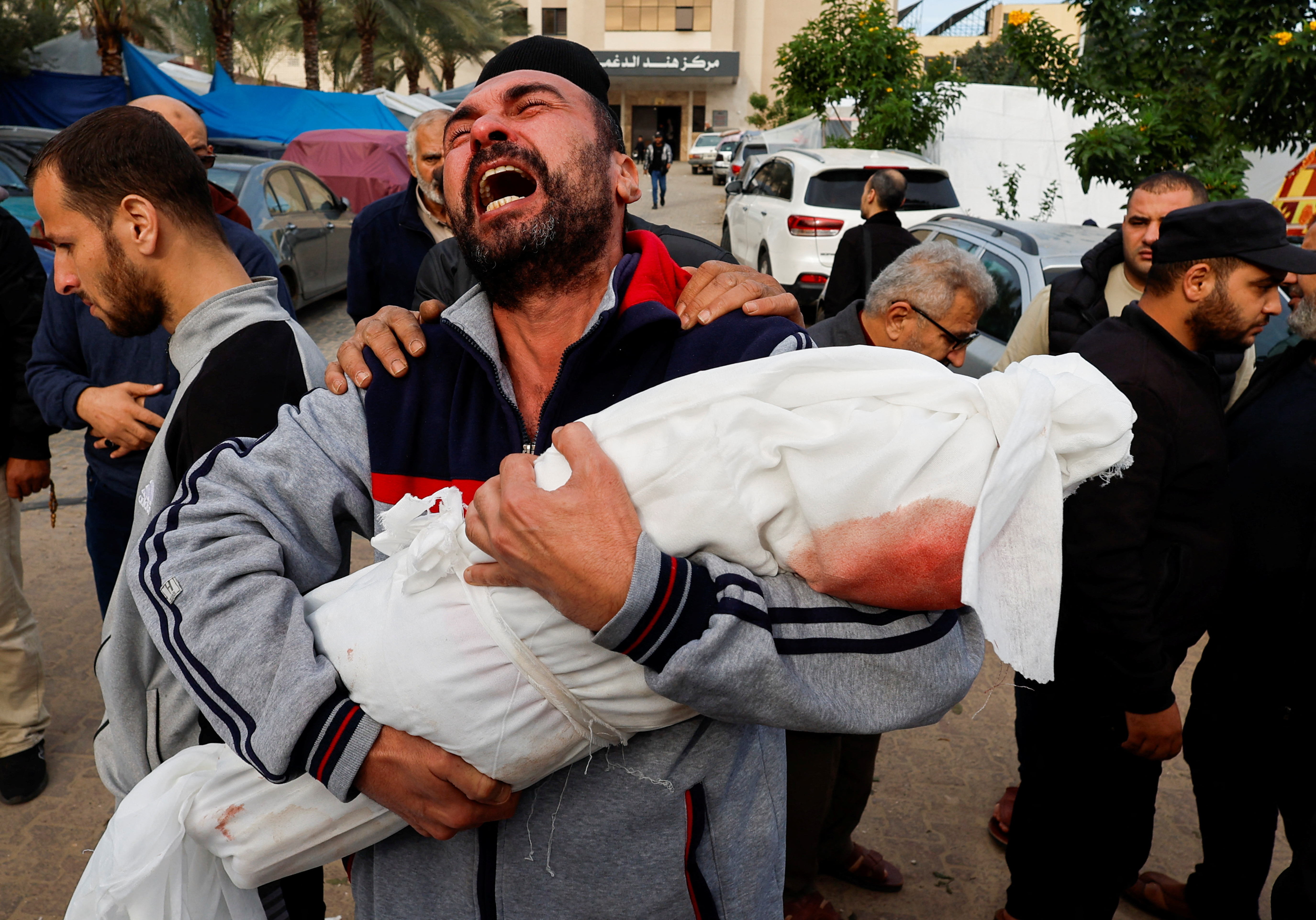 一名巴勒斯坦男子在加沙南部汗尤尼斯的纳赛尔医院携带他侄女哈南·卡卢卜的尸体时表现出悲痛,她在2023年11月22日被以色列空袭击毙。路透社/穆罕默德·塞勒姆/文件照片