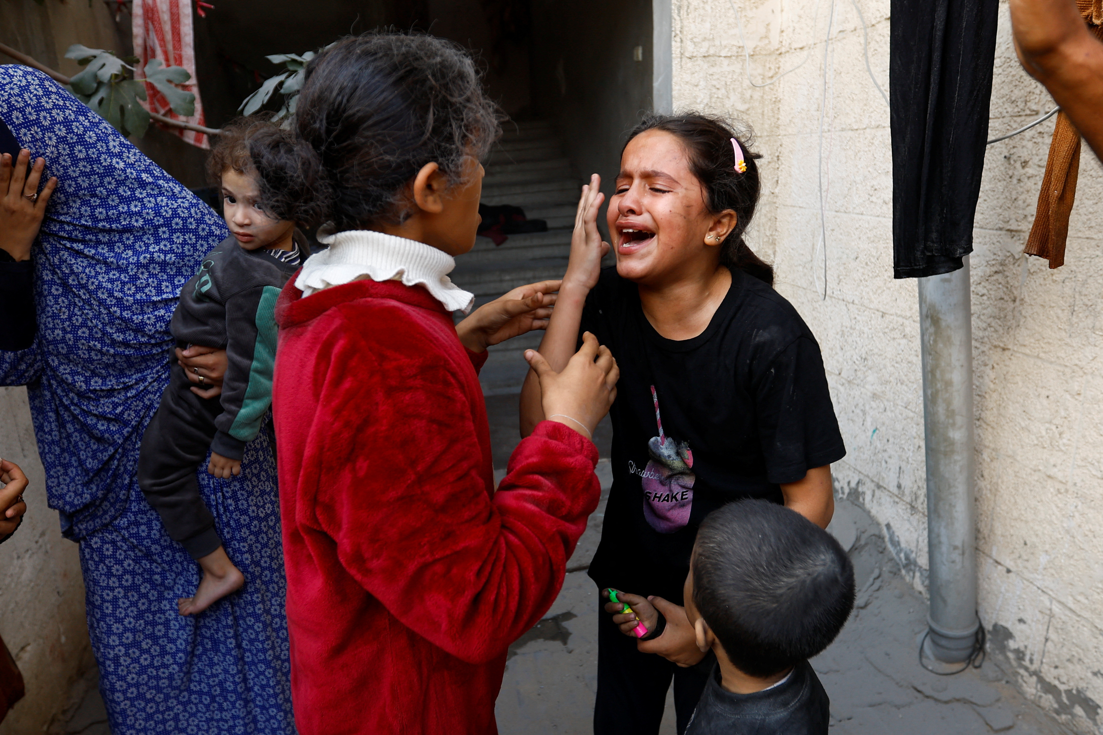 巴勒斯坦儿童在以色列对加沙南部汗尤尼斯的一所房屋发动袭击后做出反应,这是以色列和巴勒斯坦伊斯兰组织哈马斯之间持续冲突的一部分,时间为2023年11月18日。路透社/Ibraheem Abu Mustafa/文件照片