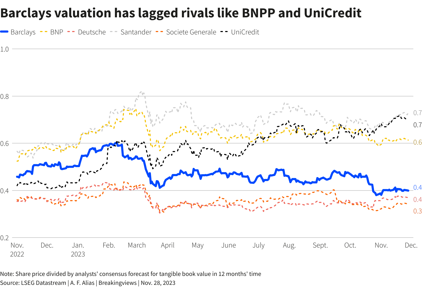伦敦,11月28日(路透社Breakingviews)- 巴克莱银行正在寻找估值的解决方案。首席执行官C. S. Venkatakrishnan和英国这家银行的同事们已经探讨过筹集资金以资助财富或资产管理领域的并购交易;将投资银行的风险加权资产缩减25%;以及一系列较轻微的投资银行调整。如果他们选择后者,这将无法改善目前仅为有形账面价值的0.4倍的估值。