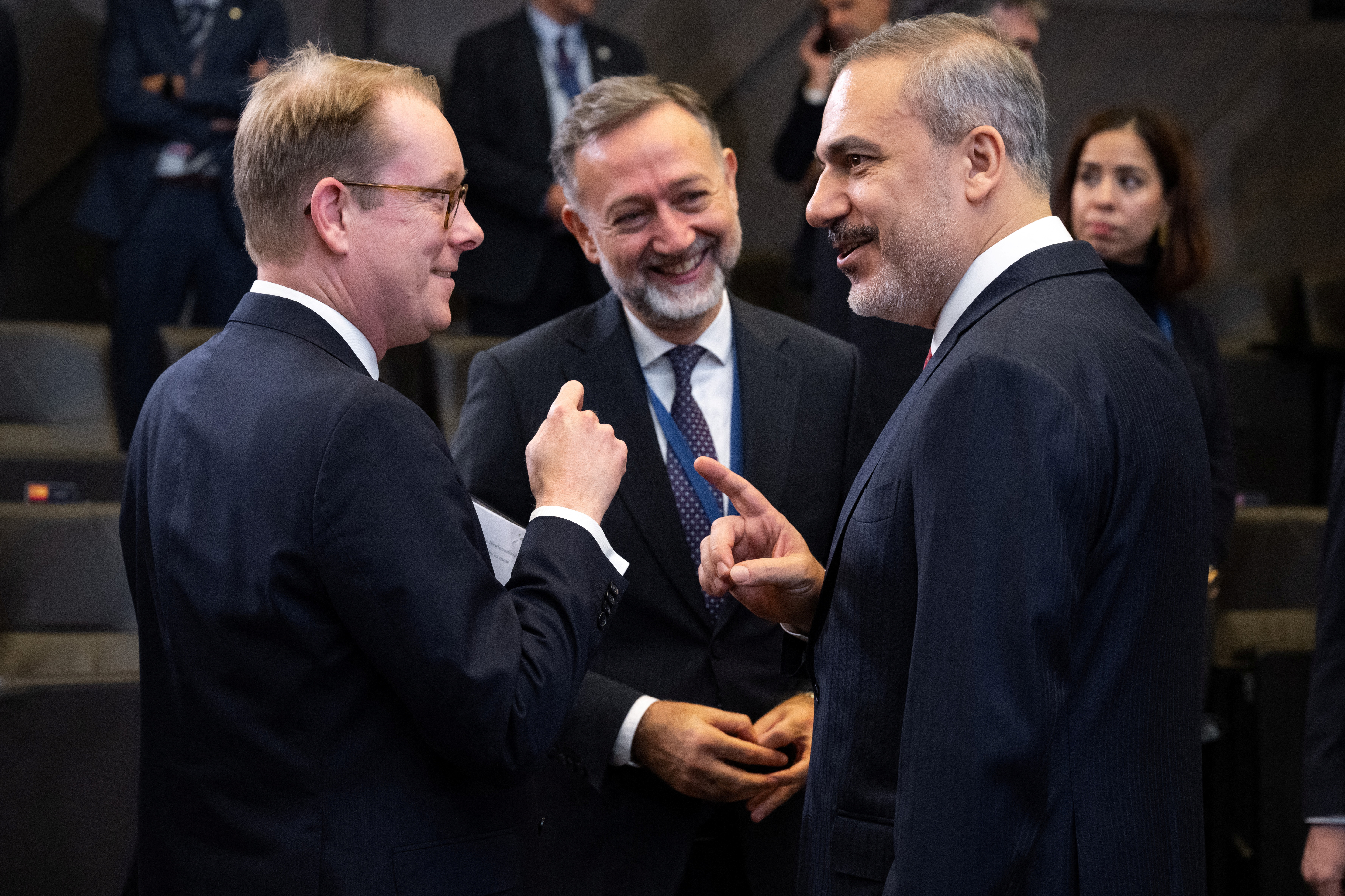 土耳其外长哈坎·菲丹与瑞典外长托比亚斯·比尔斯特罗姆在比利时布鲁塞尔北约总部举行的外长会议前进行了会谈,时间为2023年11月28日。SAUL LOEB/路透社/档案照片