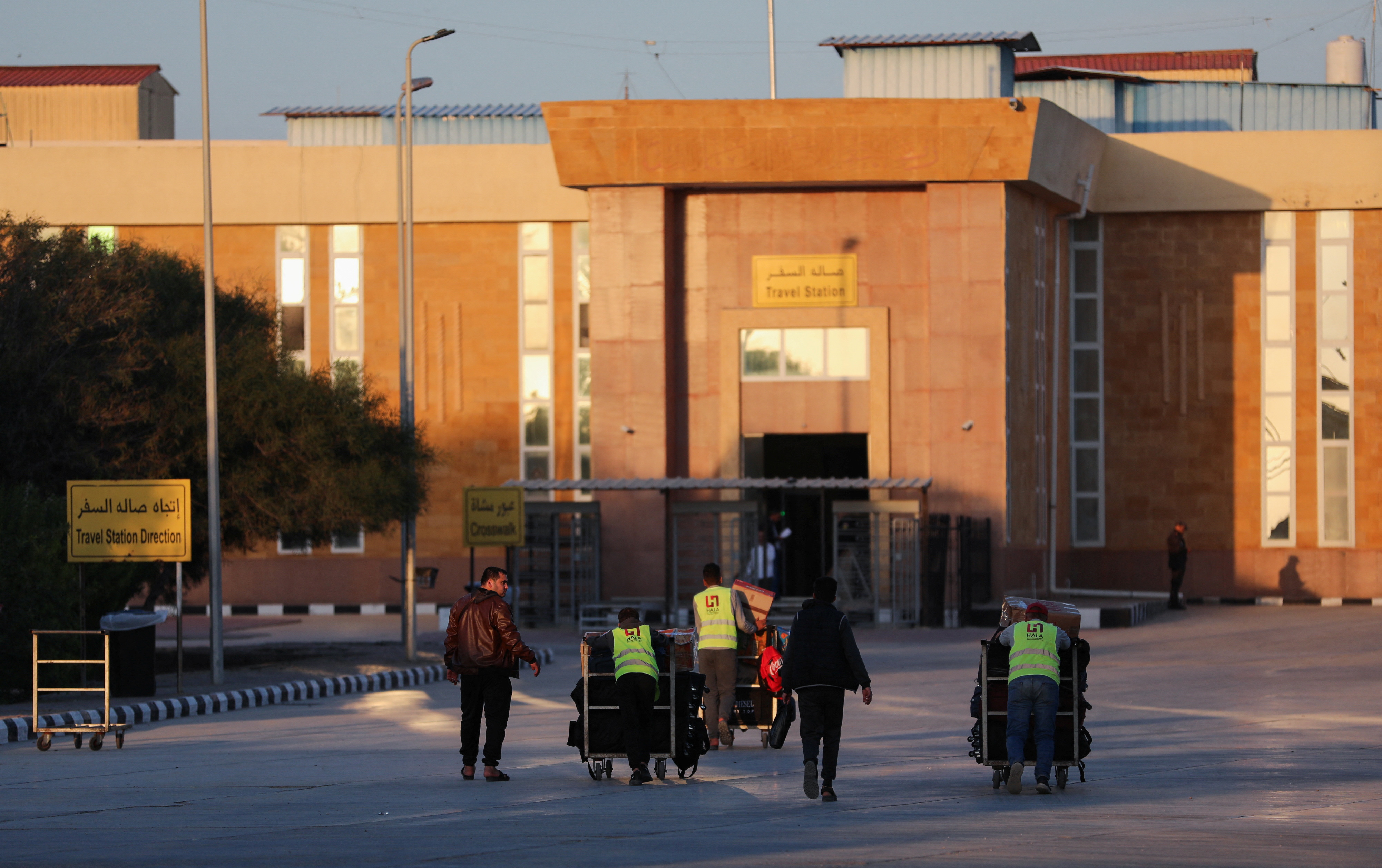 在埃及和加沙之间的拉法赫口岸,装满行李的黄色出租车车顶和行李箱上堆满了手提箱和纸箱,无法关闭。