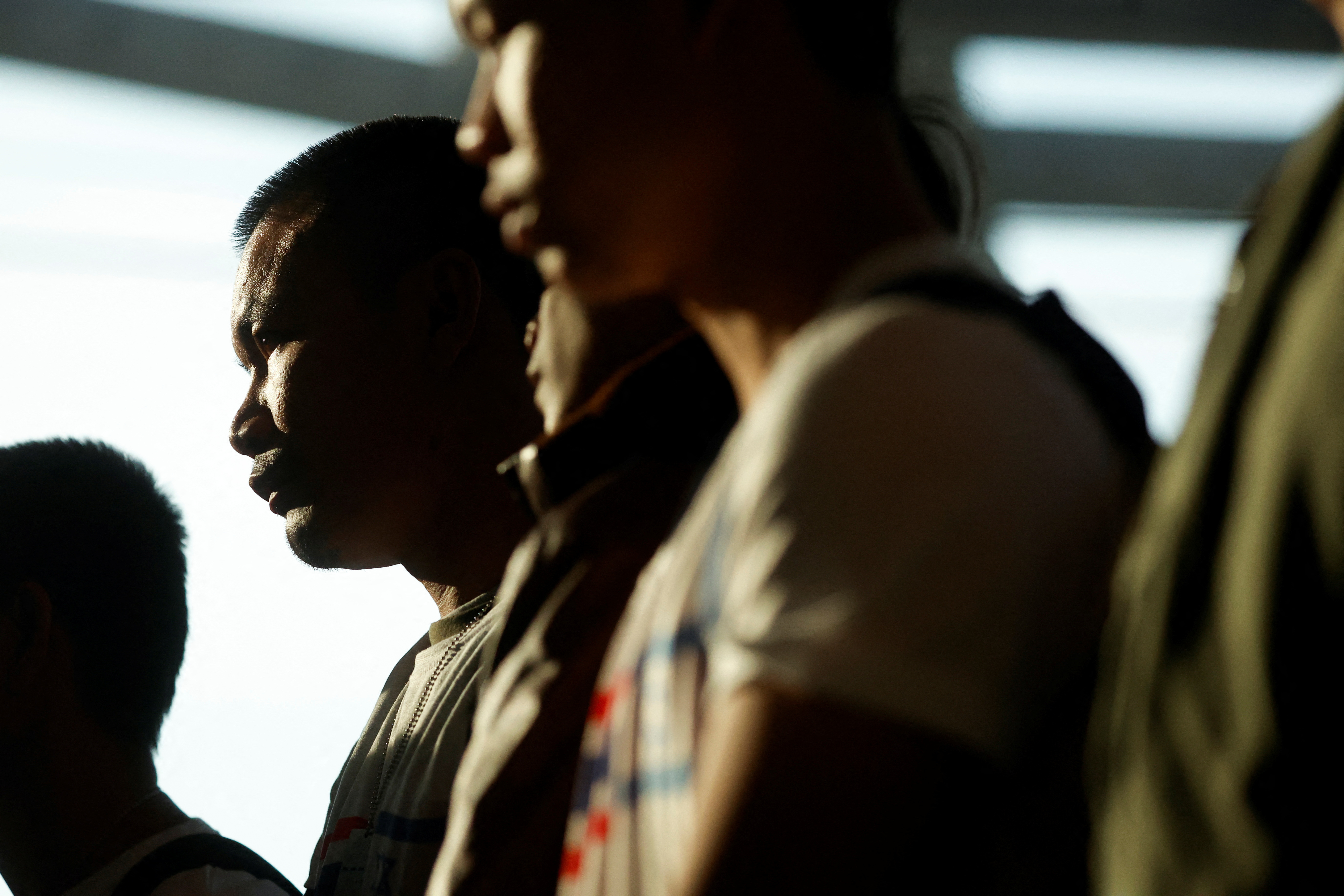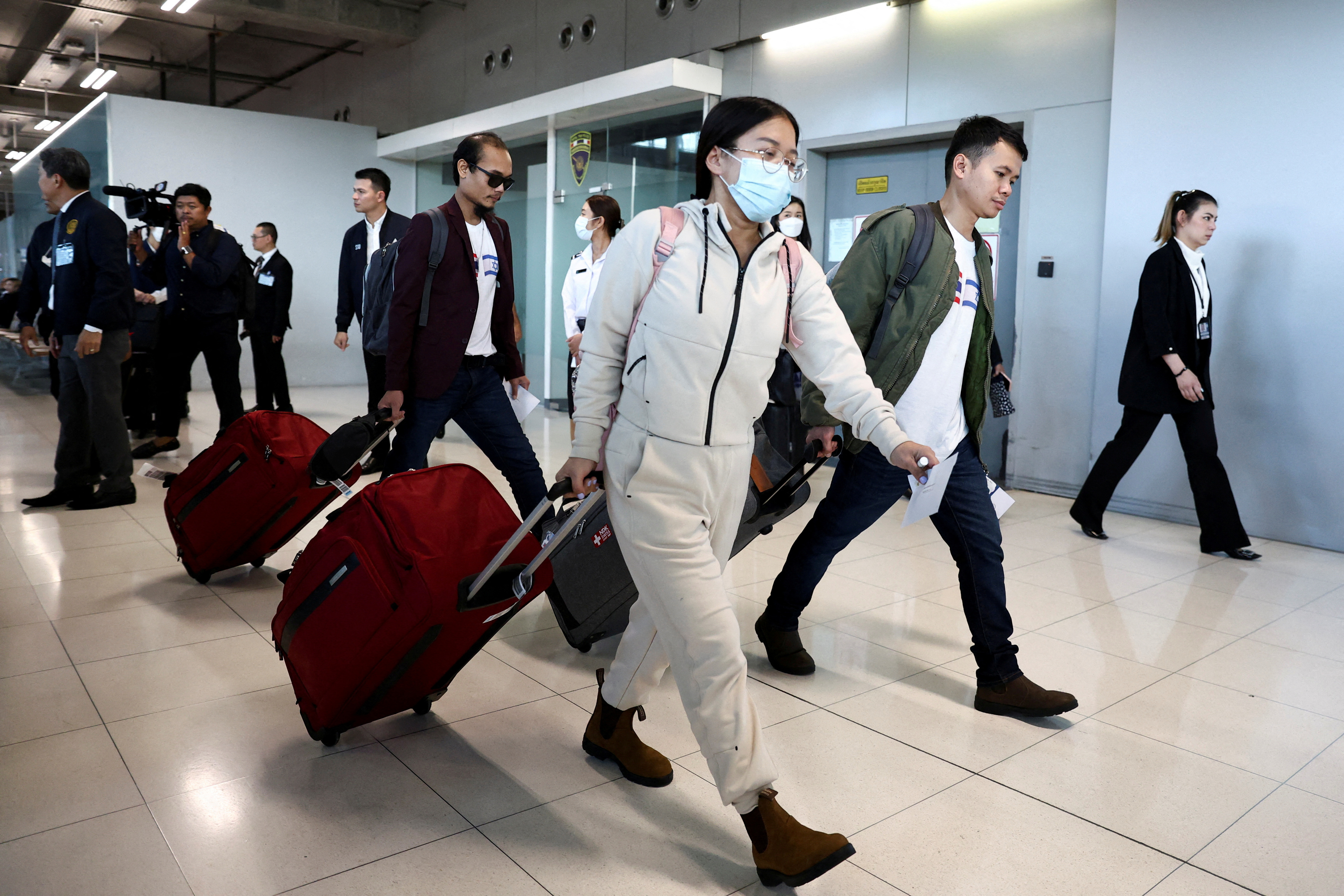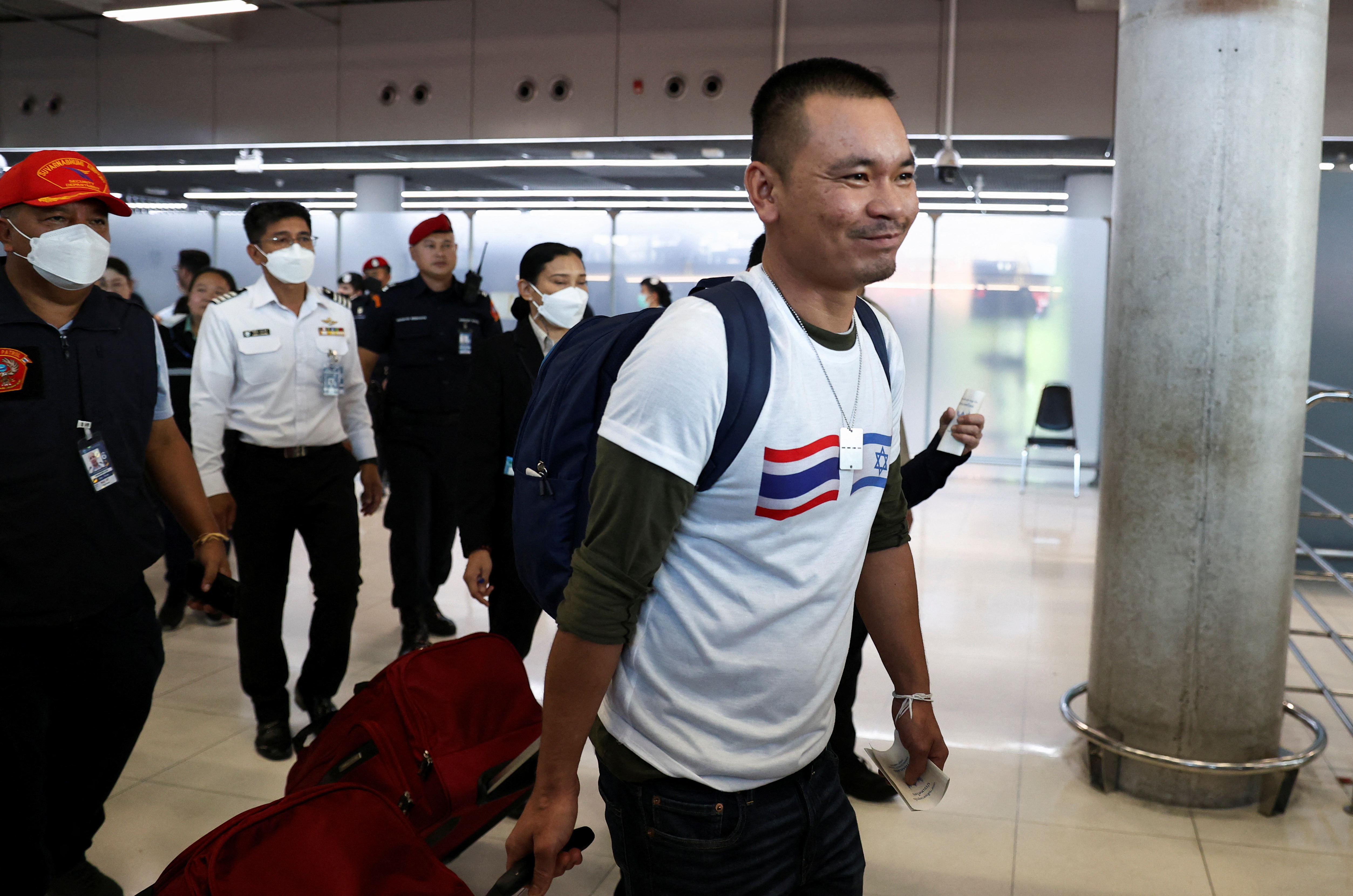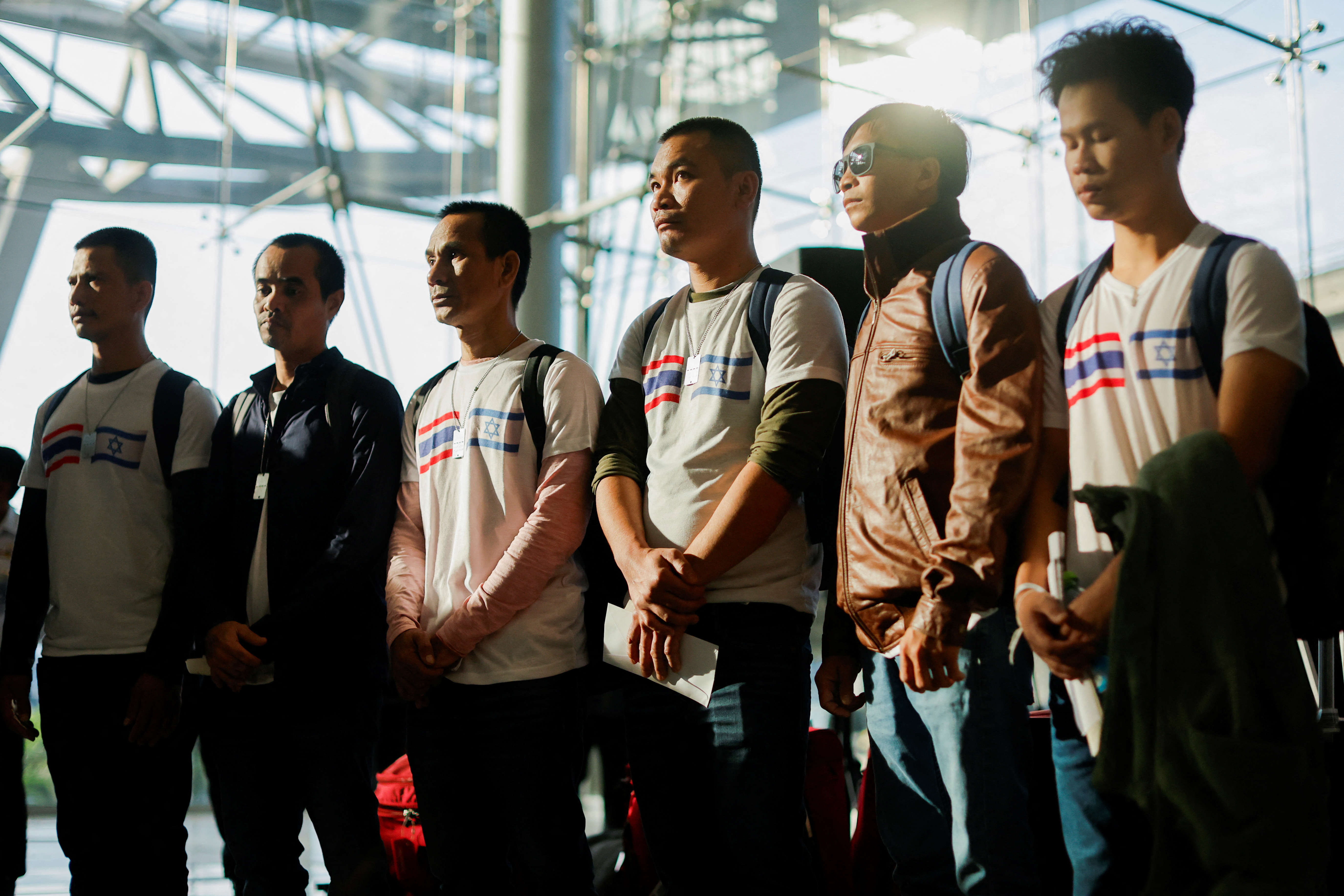 归国者们站在一排,有些人穿着印有泰国和以色列国旗的衬衫,保持镇静。