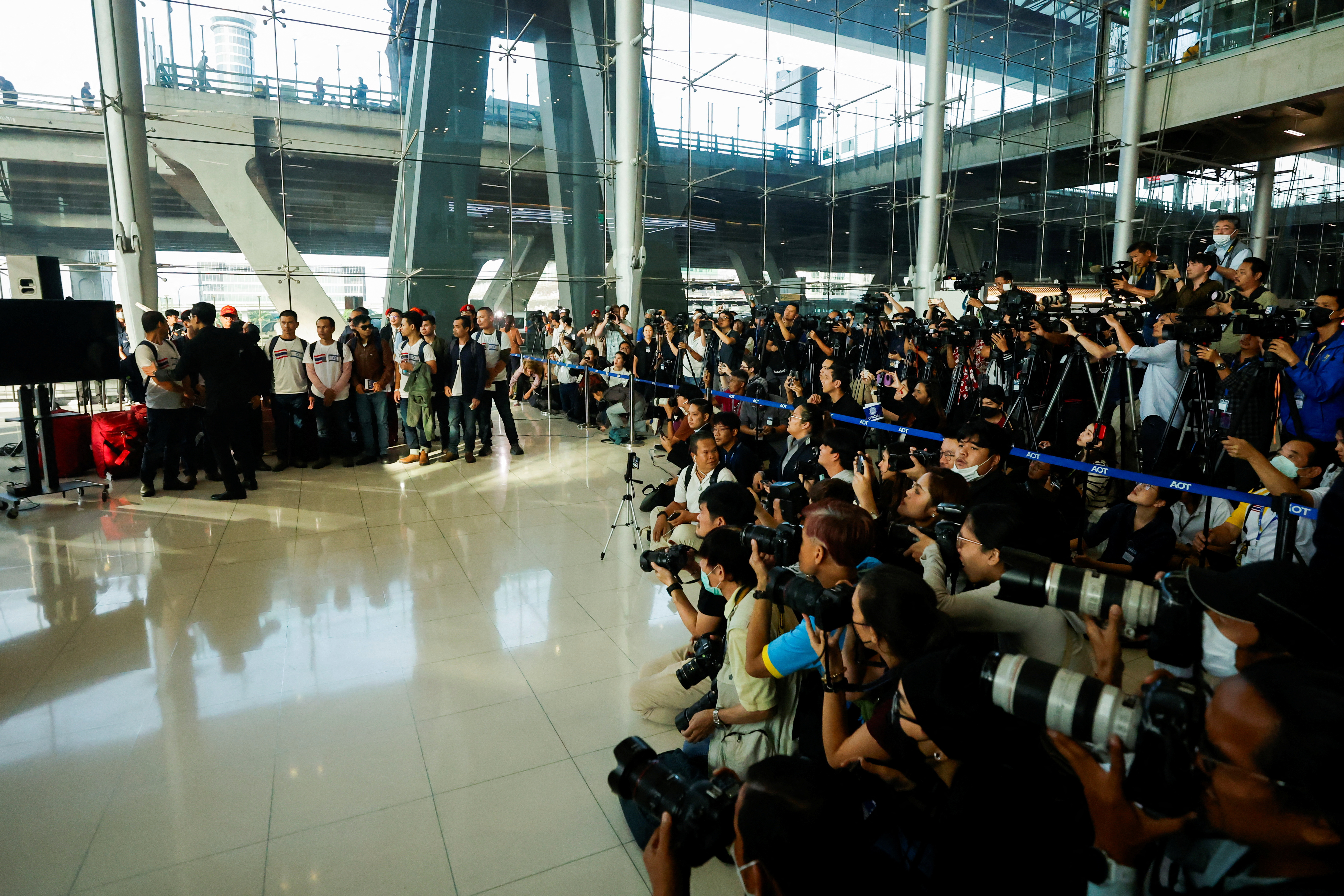 “所有泰国人都为你们担心,”总理Srettha Thavisin通过视频电话对回国者说,他们聚集在曼谷素万那普机场举行新闻发布会。