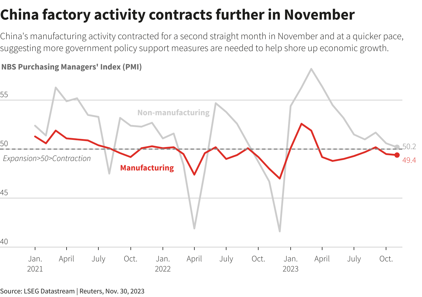 北京,11月30日 (路透社) - 中国制造业活动在11月连续第二个月收缩,且速度加快,这表明需要更多刺激措施来支撑经济增长,并恢复当局能够有效支持工业的信心。