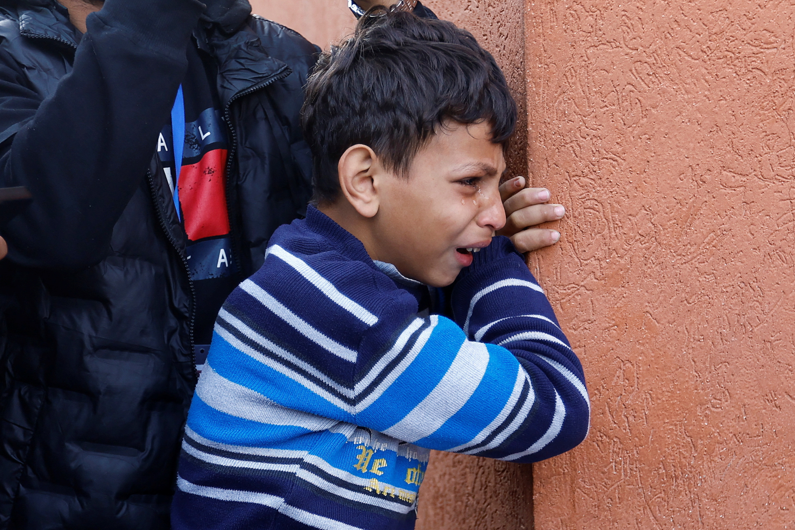 一名巴勒斯坦男孩在以色列袭击中丧生的巴勒斯坦人的葬礼上表达了自己的情绪,这是以色列和巴勒斯坦伊斯兰组织哈马斯之间持续冲突的一部分,图片拍摄于2023年12月10日,位于加沙地带南部的汗尤尼斯的纳赛尔医院。路透社/伊布拉希姆·阿布·穆斯塔法
