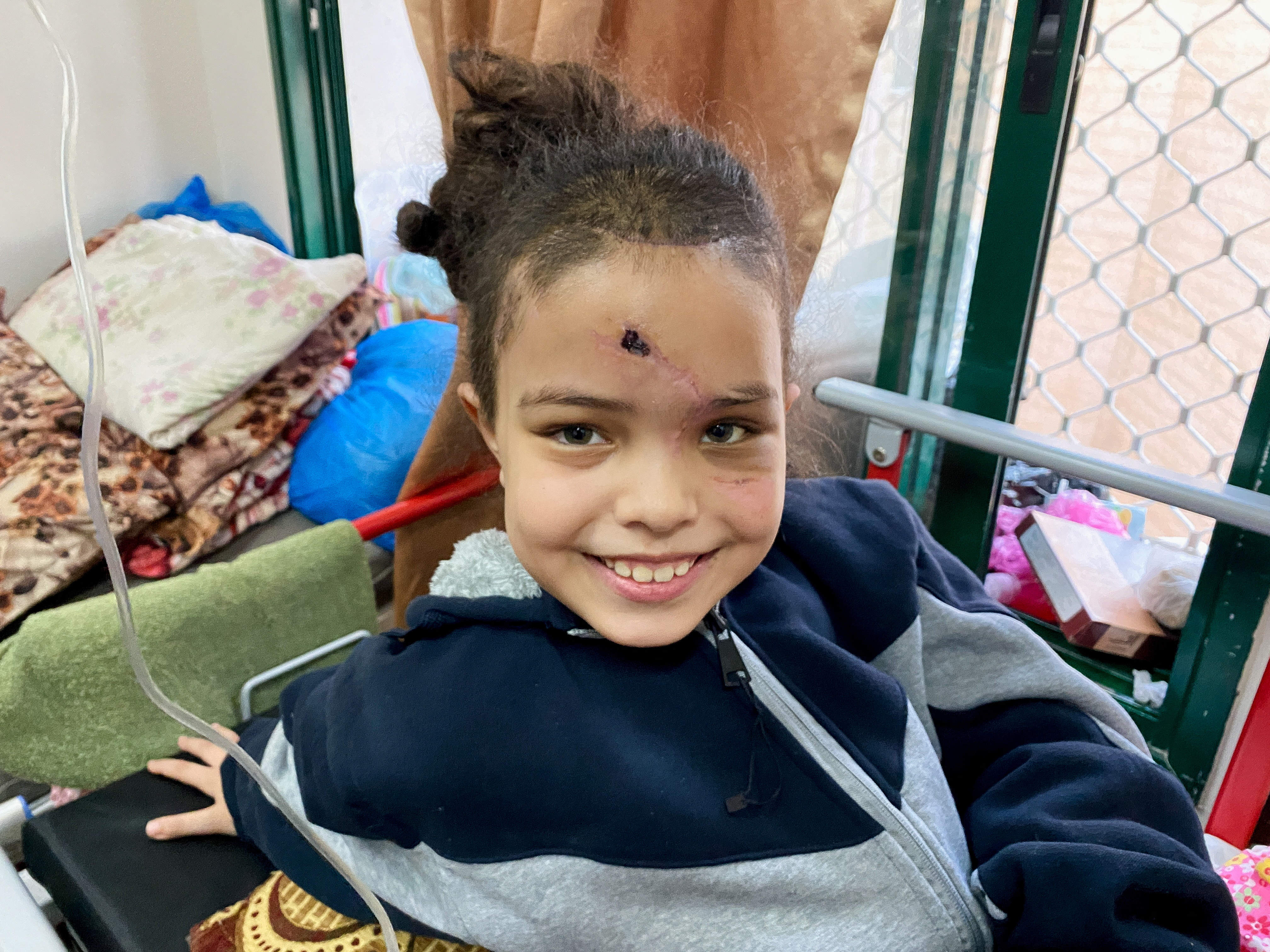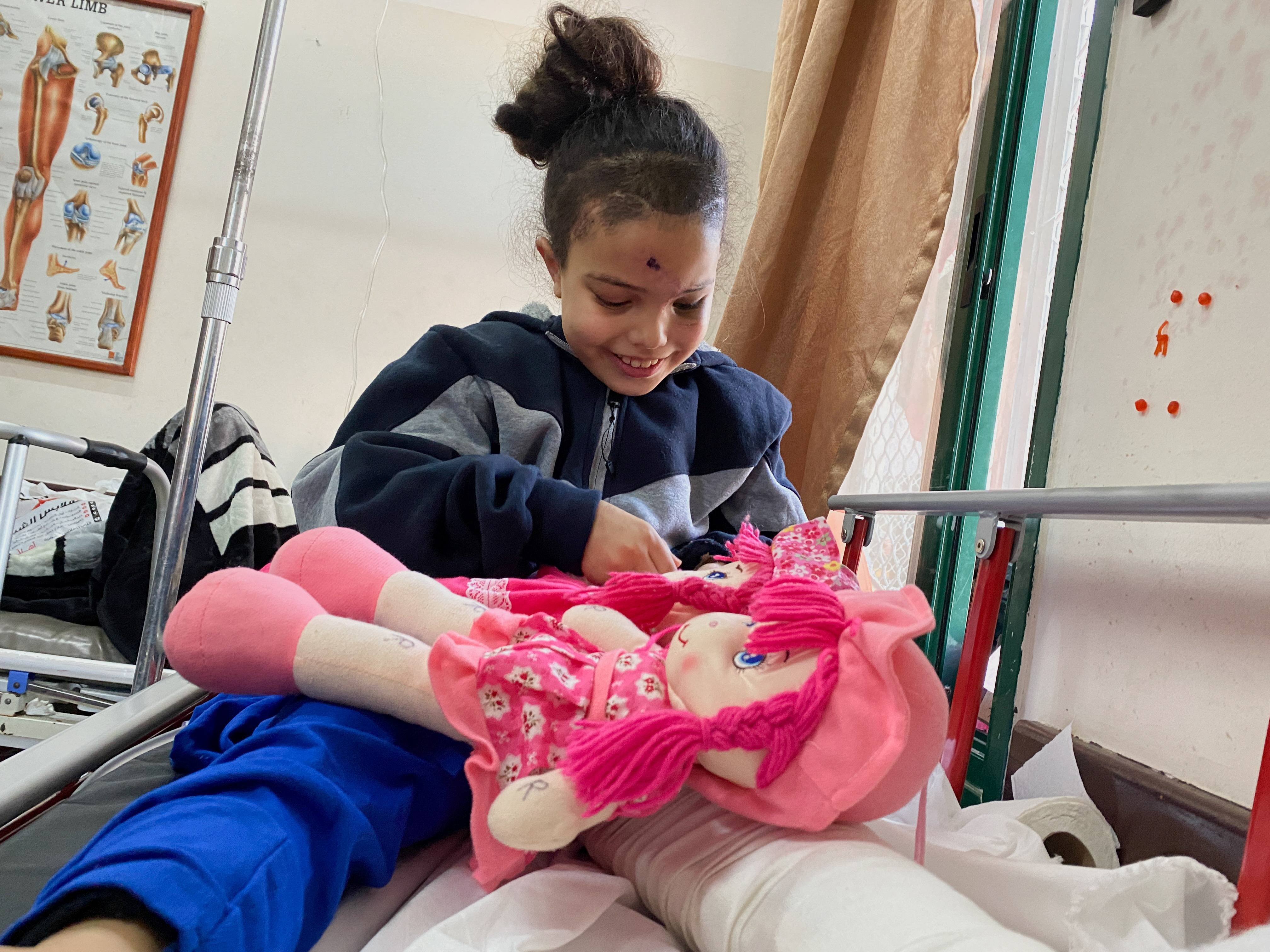 尽管她额头上有一个大疤痕,脸上有细细的伤疤,但拉赞的脸上露出了灿烂的笑容,她玩着两个粉色的布娃娃,像母亲抱着婴儿一样轻声唤着。