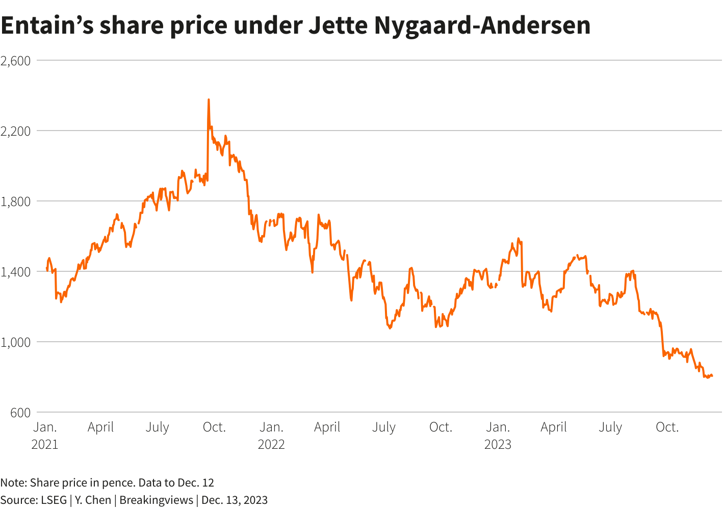 伦敦,12月13日(路透社Breakingviews) - Entain的(ENT.L)首席执行官Jette Nygaard-Andersen最终离开了,她在任期内导致该公司市值下跌35%。在她任内,这家价值50亿美元的英国上市体育博彩集团拒绝了来自MGM度假村国际(MGM.N)的要约,并开始了债务资助的并购狂潮,招致了像Eminence Capital的Ricky Sandler这样的激进投资者的愤怒。