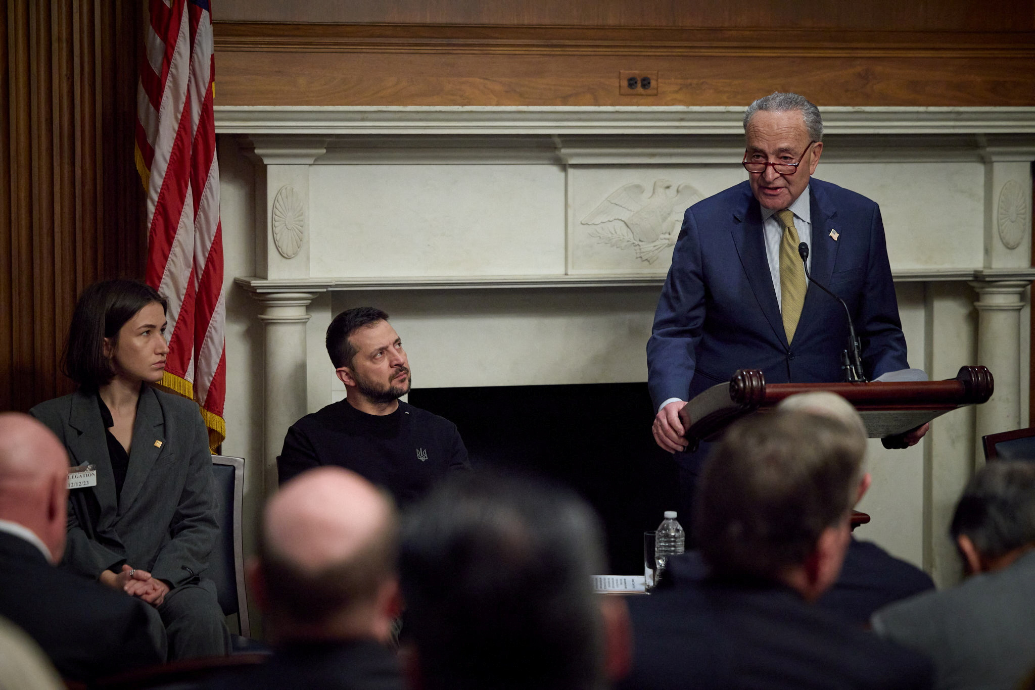 身着黑色衬衫和橄榄色军裤的泽连斯基进入国会与美国参议员进行了一次闭门会议,得到了持续的掌声,国会的民主党和共和党领袖们承诺支持他。