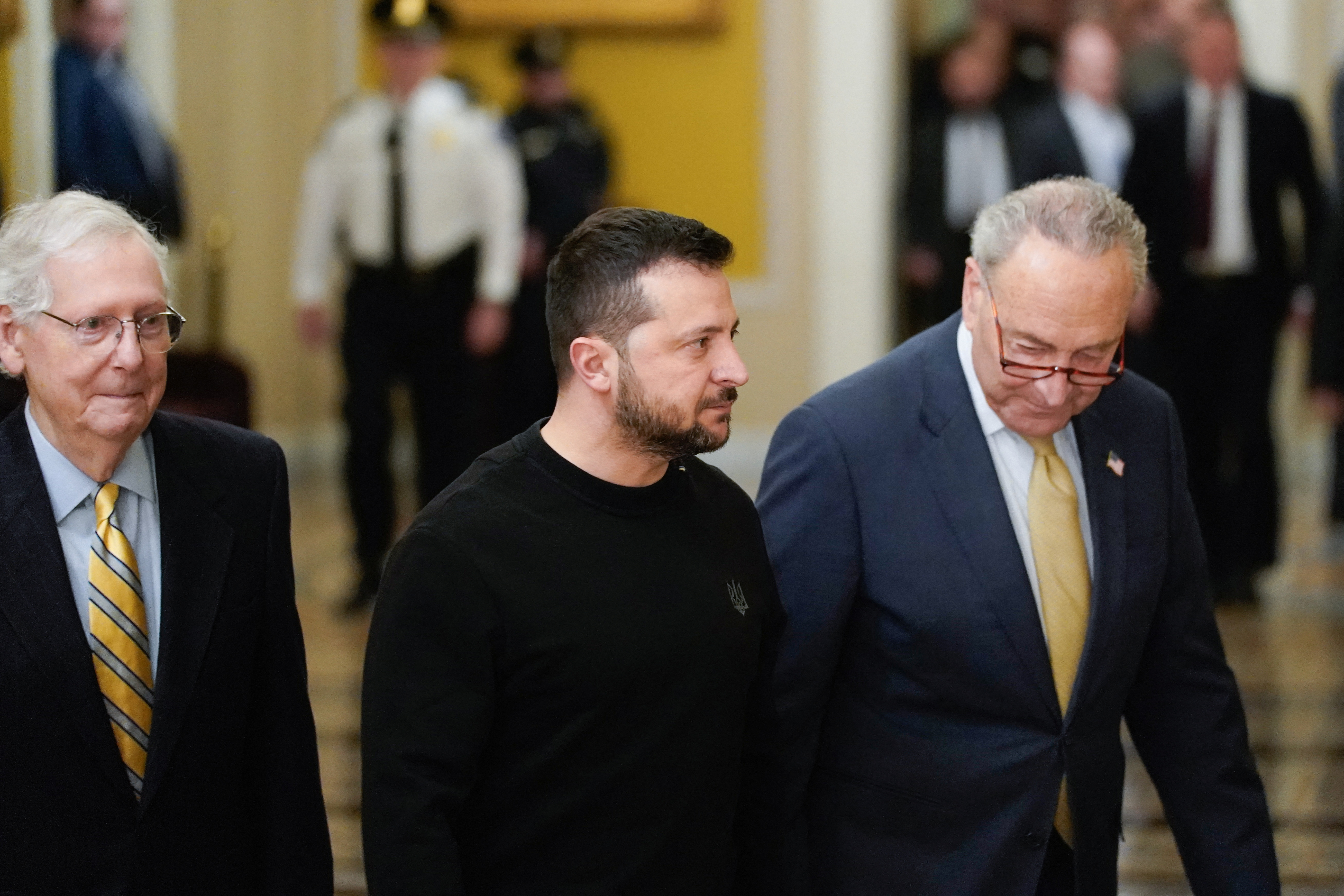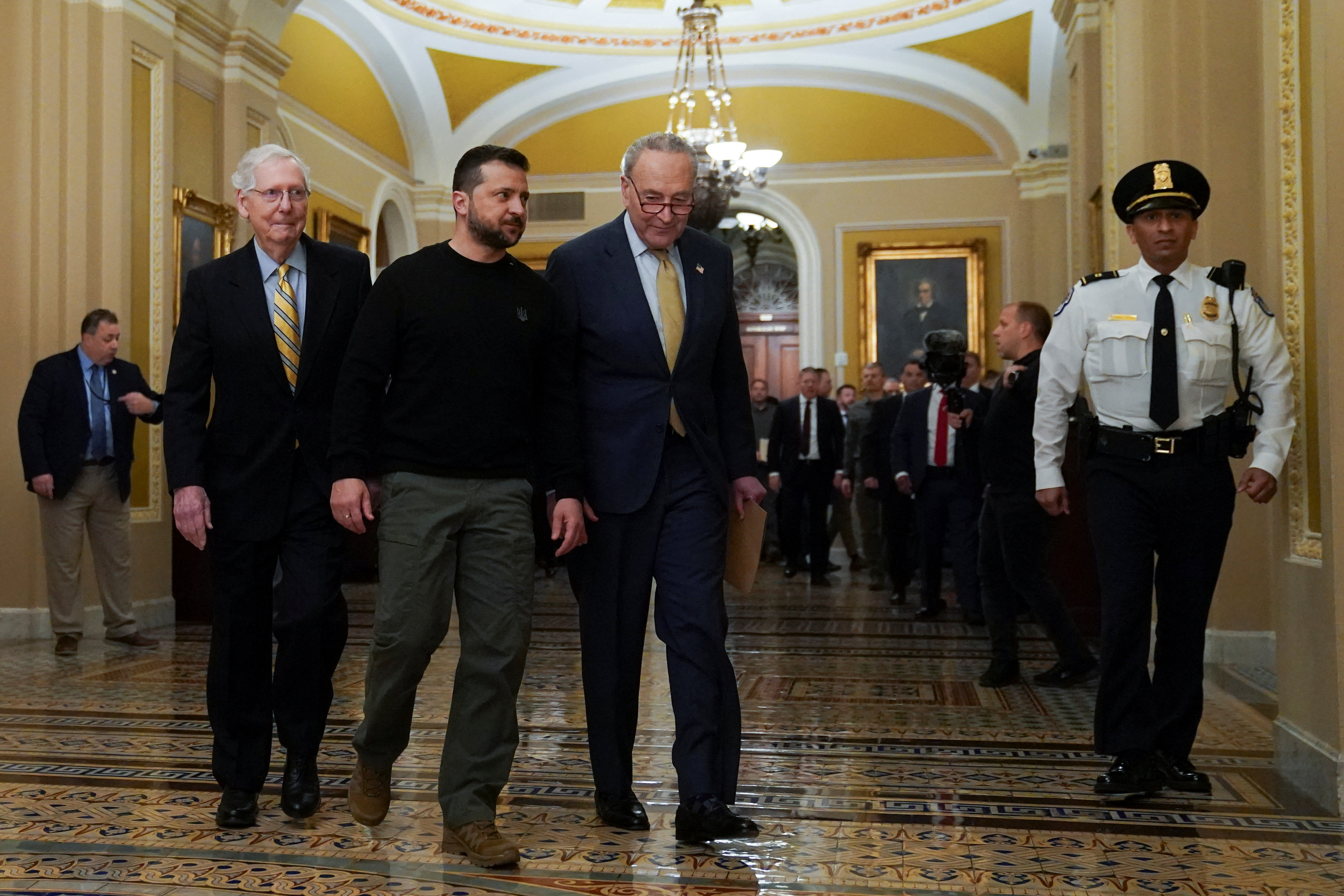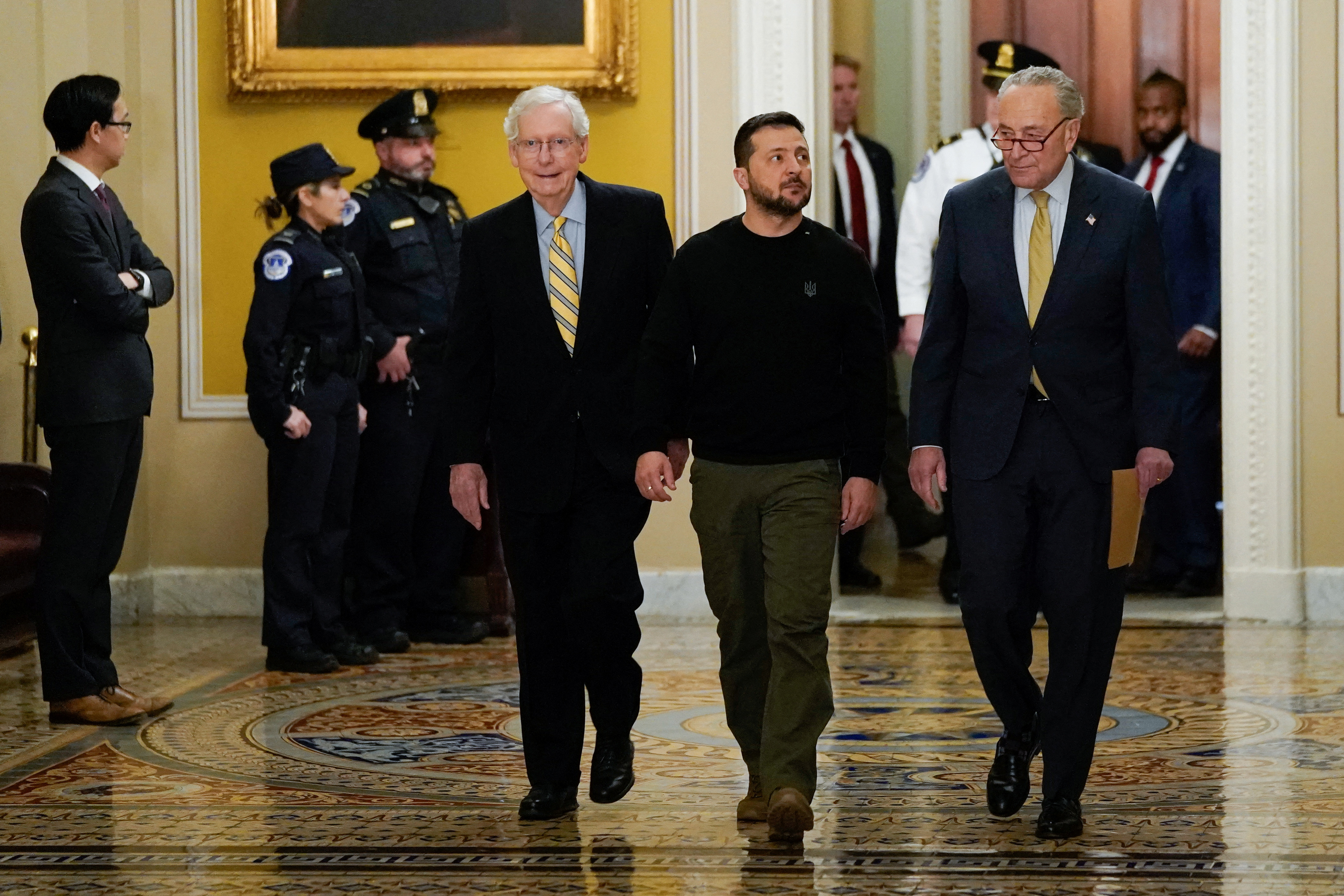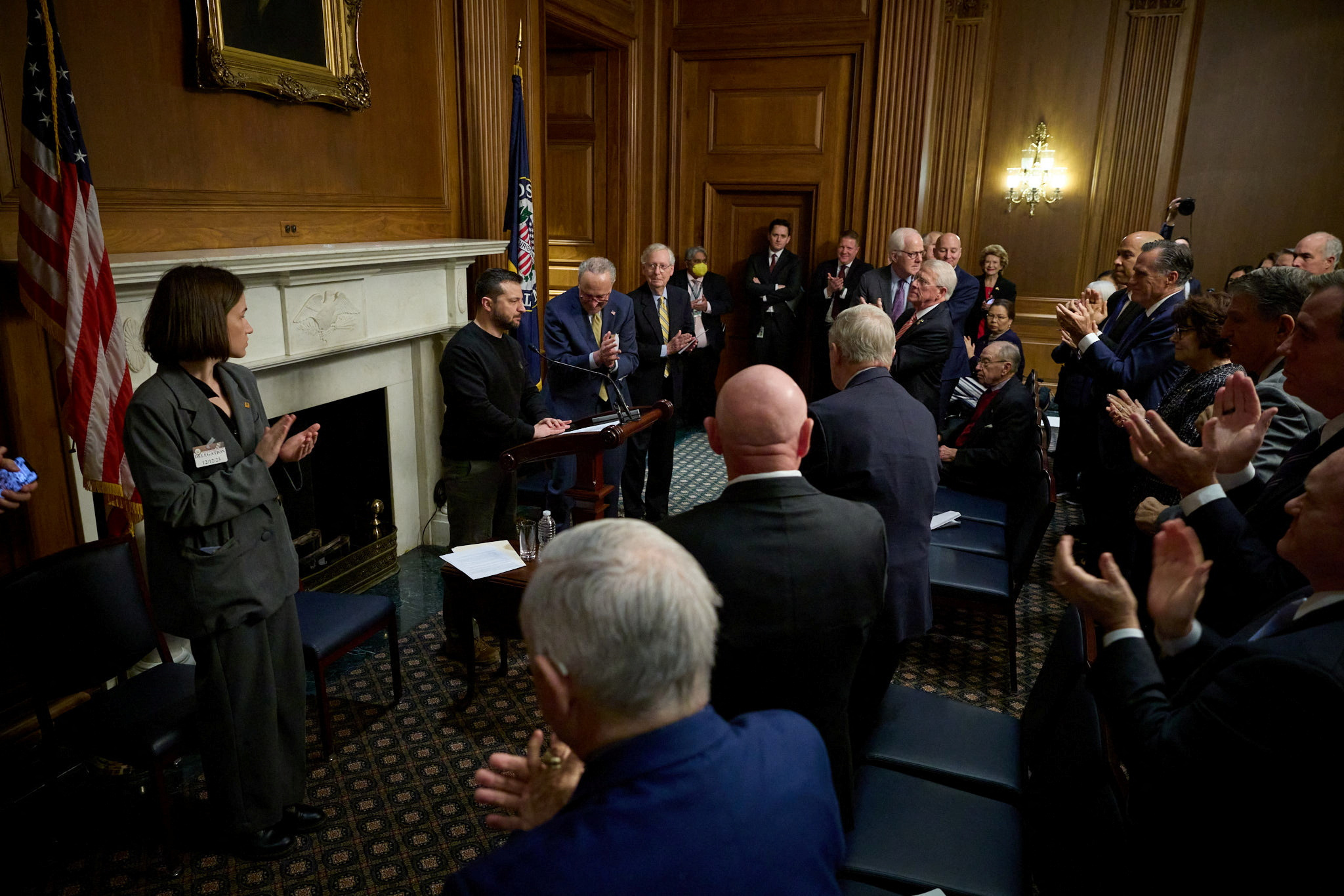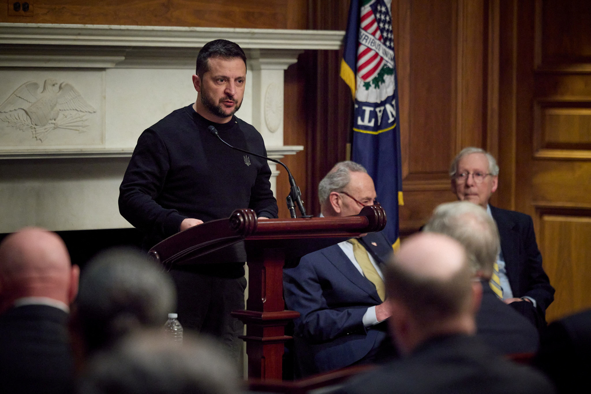 乌克兰总统沃洛迪米尔·泽连斯基在华盛顿国会山向美国参议员发表讲话,2023年12月12日。乌克兰总统新闻办公室/路透社提供