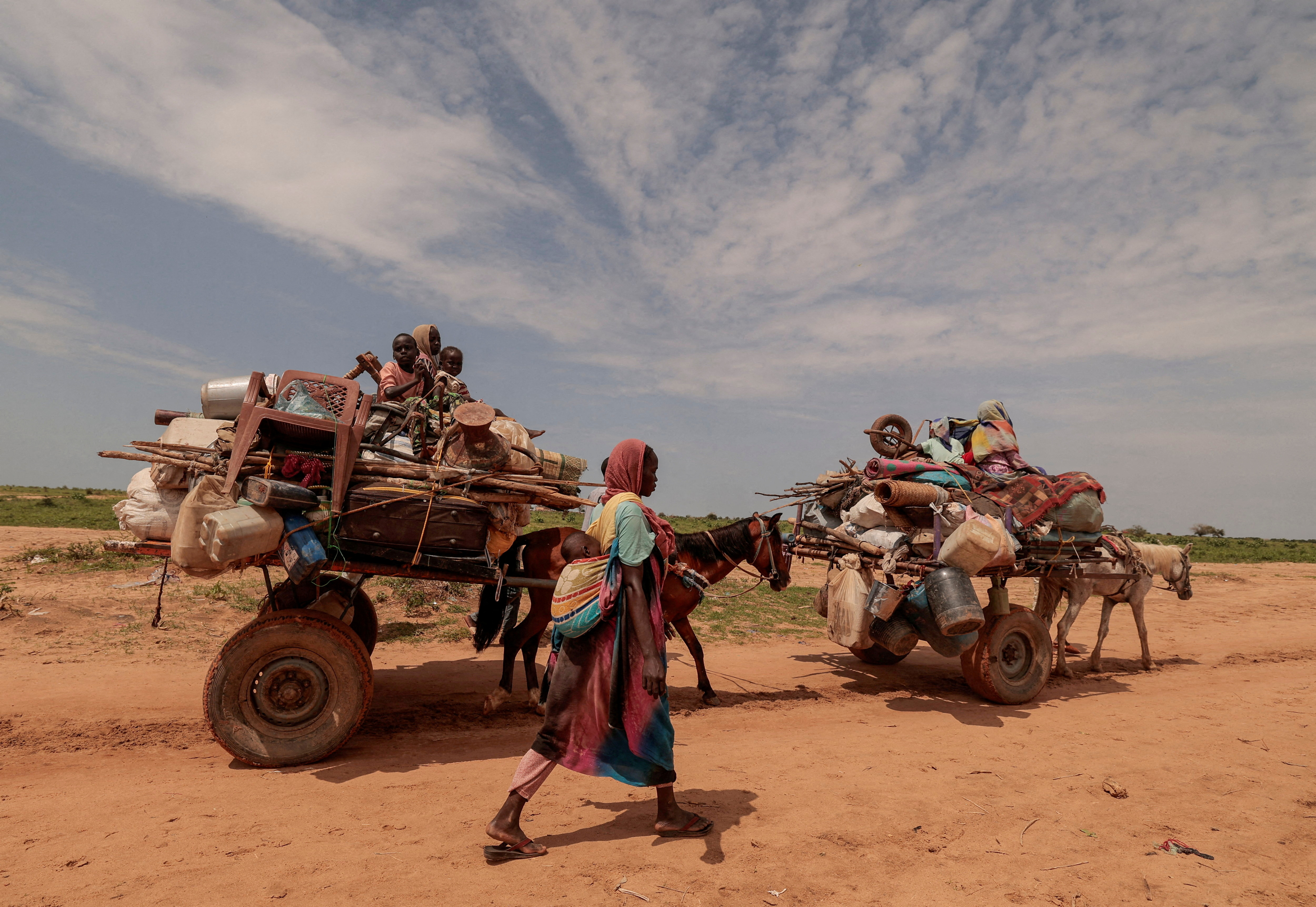 一名苏丹妇女逃离苏丹达尔富尔地区的穆尔内冲突,横穿苏丹和乍得边境时,她走在推着家庭财物的手推车旁,2023年8月2日,乍得阿德雷。路透社/佐赫拉·本塞姆拉/档案照片