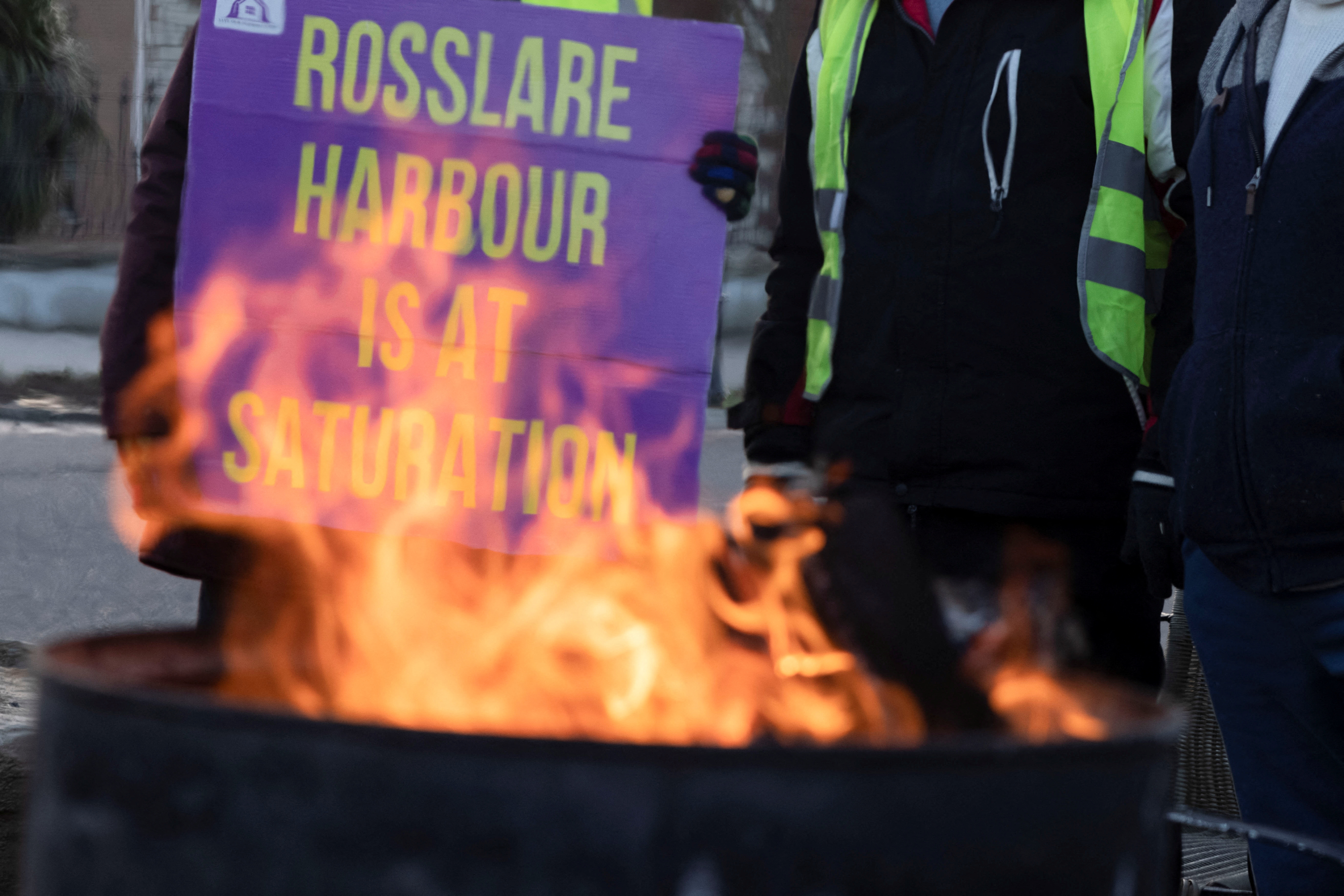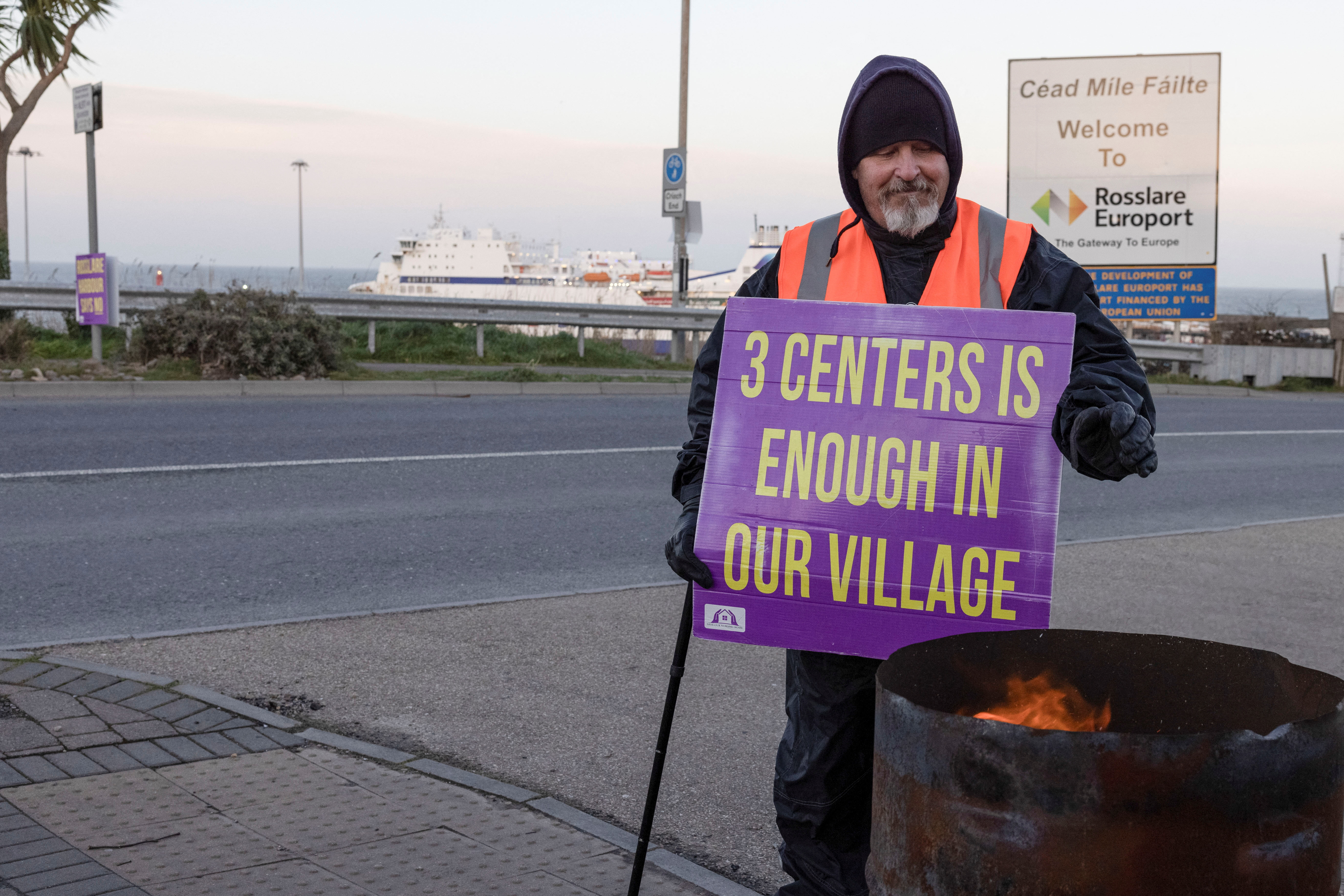 一位居民看着一个旧酒店正在改建成为一个难民住宿中心的建筑工地上燃烧的油桶火,爱尔兰韦克斯福德郡罗斯莱尔港,2023年12月9日。路透社/卡伦·考克斯