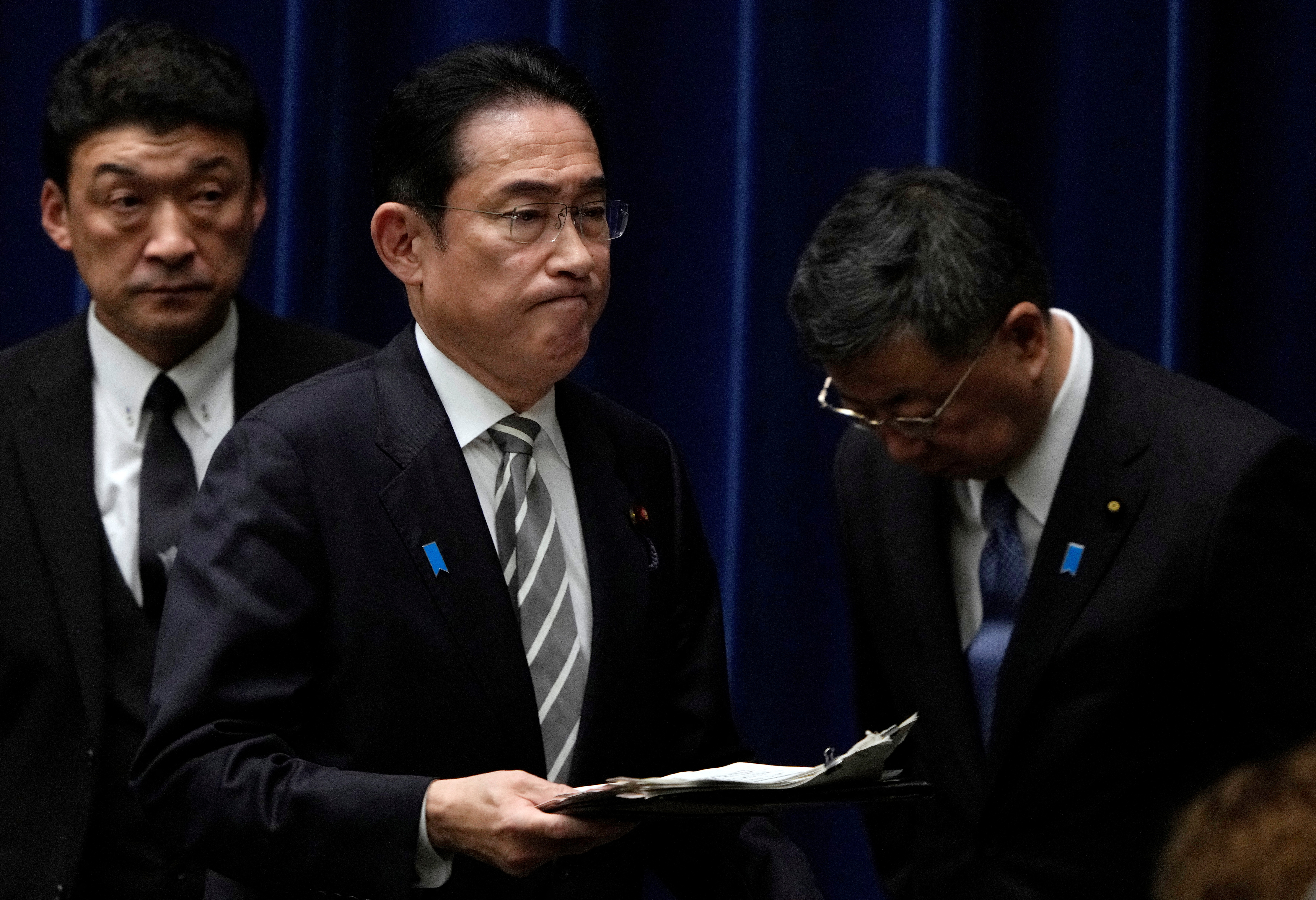 日本首相岸田文雄在东京的首相官邸举行的新闻发布会结束时,走过内阁官房长官松野博一。2023年12月13日,日本首相岸田表示,他将更换几名卷入政治筹款丑闻的部长。 阅读更多
