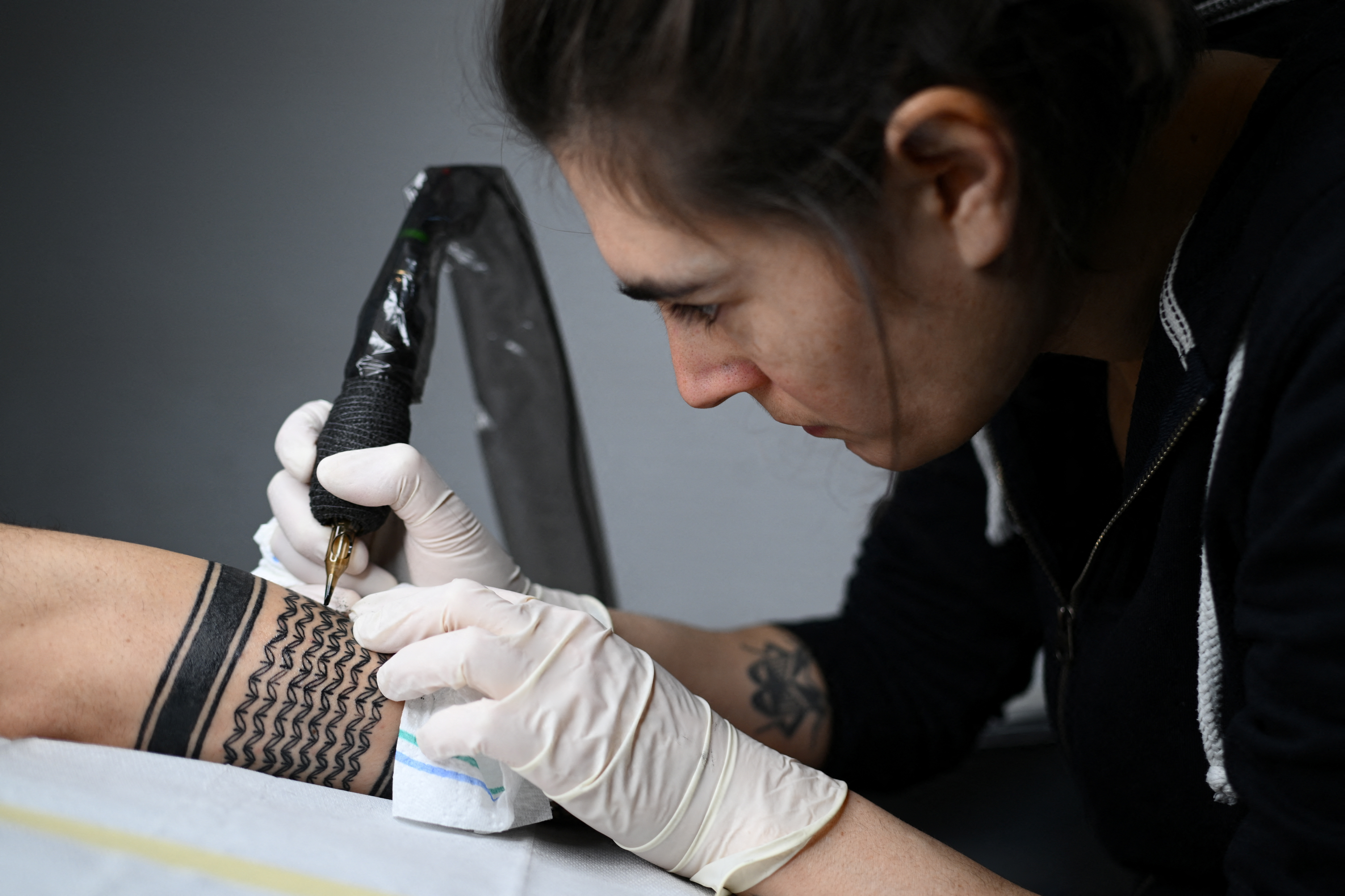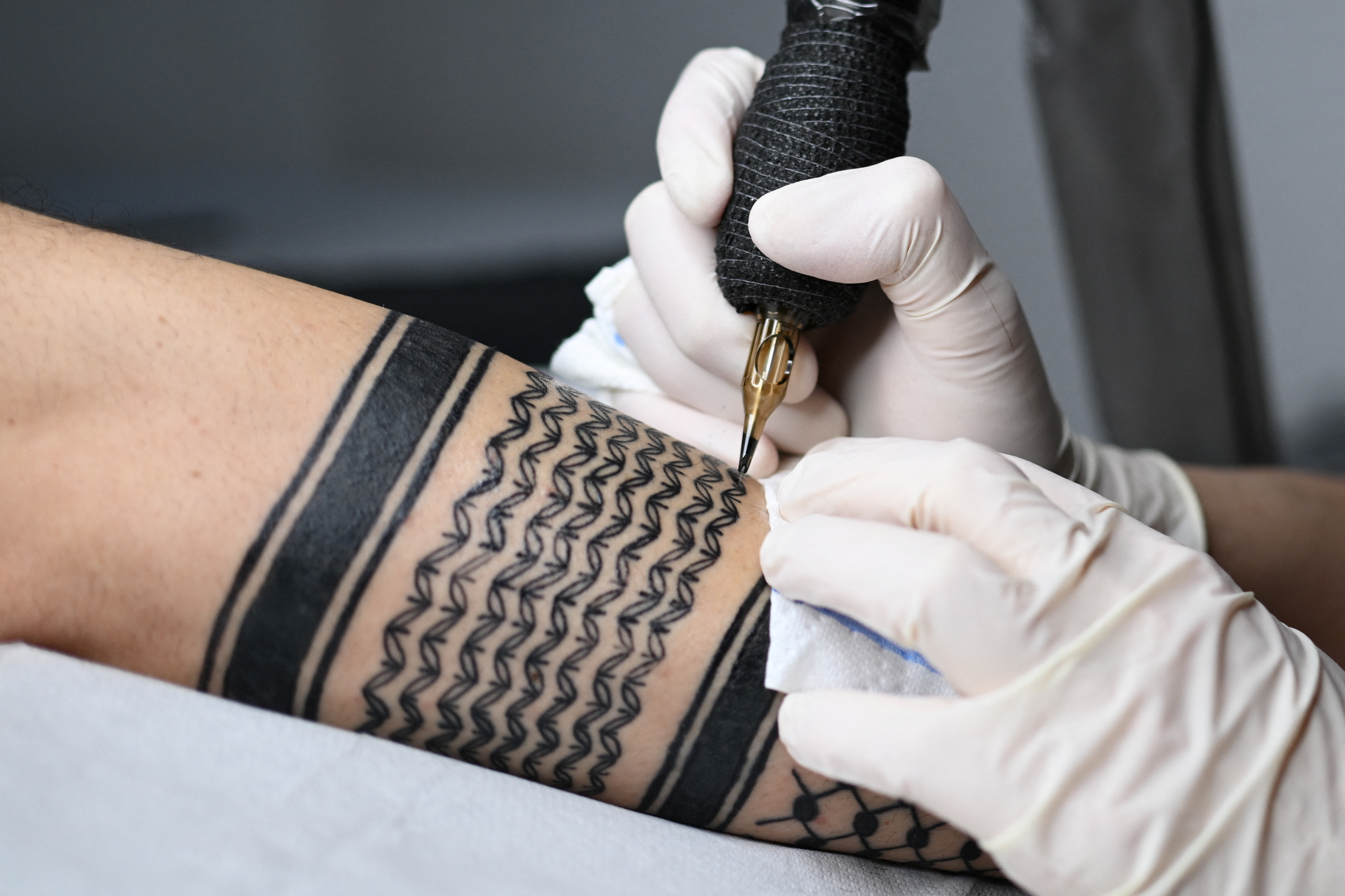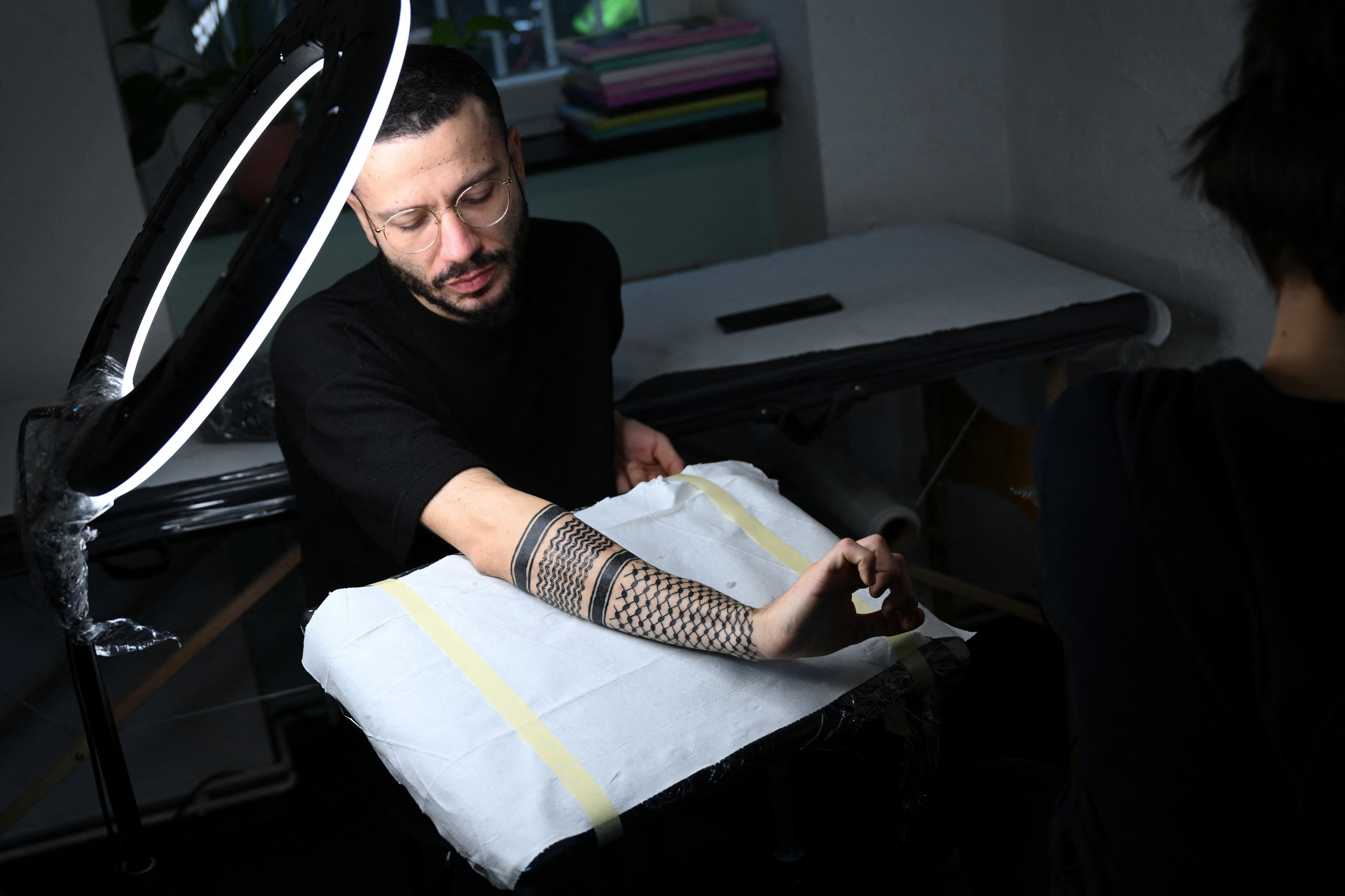 巴勒斯坦叙利亚诗人拉米·阿尔-阿舍克(Ramy Al-Asheq),34岁,看着他的前臂,上面刺有巴勒斯坦围巾的黑白棋盘格纹身,这是由柏林的纹身艺术家塔娜·托尔(Tana Torr)于2023年12月13日完成的。路透社/安妮格雷特·希尔斯(Annegret Hilse)摄