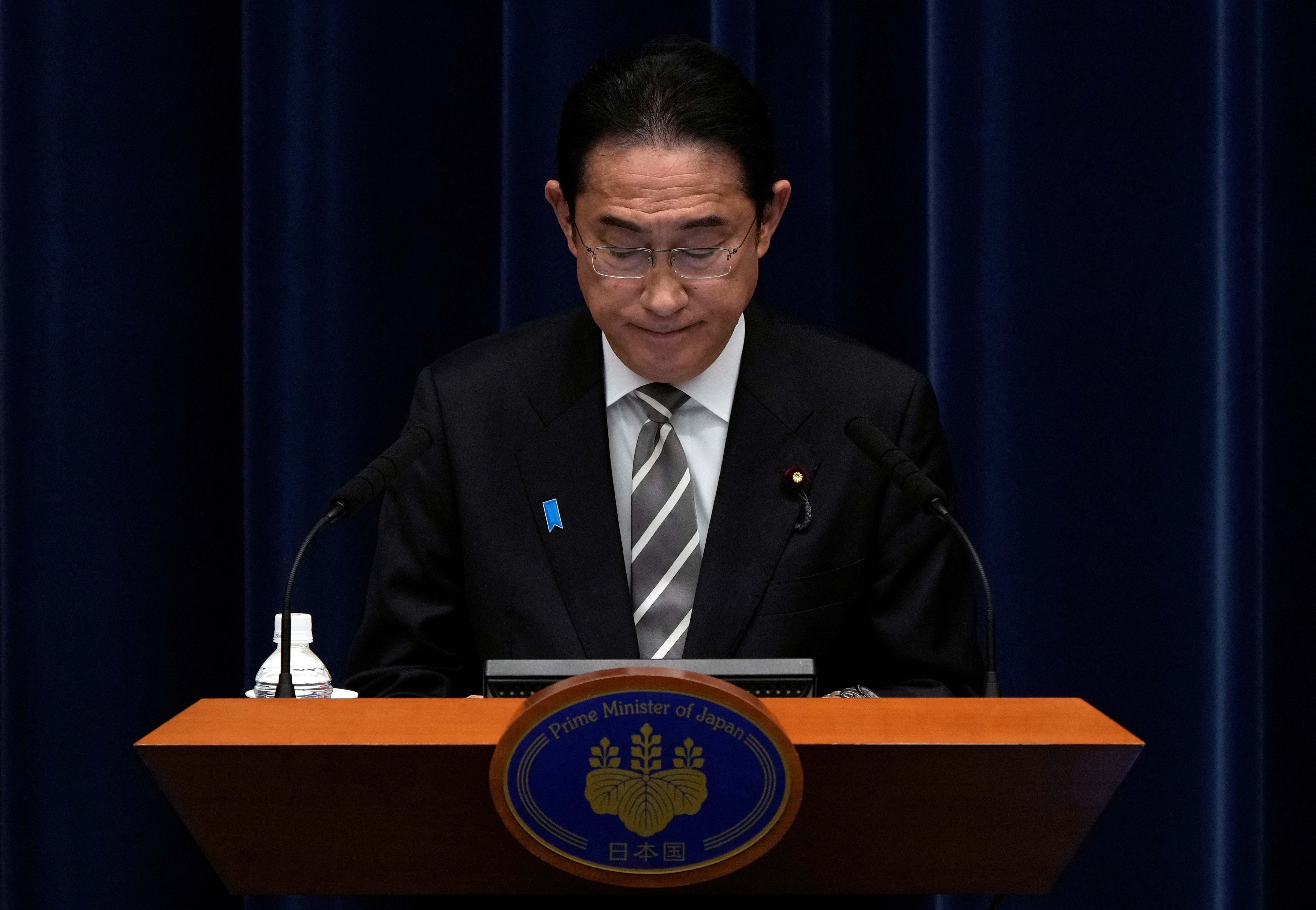 2023年12月13日,日本首相岸田文雄在东京首相官邸举行新闻发布会。岸田首相表示,他将更换数名卷入政治筹款丑闻的部长。 弗朗克·罗比雄/路透社/泳池